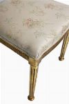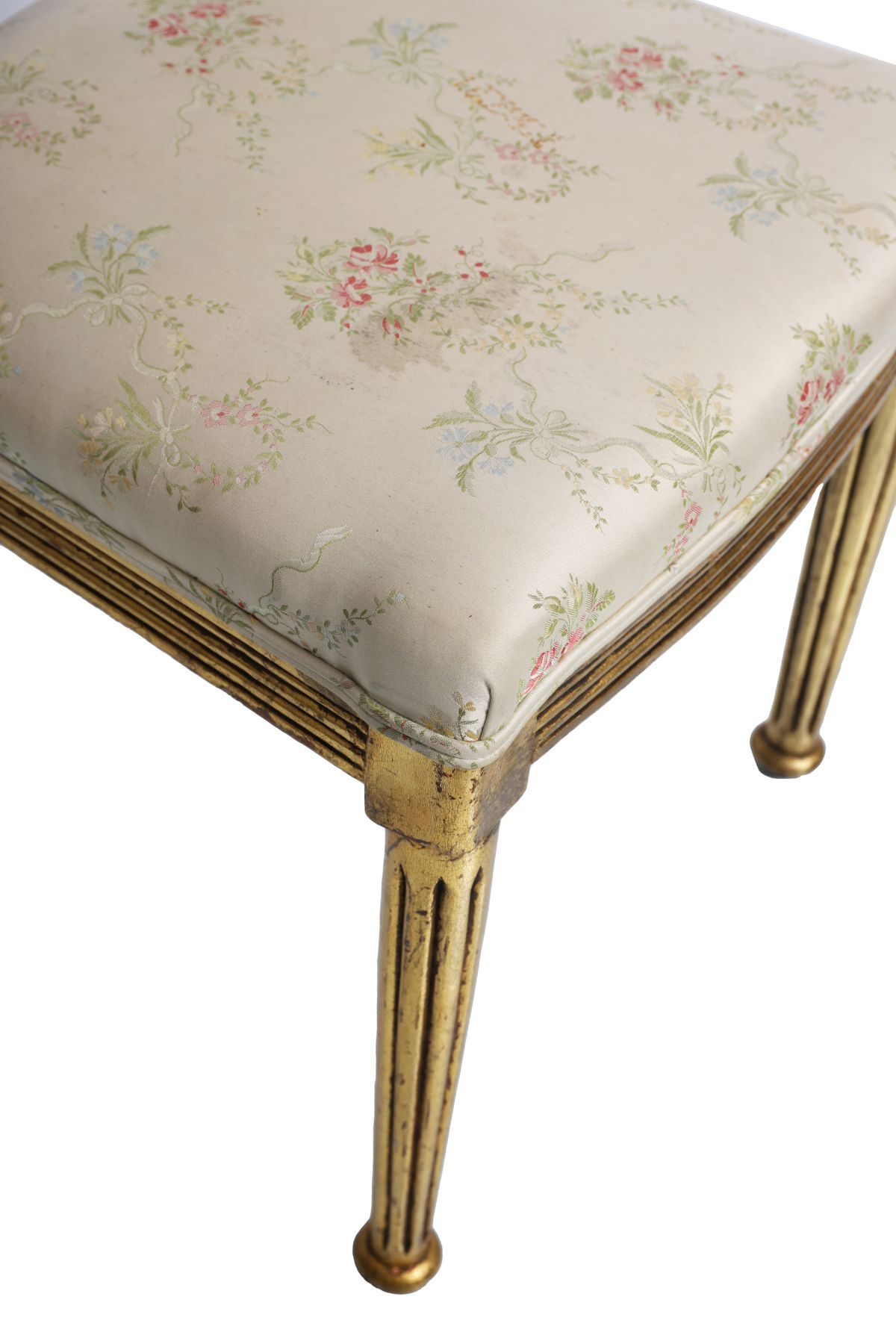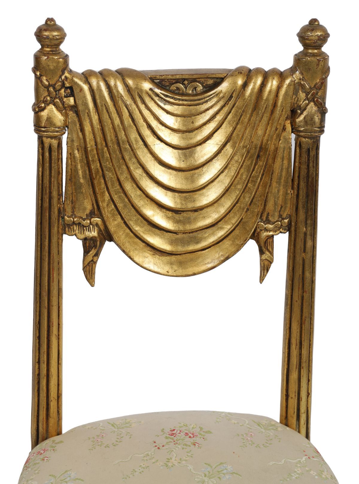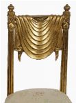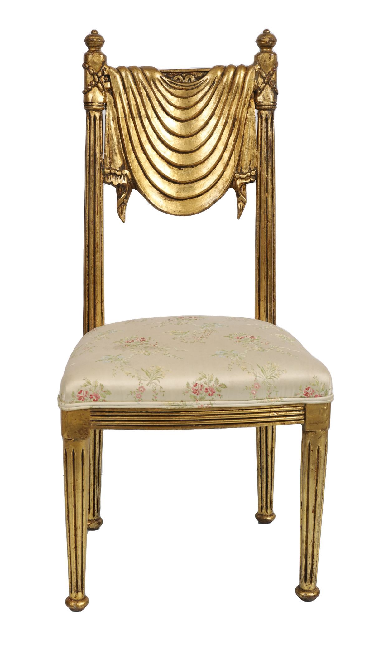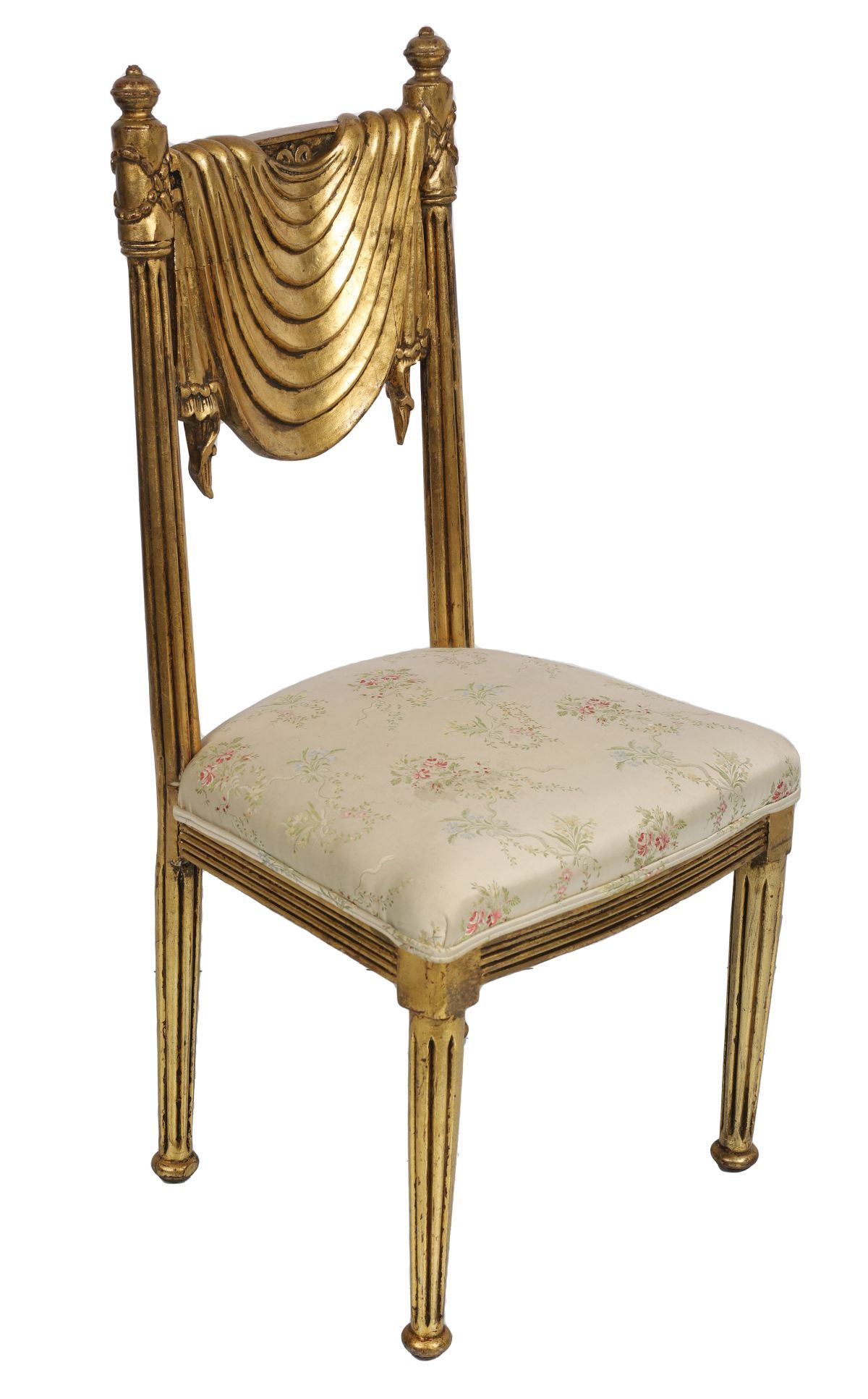 A Regency-style carved giltwood side chair with draped and swagged back above an upholstered seat, raised on fluted tapering legs.