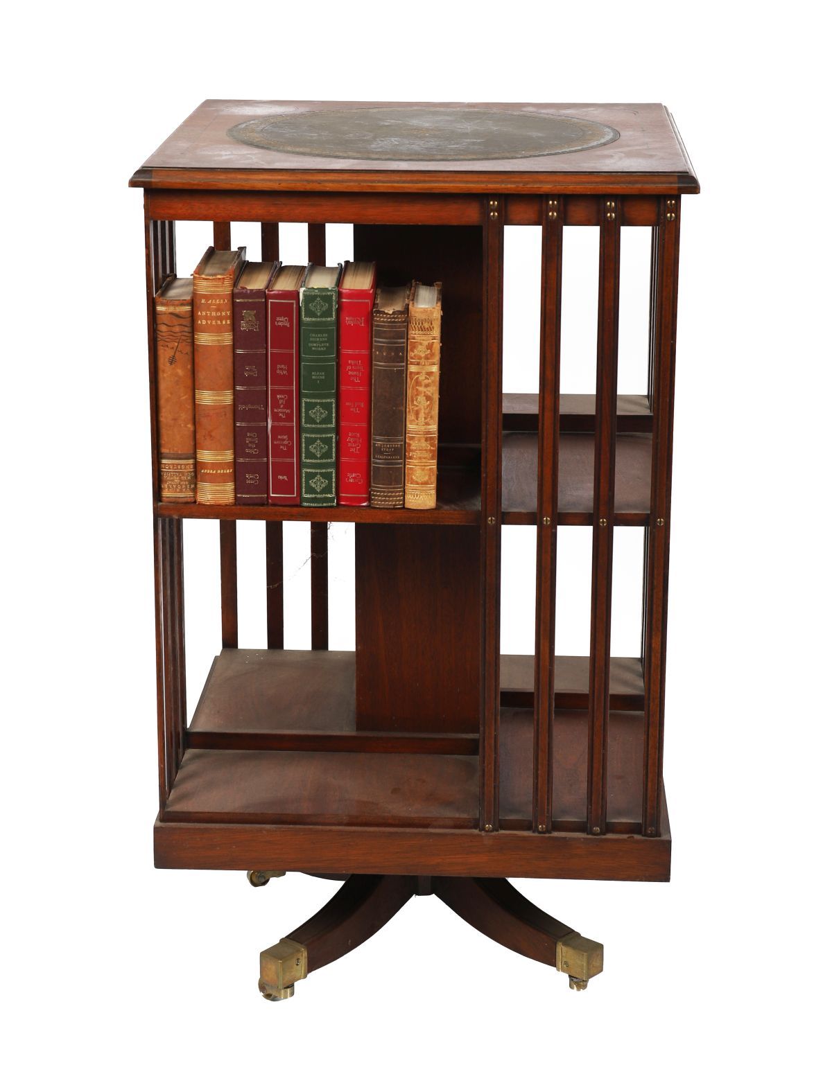 Early 20th century. A Regency style mahogany revolving bookcase, with square top inset with gilt-tooled green leather, crossbanded border, open shelving below, on cross base with brass castors.