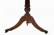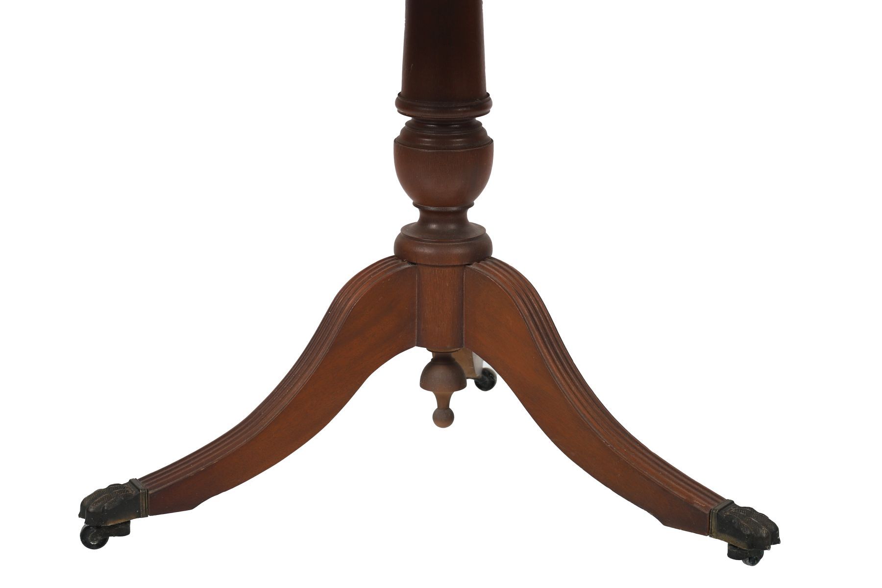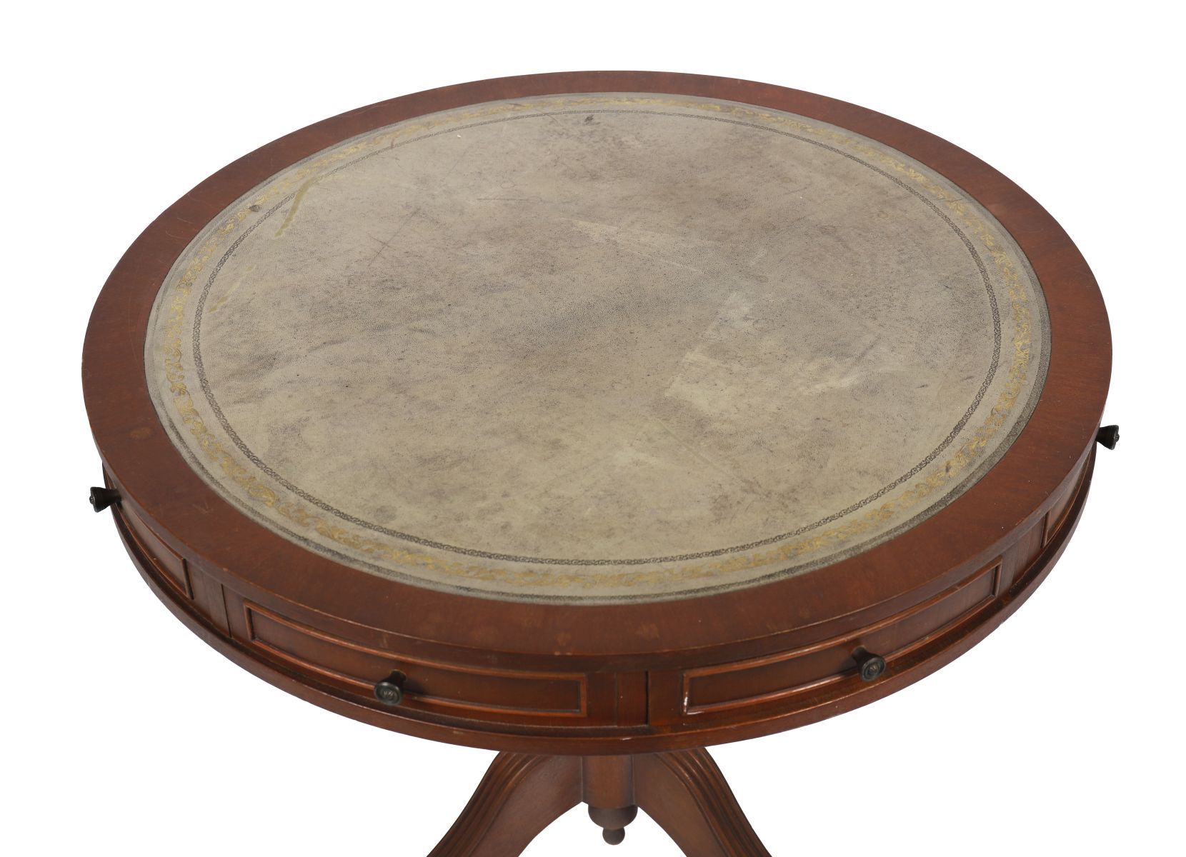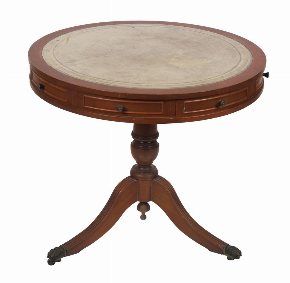 Early 20th century. A Regency style mahogany circular drum table, the top inset with gilt-tooled leather above four drawers and opposing dummy drawers, on a turned column support and four reeded splayed legs terminating in brass paw feet.