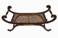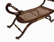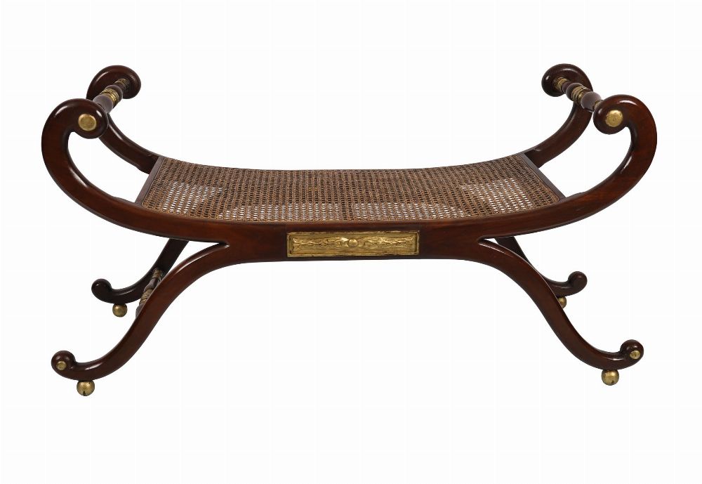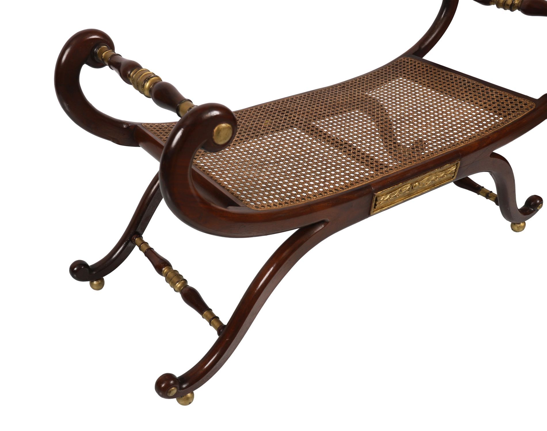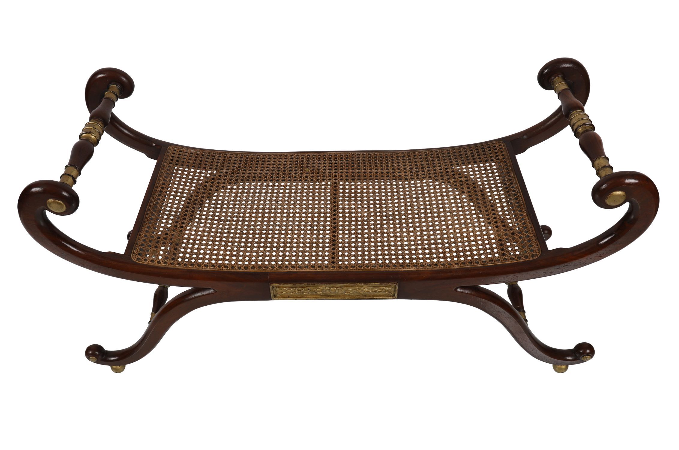 A mahogany stool in the Regency style, the caned seat within scrolling ends, parcel-gilt decoration, and turned stretcher supports with brass caps and castors.