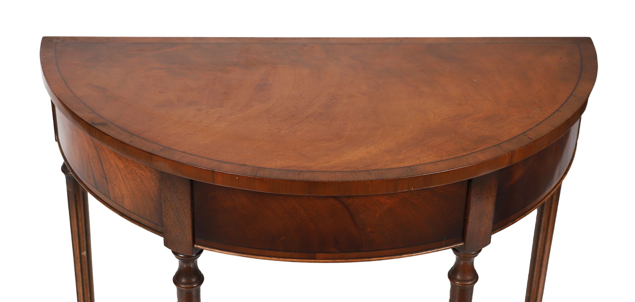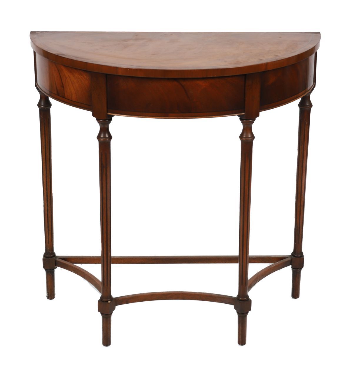 Early 20th century. A Regency style mahogany bow-front side table, crossbanded throughout and fitted with a central drawer, raised on slender reeded legs united by a shaped stretcher.