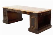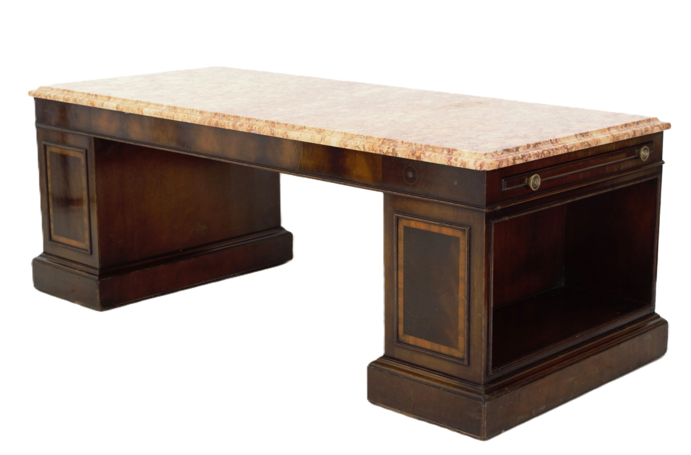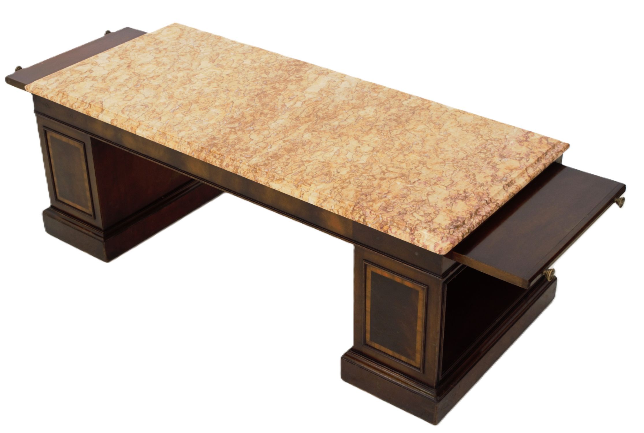 A Regency style coffee table, the rectangular top inset with figured marble, raised on twin pedestal supports with panelled decoration, each end fitted with brushing slides, and united by a plinth base.