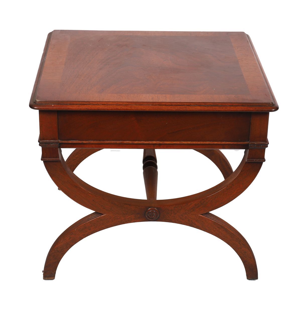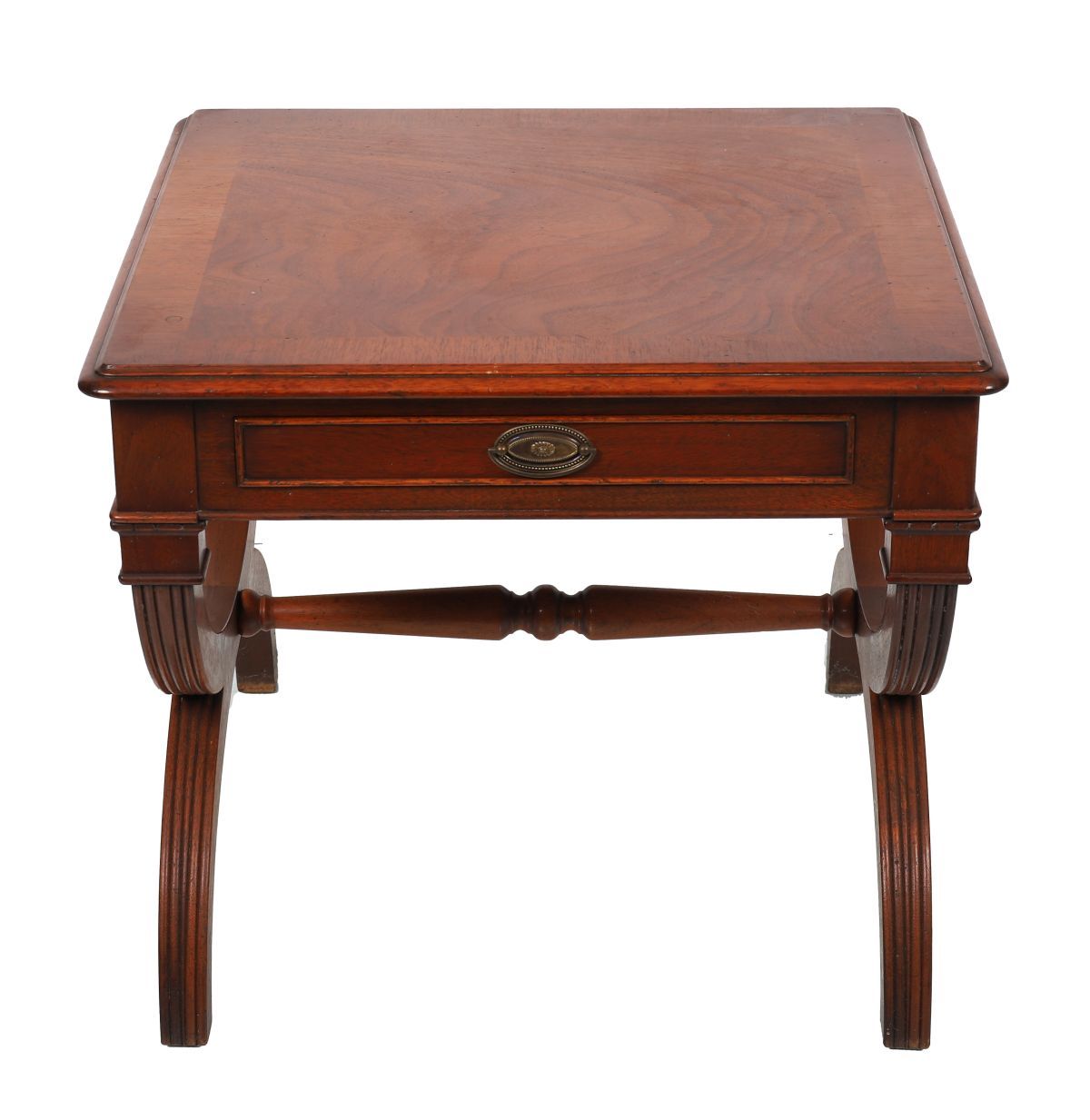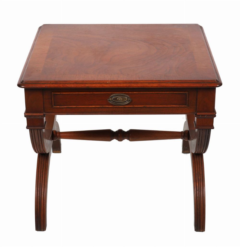 Early 20th century. A Regency style mahogany lamp or occasional table, the square top with crossbanded edge raised on scrolled X-frame supports united by a turned stretcher.