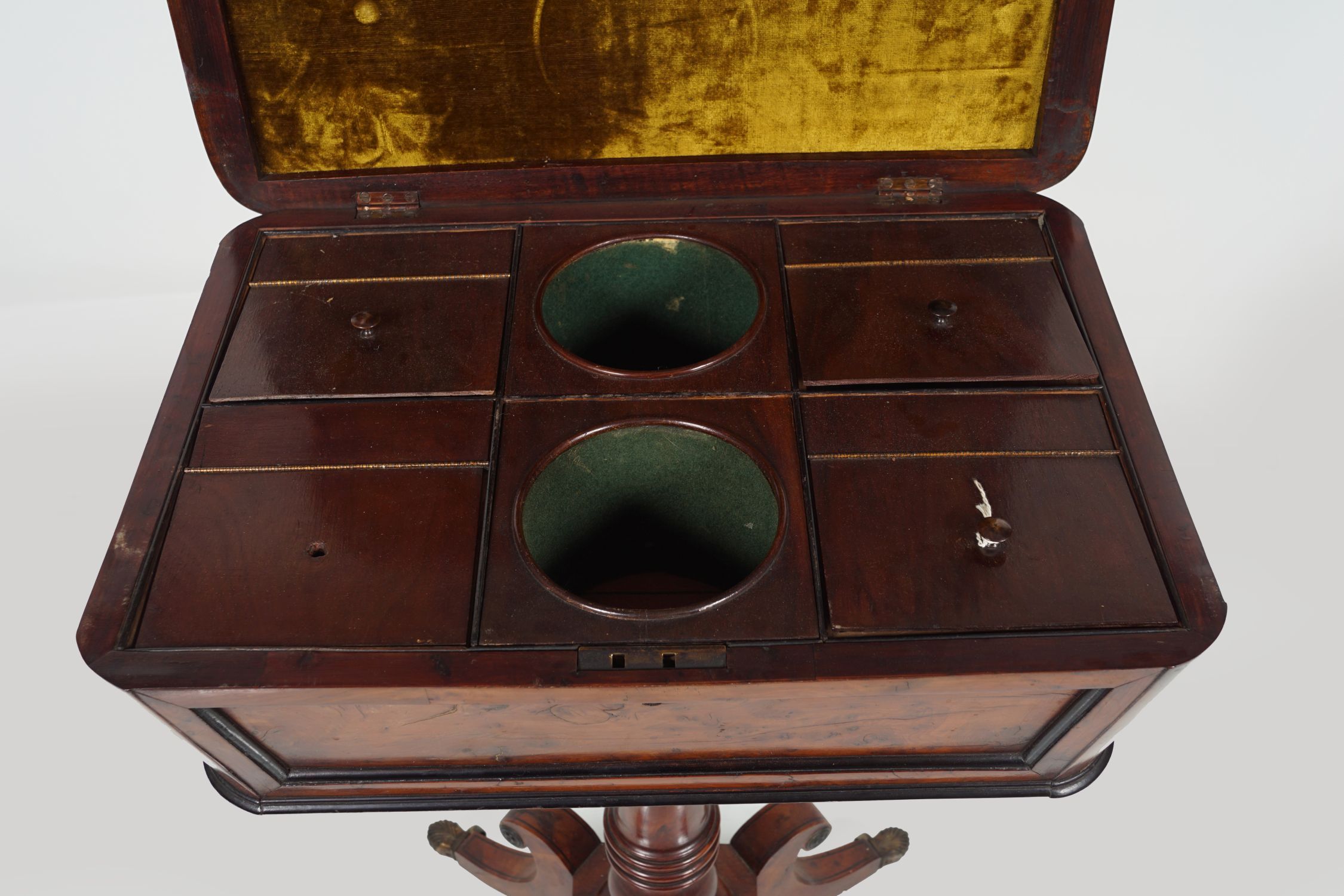 the reeded hinged top enclosing a fitted interior with lidded compartments, raised upon a turned centre column and outswept legs, brass caps and castors.