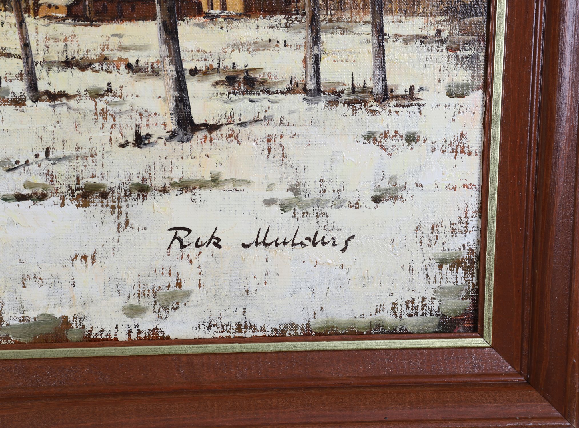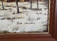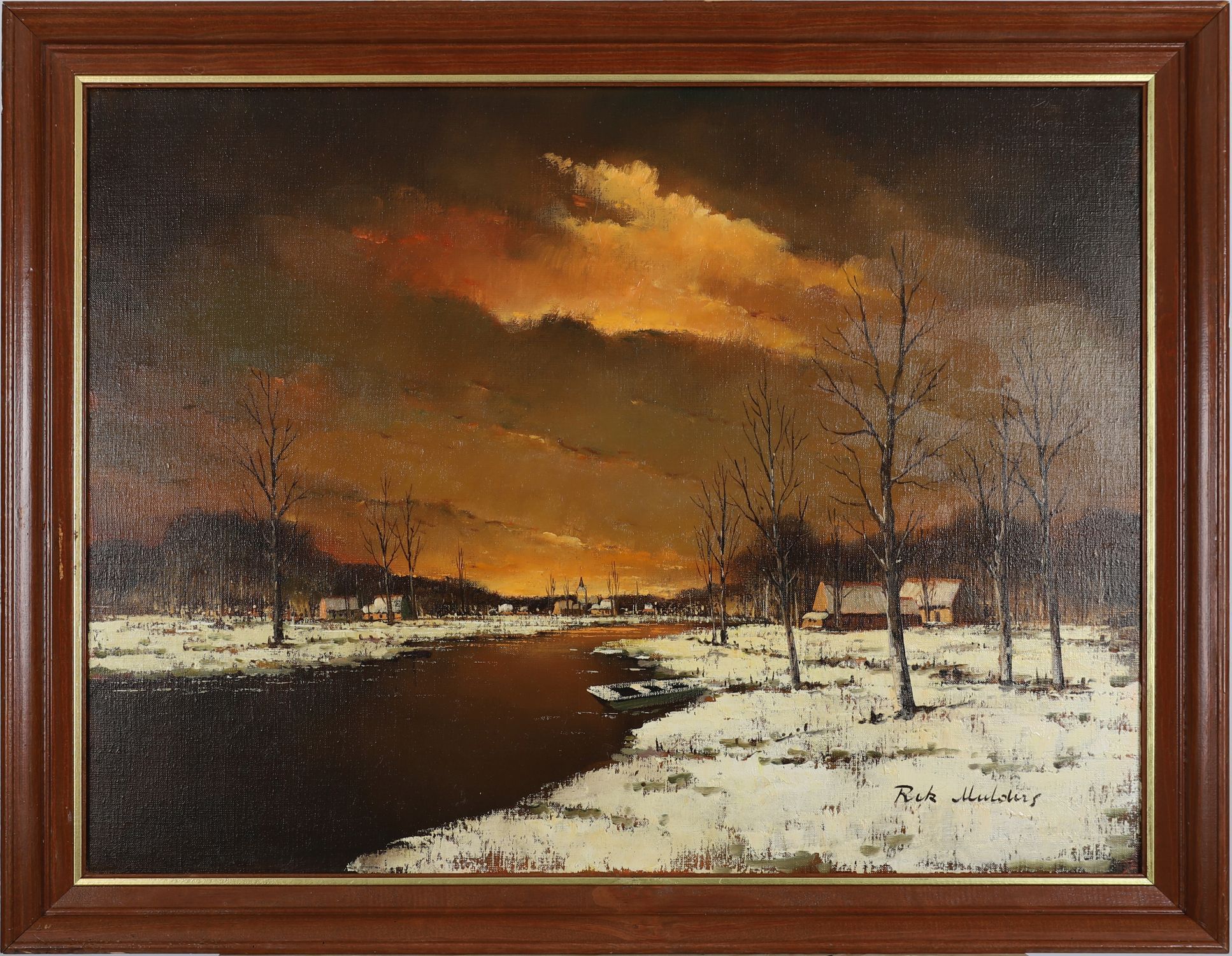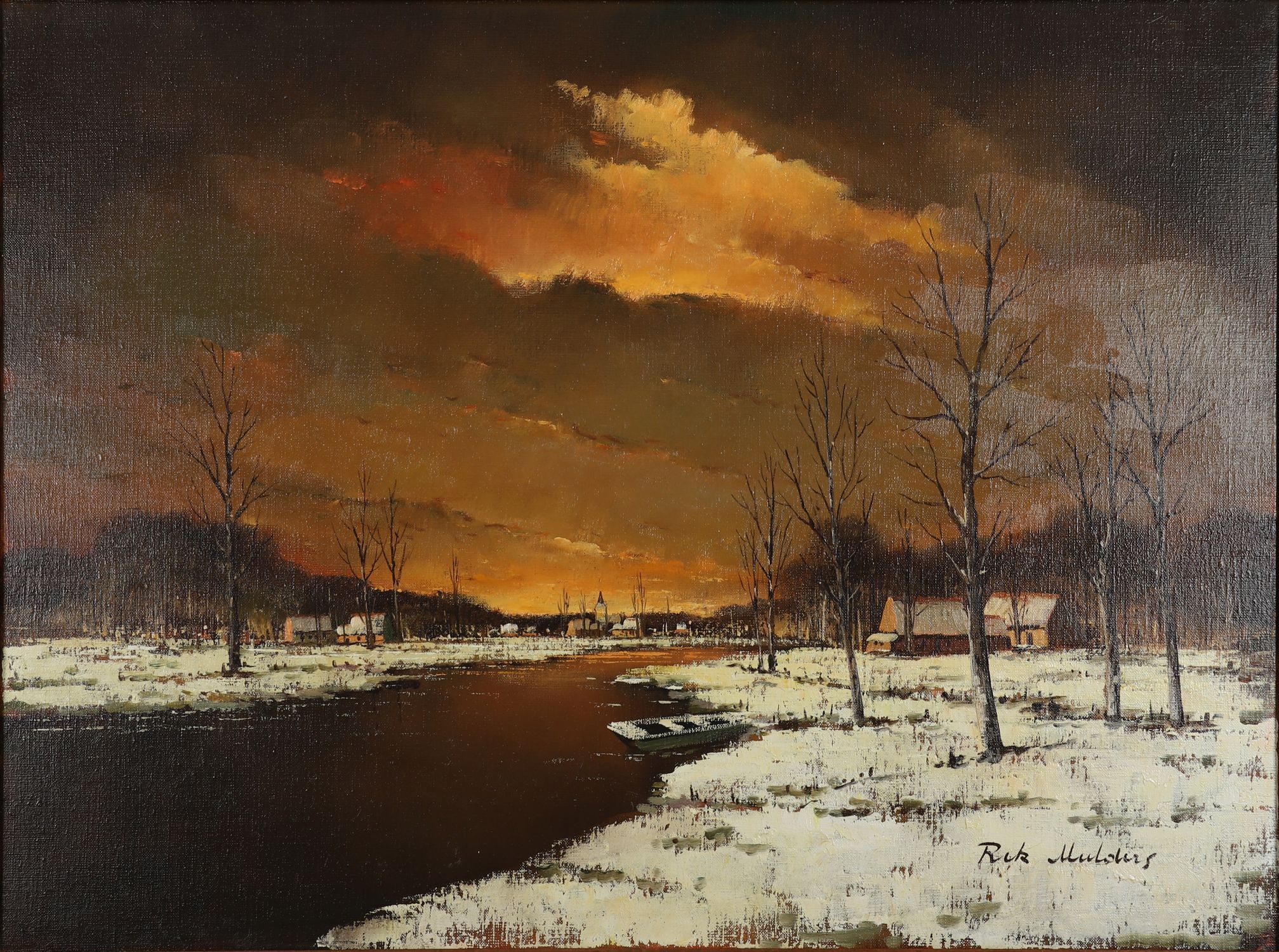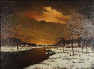 Oil on canvas depicting a snowy village landscape beneath a dramatic golden sunset sky. Signed lower right (unverified). Enclosed in a moulded frame. Oil on canvas.