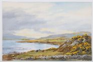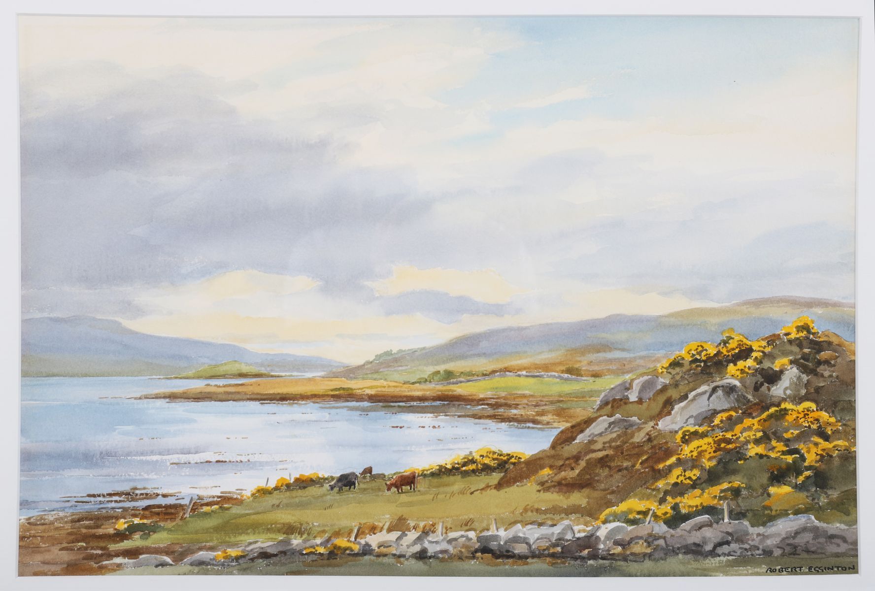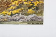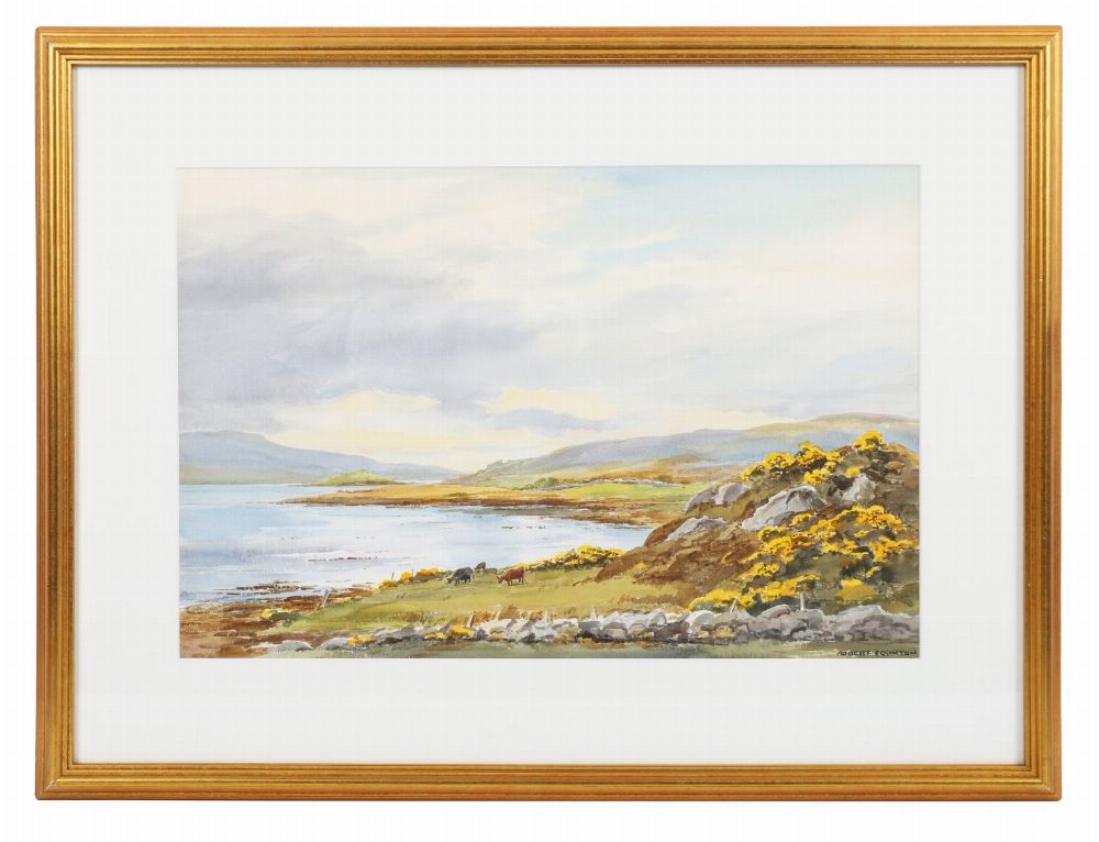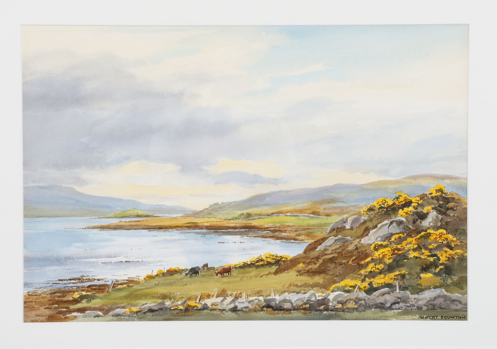 A delicate watercolour depicting cattle grazing near a reflective river under an expansive sky. Egginton’s light palette and transparent washes convey a sense of calm rural quietude, executed with confident precision.