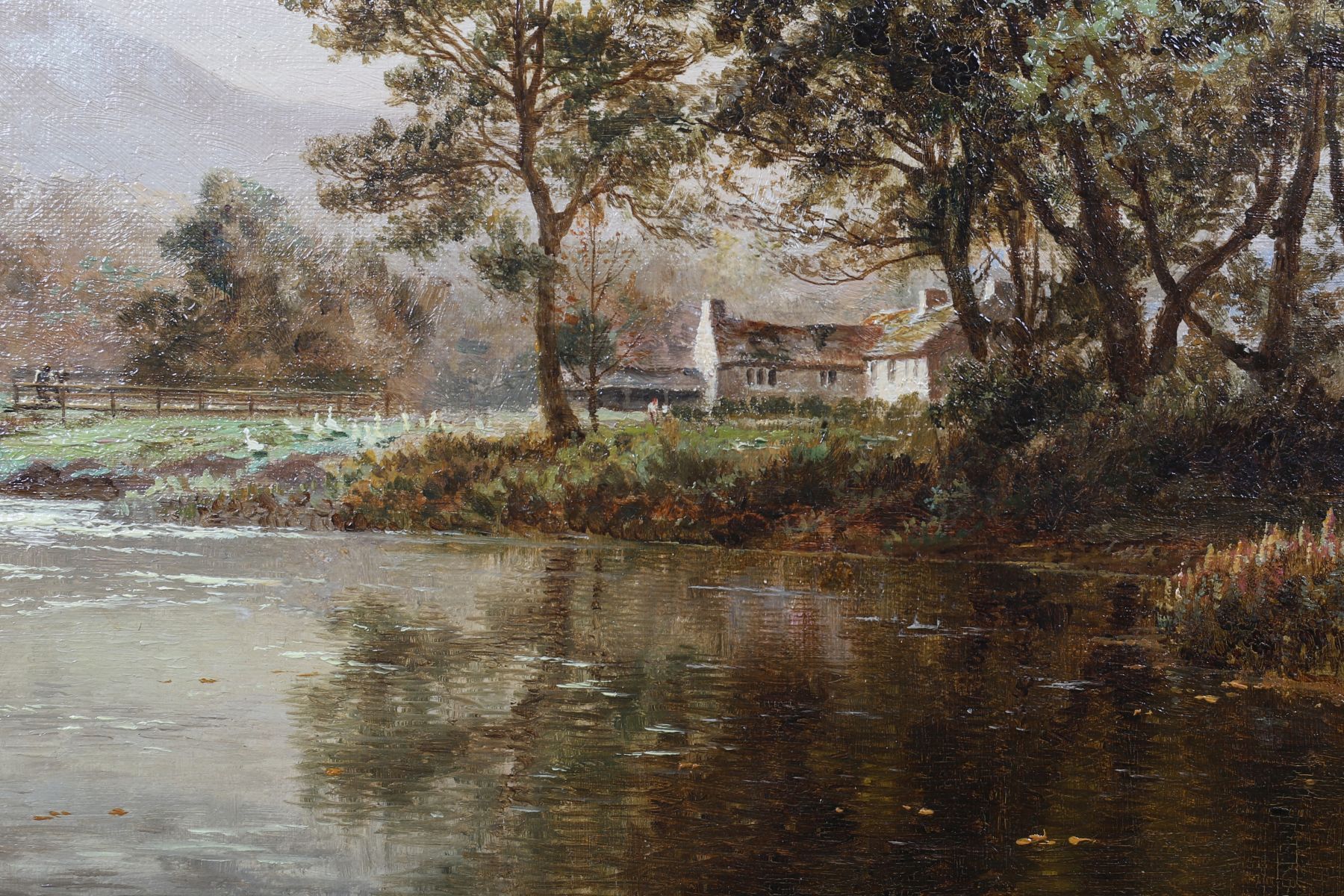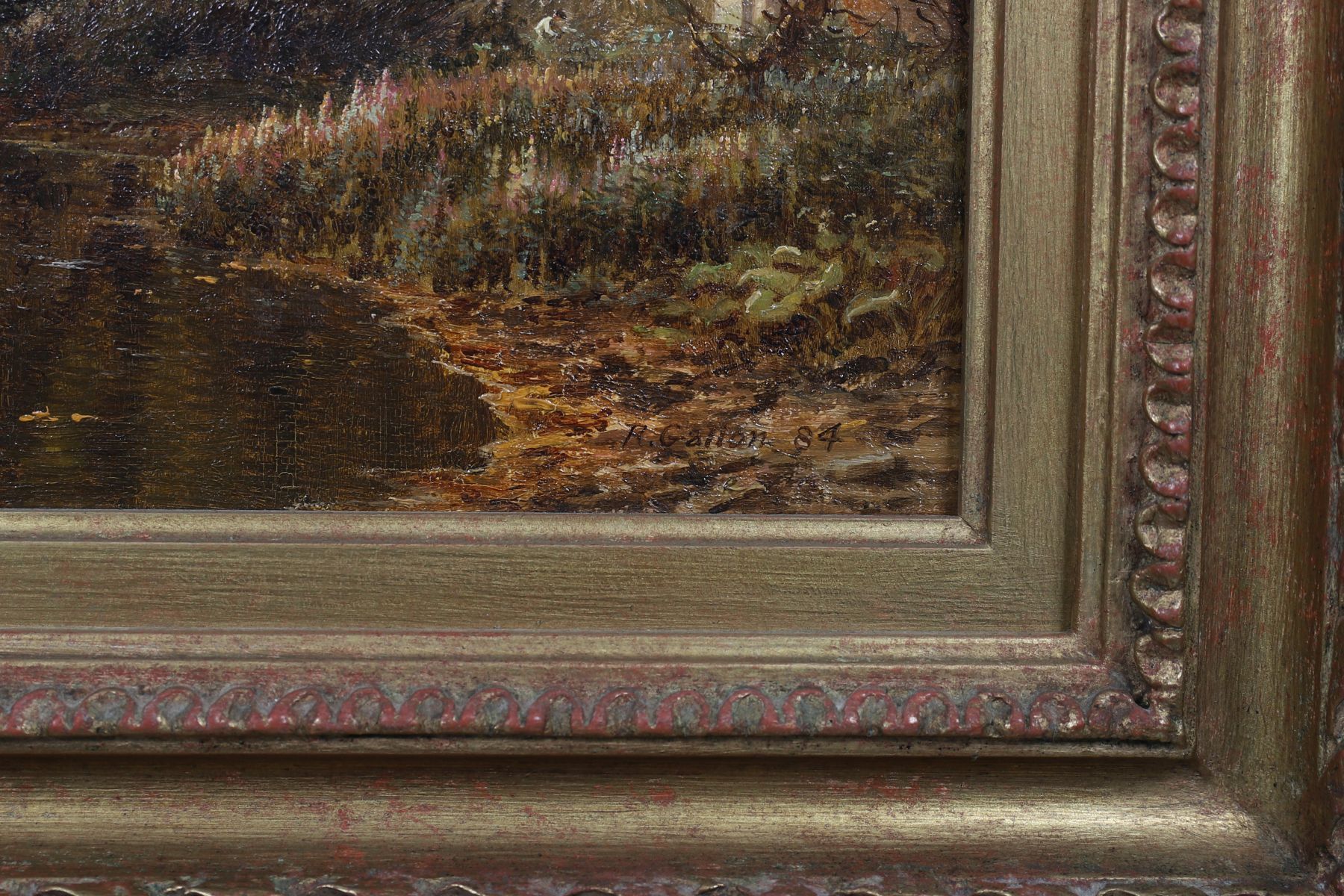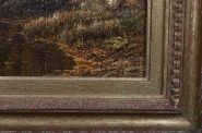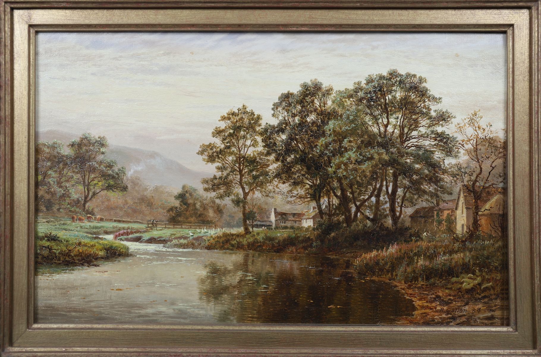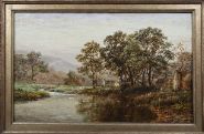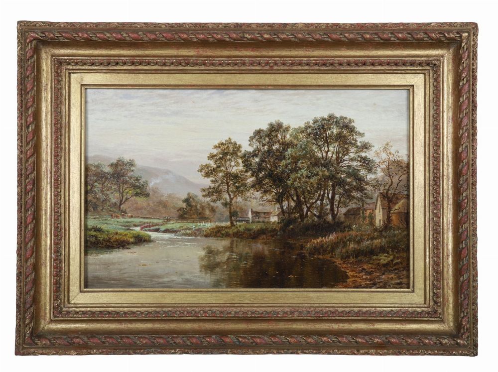 Tranquil landscape depicting a river meandering through trees and meadows, with cottages visible beyond. Oil on canvas, signed lower right. Presented in a gilt frame with rope-edge moulding.