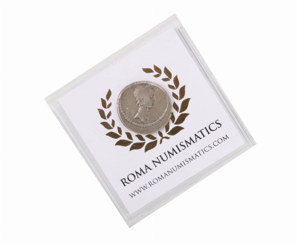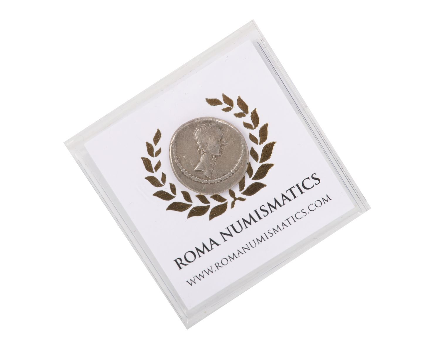 An ancient Roman coin of silvered bronze, circular in form with worn imagery and inscriptions visible to both sides.