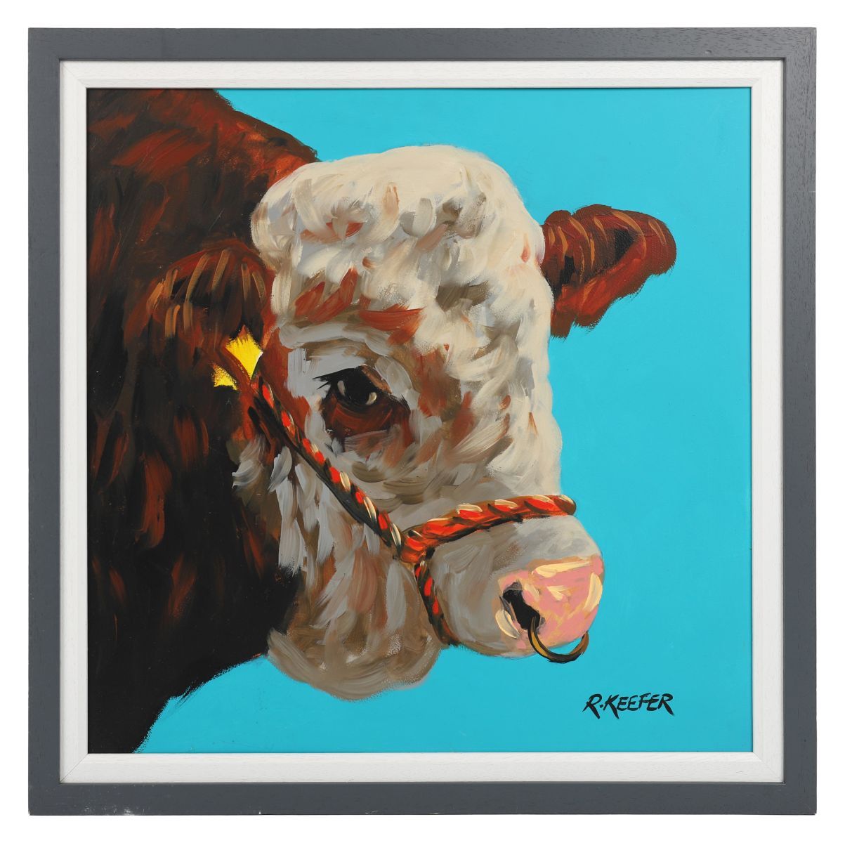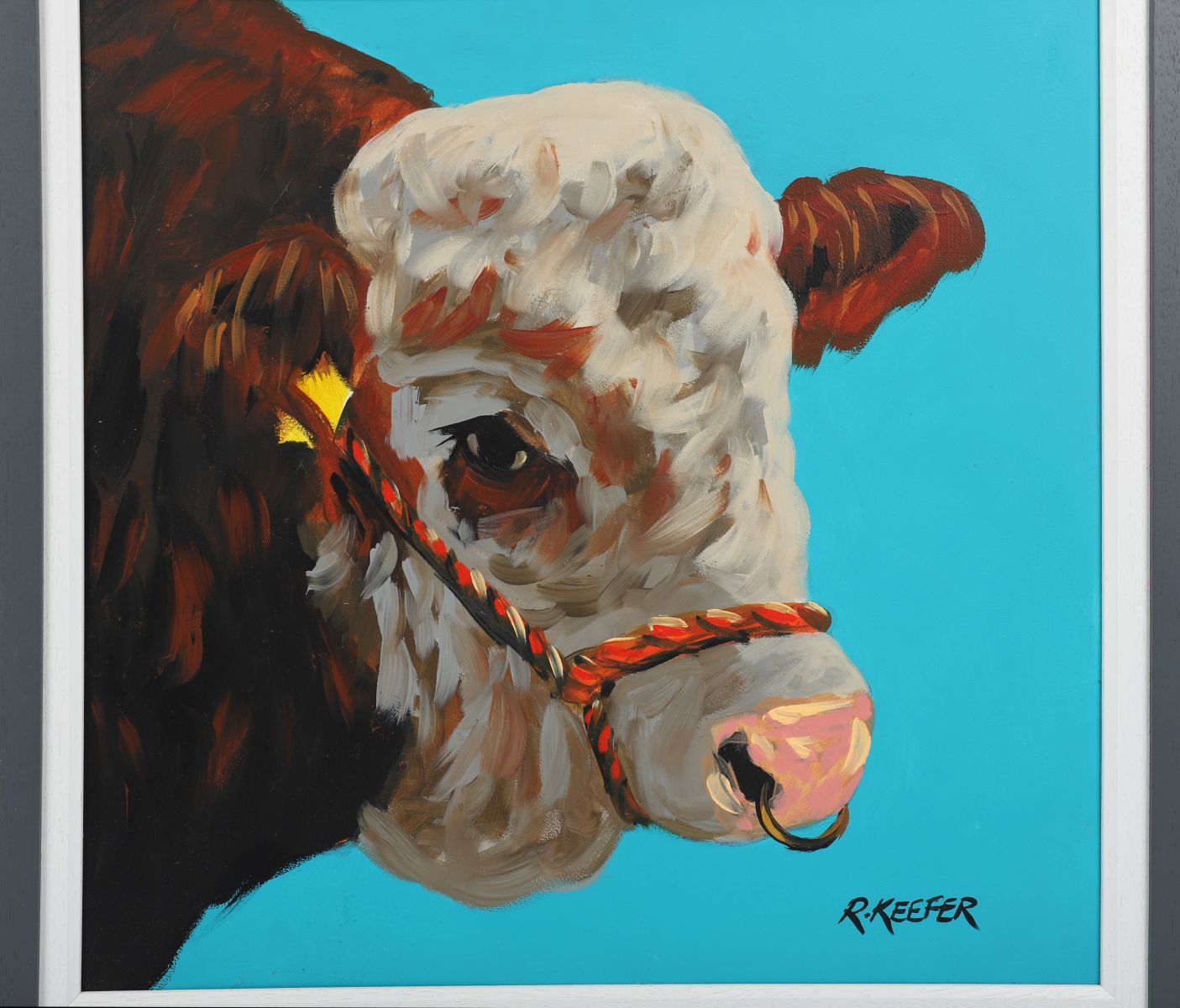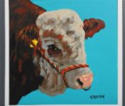 A striking modern study of a Hereford bull against a turquoise background, executed with bold brushwork and confident composition.