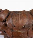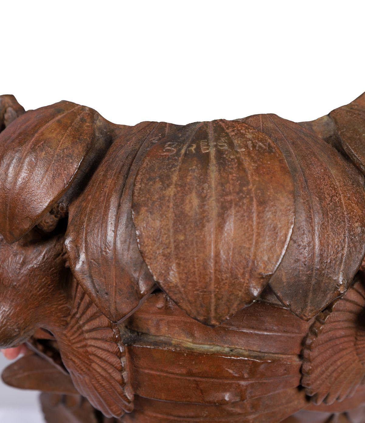 symmetrically balanced leaves issue from the top of the work to the bottom. The first, a canopy of Twayblade orchid leaves overhang the criss-crossed leaves of the Marsh orchid and two rosettes of Spear thistle on either side of the head. Folklore of both ancient Ireland and Greece tell of mixing the roots of orchids with goat's milk to make love potions. The thistle, James II choice of emblem for Scotland was picked because of its