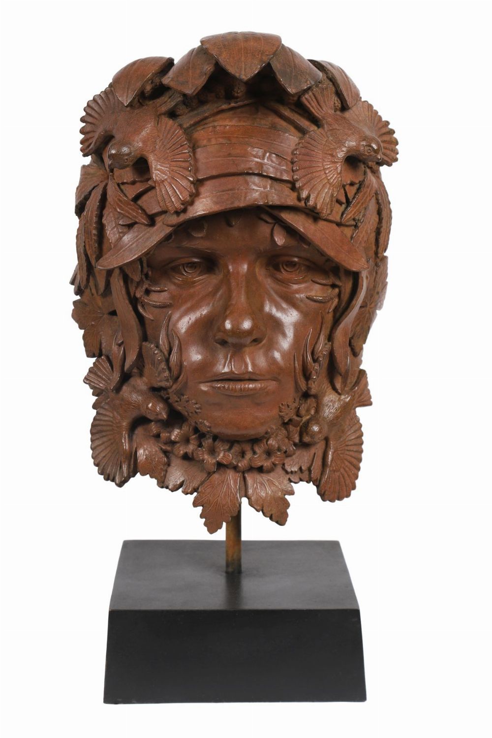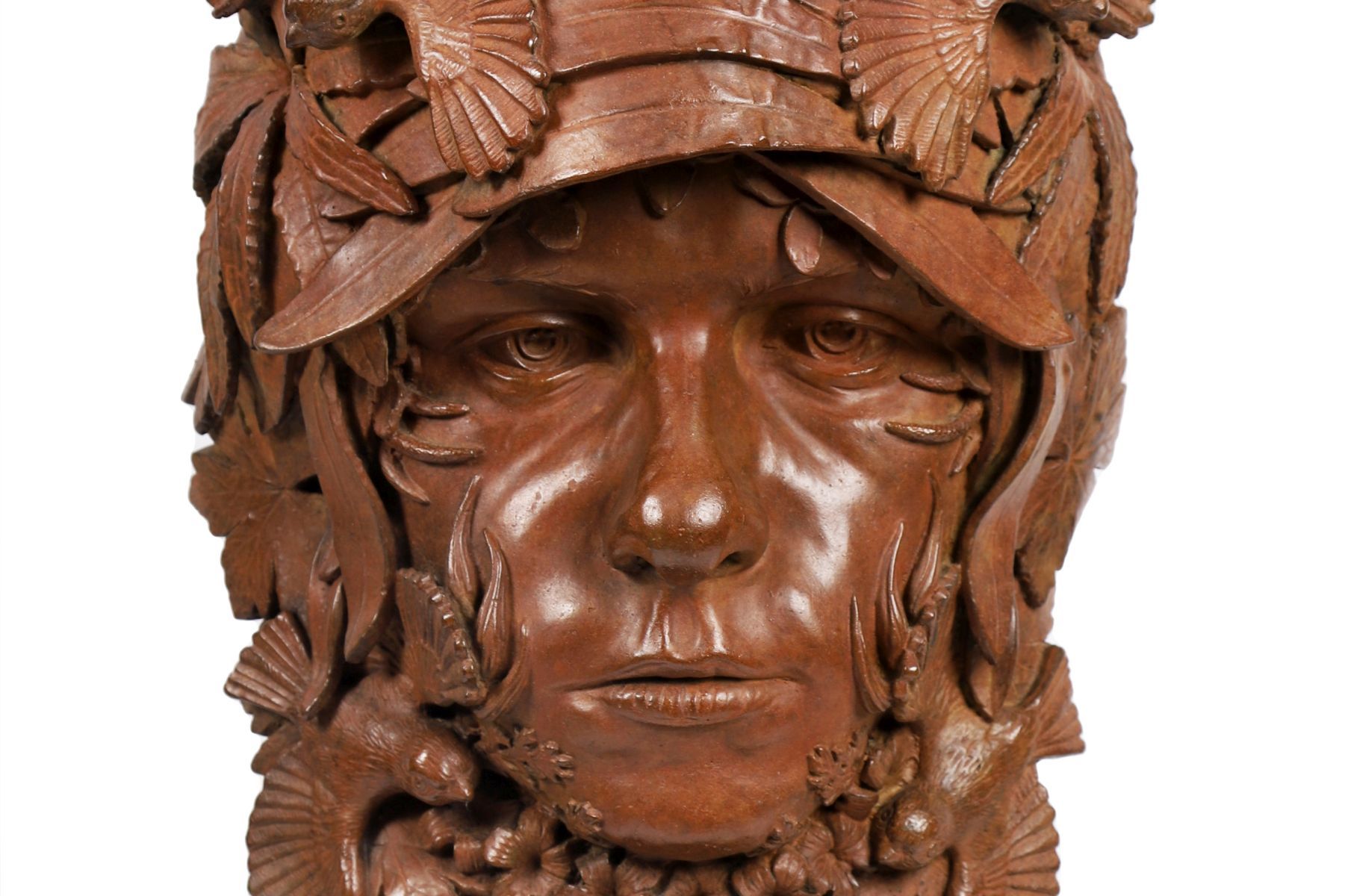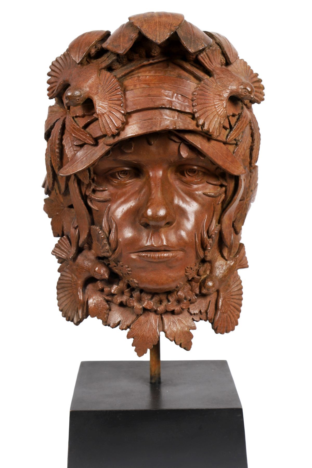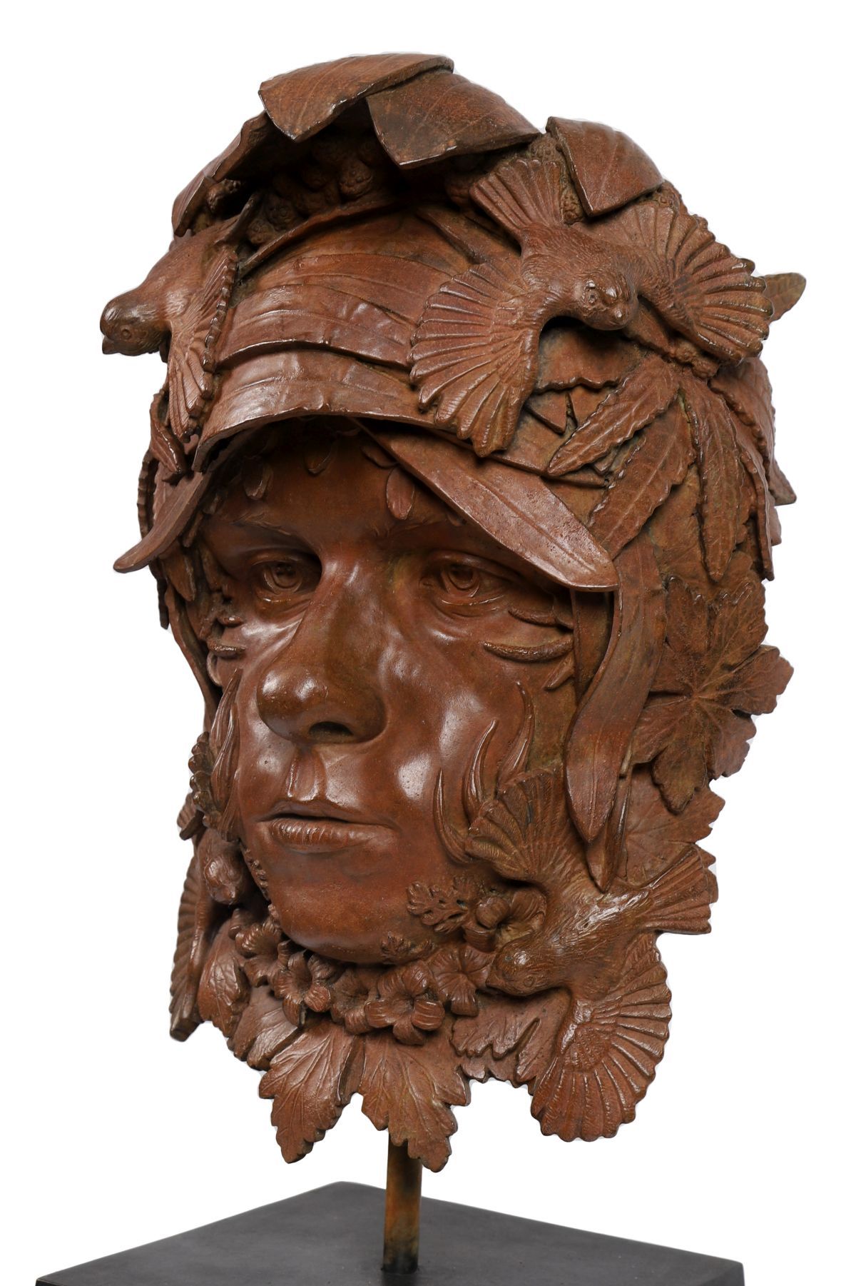 A series of plants curve inwards with the youth's face from the chin up. Leaves of the much