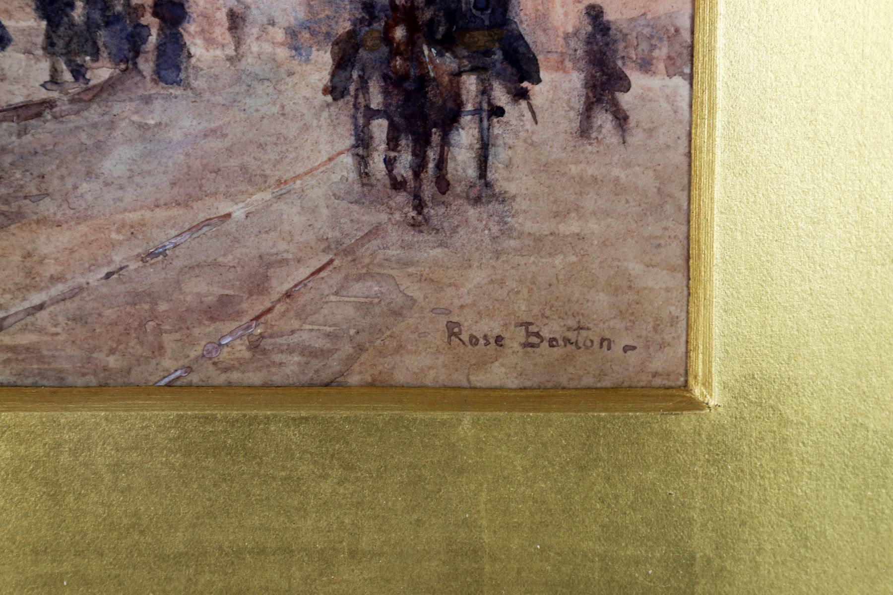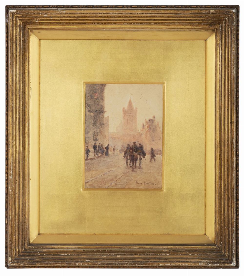 The daughter of a successful Tipperary lawyer—and a cousin of Edith Somerville, and the Hamilton sisters - Rose Barton was born in Dublin in 1856. Her mother was from the Martin family of Co. Galway. Barton was privately educated, and after the death of her father in 1874, travelled to Brussels with her mother and sister. She studied art under Henri Gervex, along with her friend Mildred Anne Butler. Both artists also studied in London, under Paul Jacob Naftel, quickly developing their skills as watercolour painters. They were part of an gifted group of Irish artists who specialised in this medium in the late nineteenth and early twentieth centuries. Barton first showed at the Royal Hibernian Academy in 1878, and two years later at the Dudley Gallery in London. Over the following decade she had exhibitions in both London and Dublin. Elected an associate member of the Society Women Artists by 1886, seven years later she became an associate of the Royal Society of Painters in Water-Colour (RWS), and a full member in 1911. In 1903, she settled in Knightsbridge, painting many views of the streetscapes and buildings of London. These were reproduced the following year in Familiar London, a book she both wrote and illustrated. Also in 1904 she was represented in the exhibition of Irish art curated by Sir Hugh Lane at the Guildhall in London. Although many of Barton's watercolours of Dublin depict scenes such as the Old Parliament building, the Viceregal Lodge, Dublin Castle and Charlemont House, she invested these views with an ethereal quality, shrouded in fog, or silhouetted against evening skies. She also sought out lesser-known laneways, delighting in their literary or historical associations. Rose Barton died in London on 10 October, 1929.