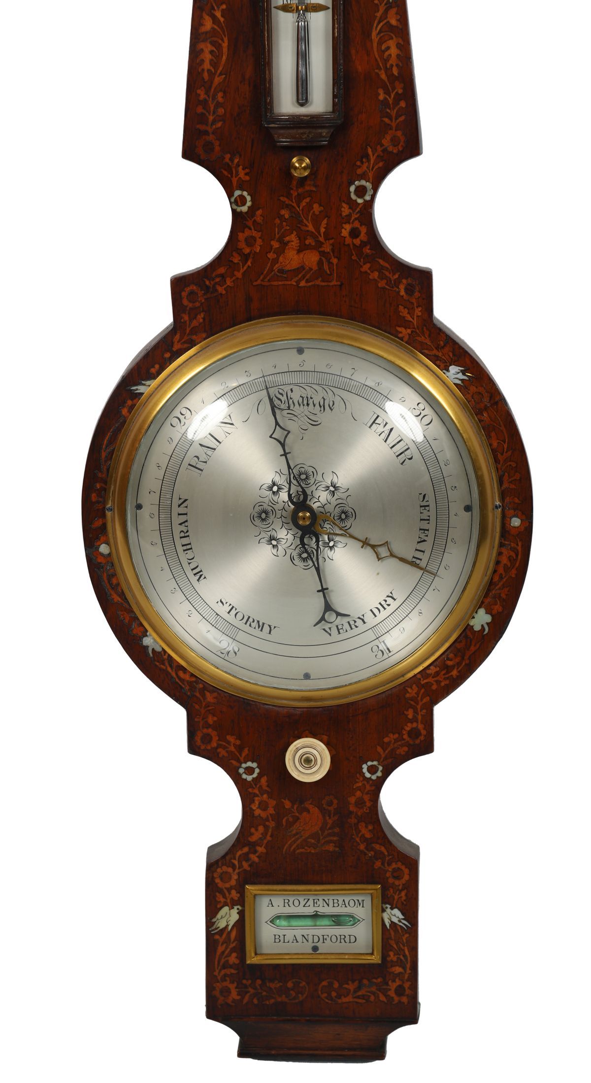 A 19th-century banjo-shaped barometer, the rosewood case cross-banded and inlaid with mother-of-pearl and marquetry, fitted with a silvered dial and thermometer, signed A. Rosenbaum, Blandford. English, 19th century.