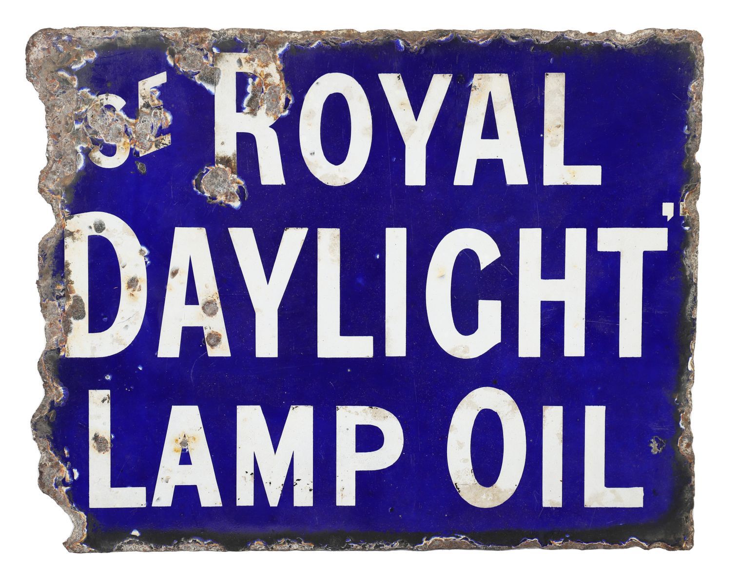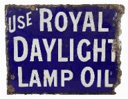 A double-sided enamel advertisement sign for Royal Daylight Lamp Oil, with white lettering on a blue ground.