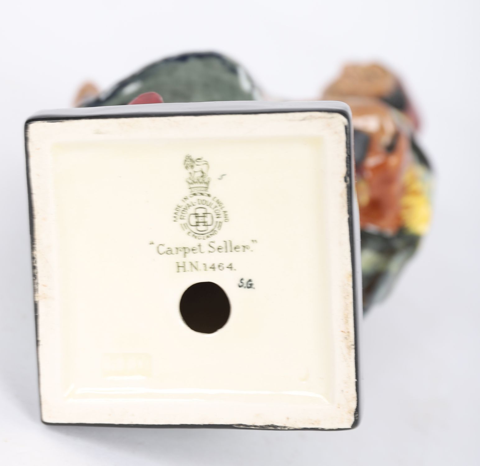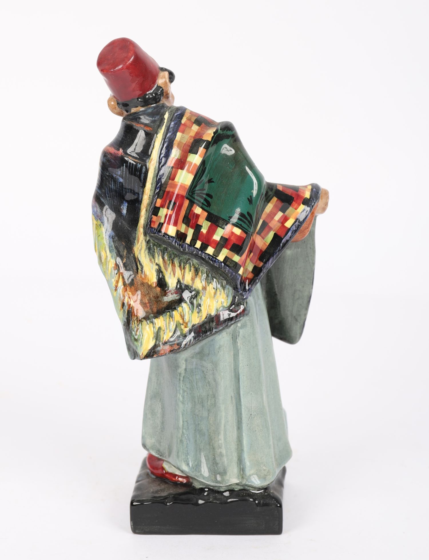 A richly coloured Royal Doulton figure titled The Carpet Seller, modelled with great character in a flowing robe and fez, the surface adorned in jewel-toned enamels.