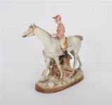 A Royal Doulton porcelain equestrian group depicting a jockey mounted on a grey horse accompanied by a hound.