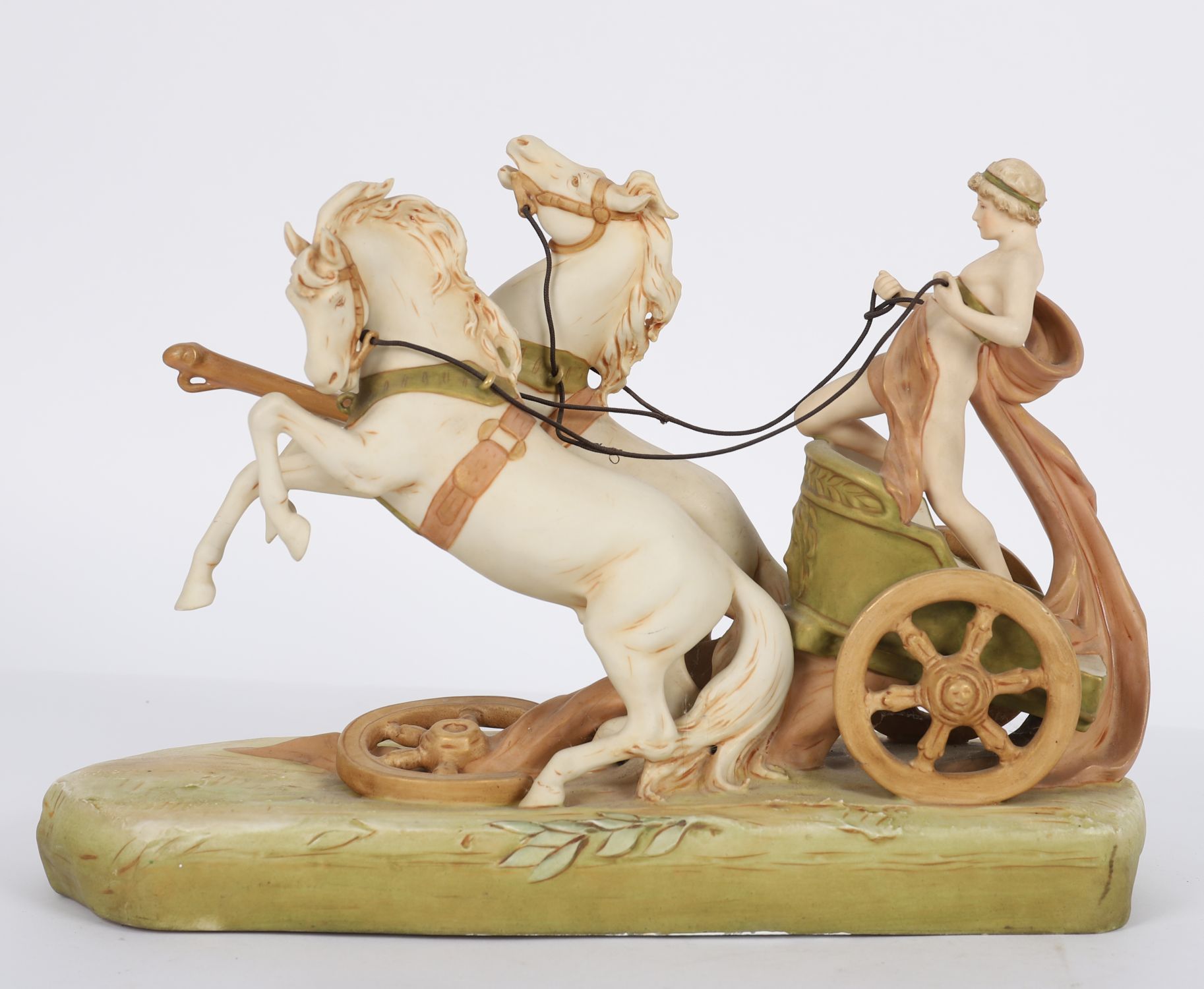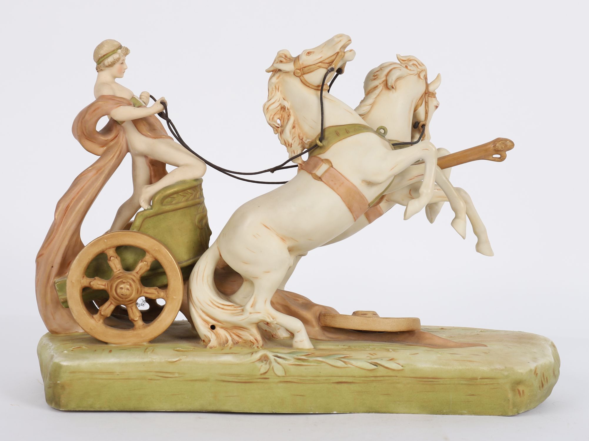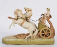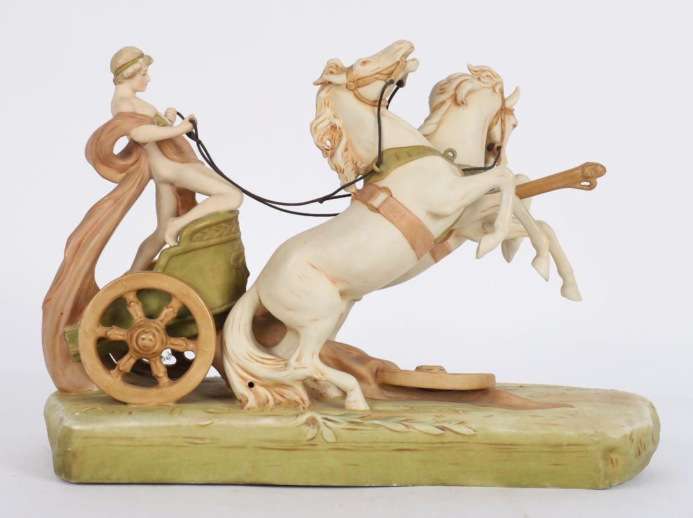 Depicting a charioteer in classical drapery driving a two-horse team at full gallop, the figures modelled in high detail and painted in soft cream, ochre, and terracotta tones, raised on a naturalistic oval base. Applied with the Royal Dux pink triangular mark.