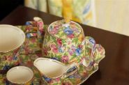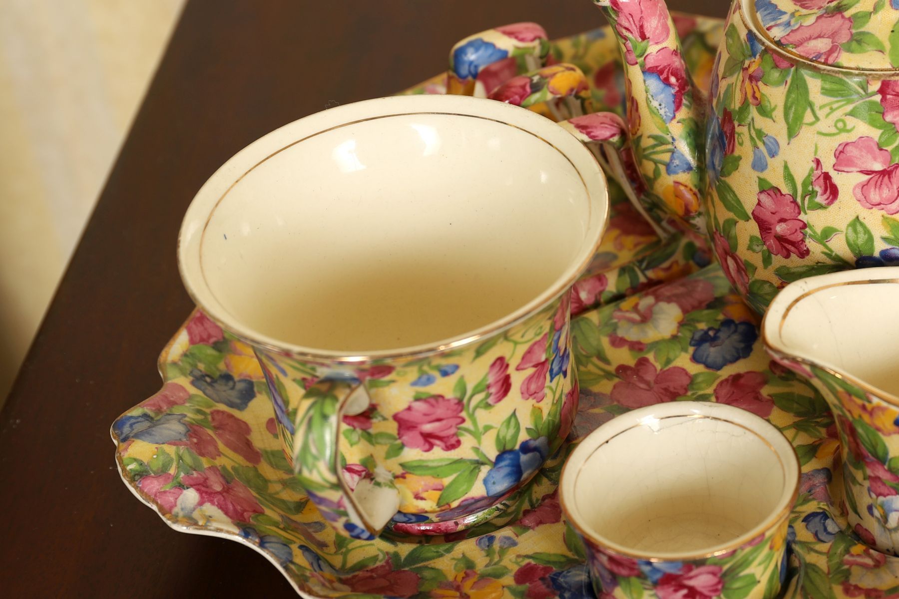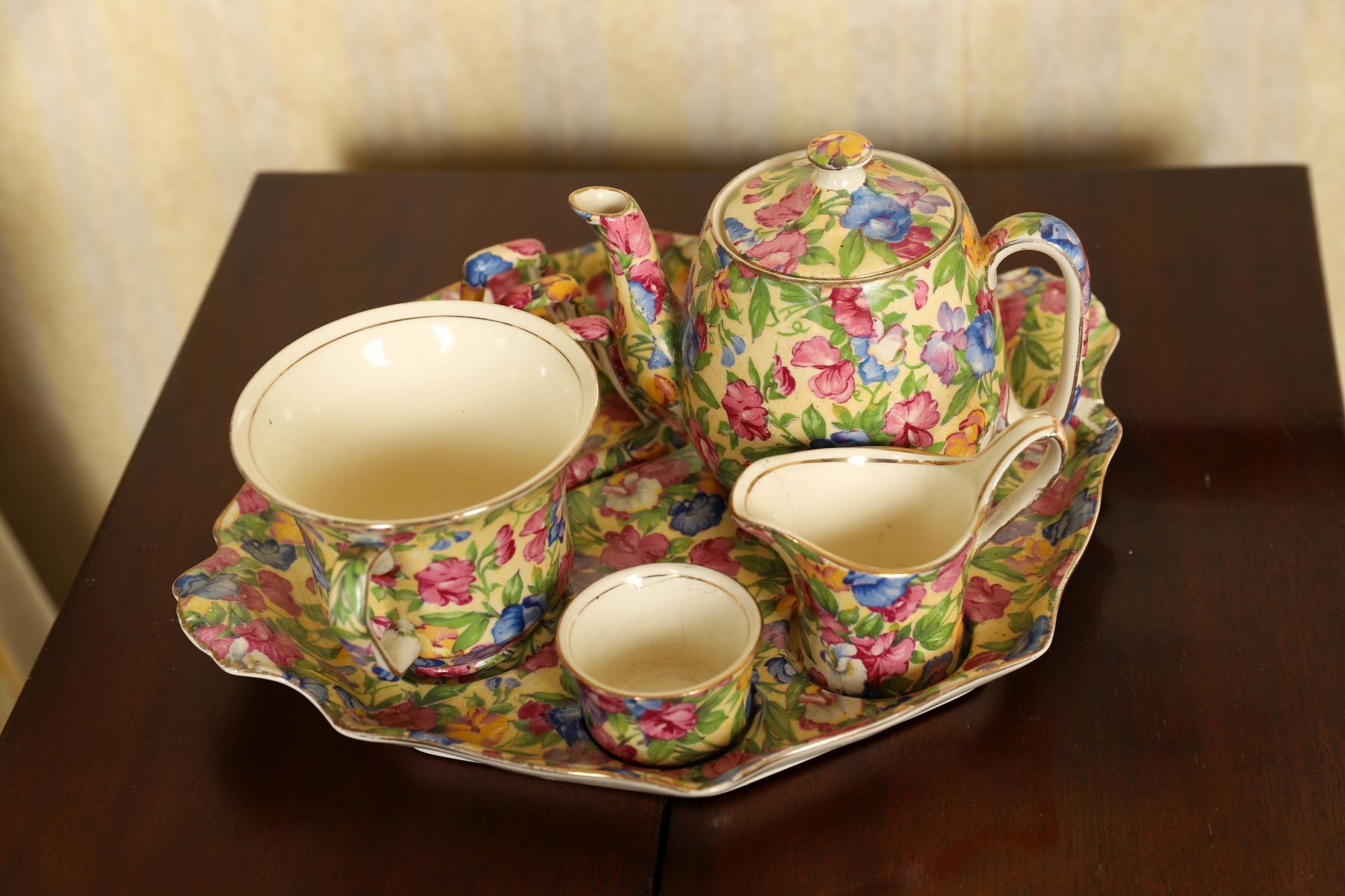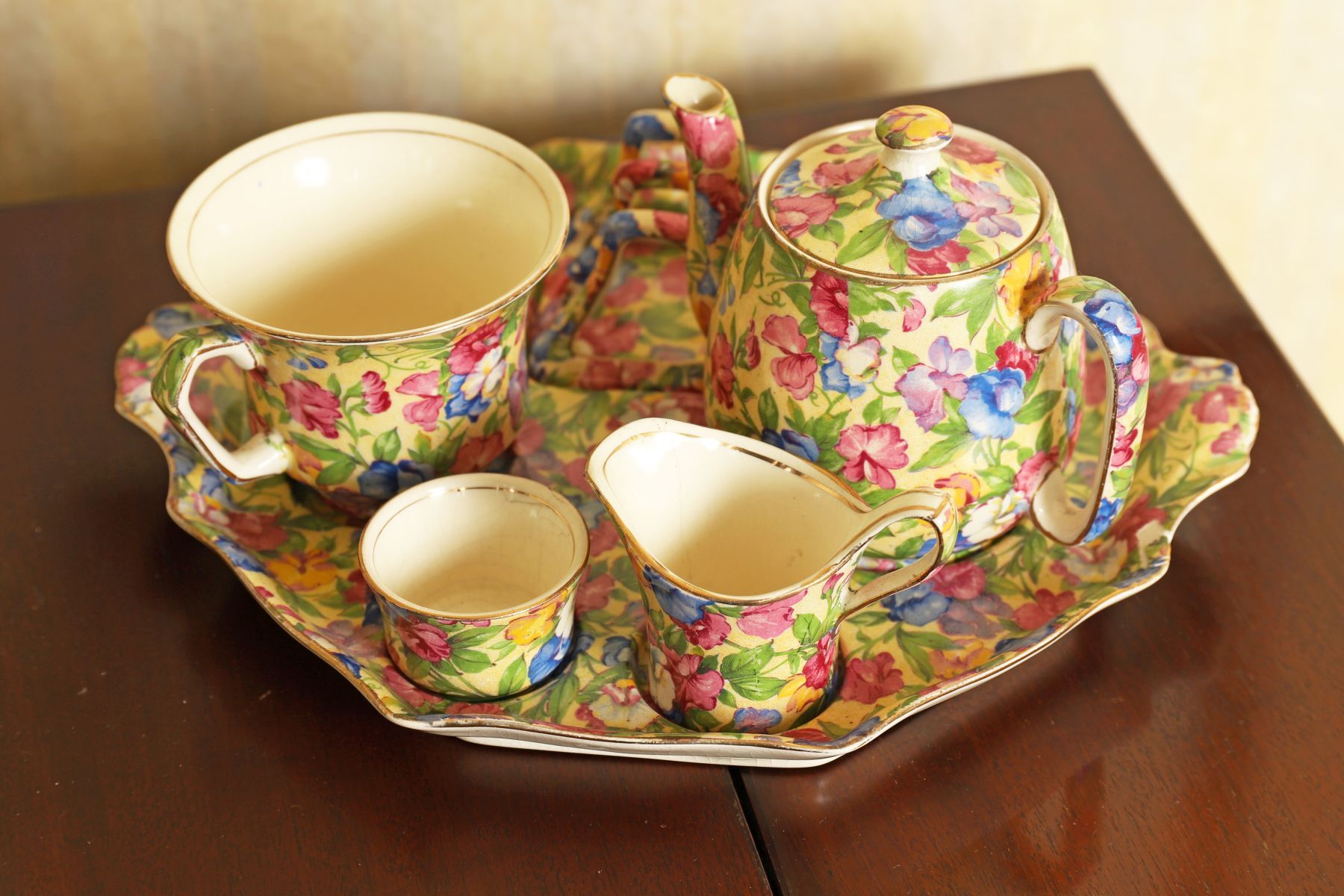 A Royal Winton cabaret set comprising a teapot with cover, milk jug, sugar bowl and two cups, all decorated in a dense polychrome floral pattern, presented on a matching tray.