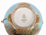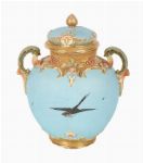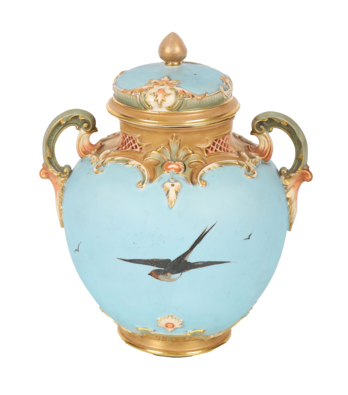A fine Royal Worcester porcelain vase and cover, richly decorated with raised gilt rococo scrolls and hand-painted swans in flight against a sky-blue and olive-green ground. The pierced neck and handles with gilt and blush highlights, the domed cover surmounted by a gilt finial. The underside with printed Worcester crown mark, registration number 168915.
