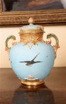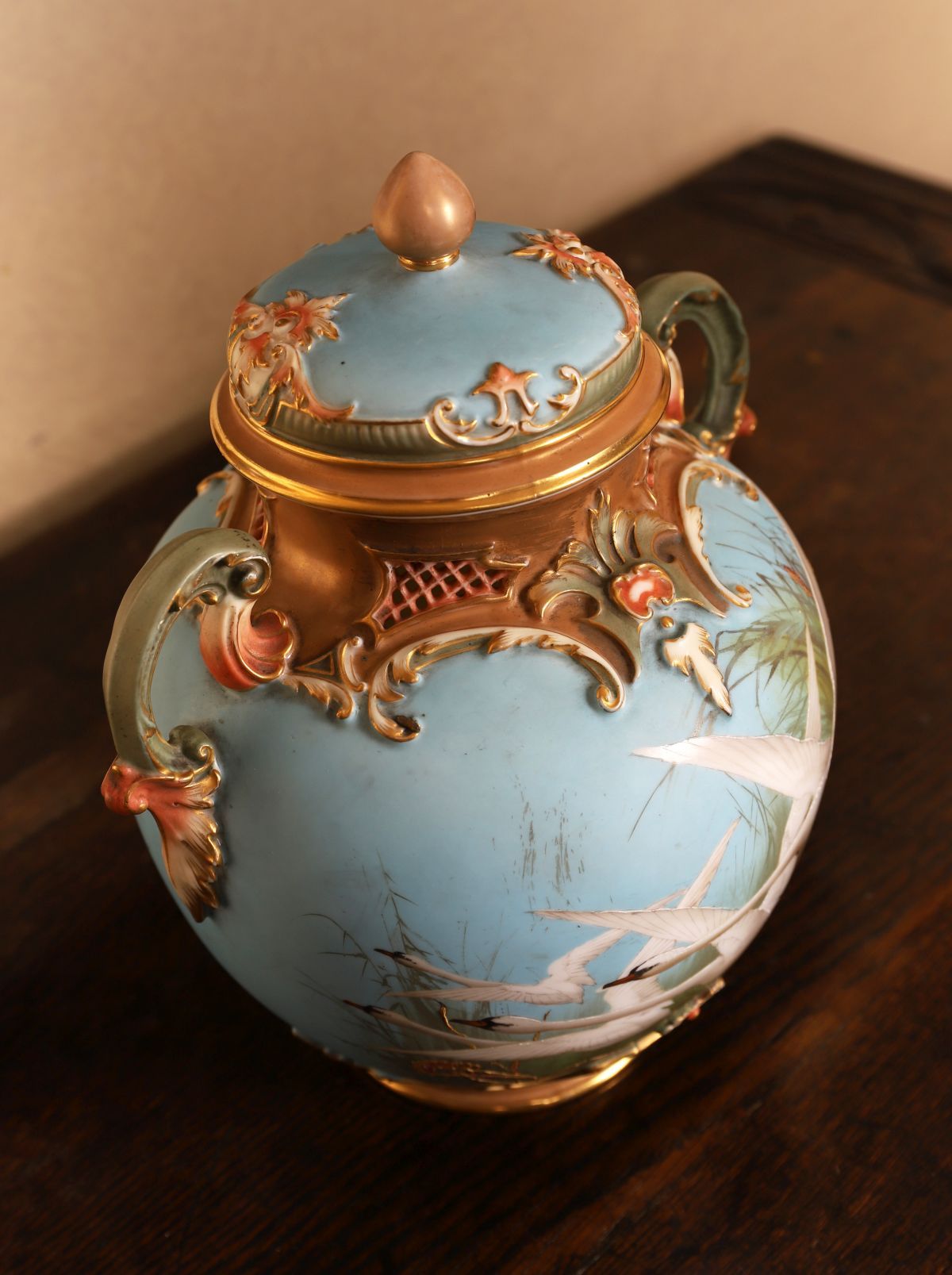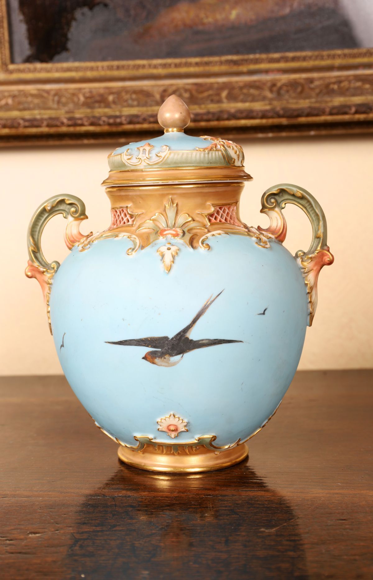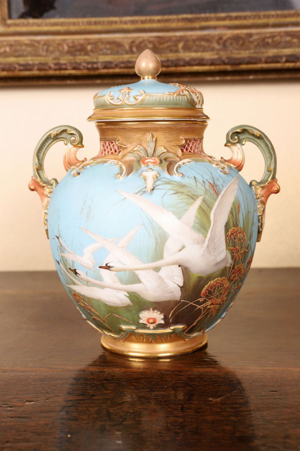 A fine Royal Worcester porcelain vase and cover, richly decorated with raised gilt rococo scrolls and hand-painted swans in flight against a sky-blue and olive-green ground. The pierced neck and handles with gilt and blush highlights, the domed cover surmounted by a gilt finial. The underside with printed Worcester crown mark, registration number 168915.