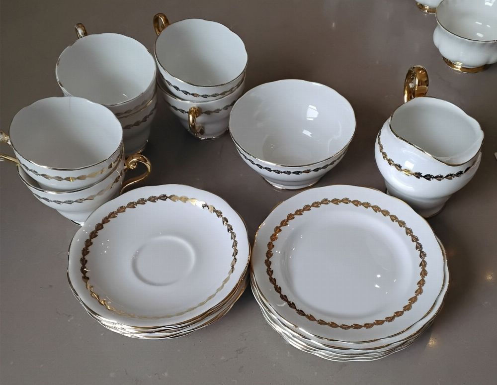 A 19-piece Royal Worcester white porcelain tea set, each piece with moulded rim and decorated with gilt laurel borders and banding, comprising teacups, coffee cans, saucers, and side plates — a stylish and elegant service suitable for display or use.