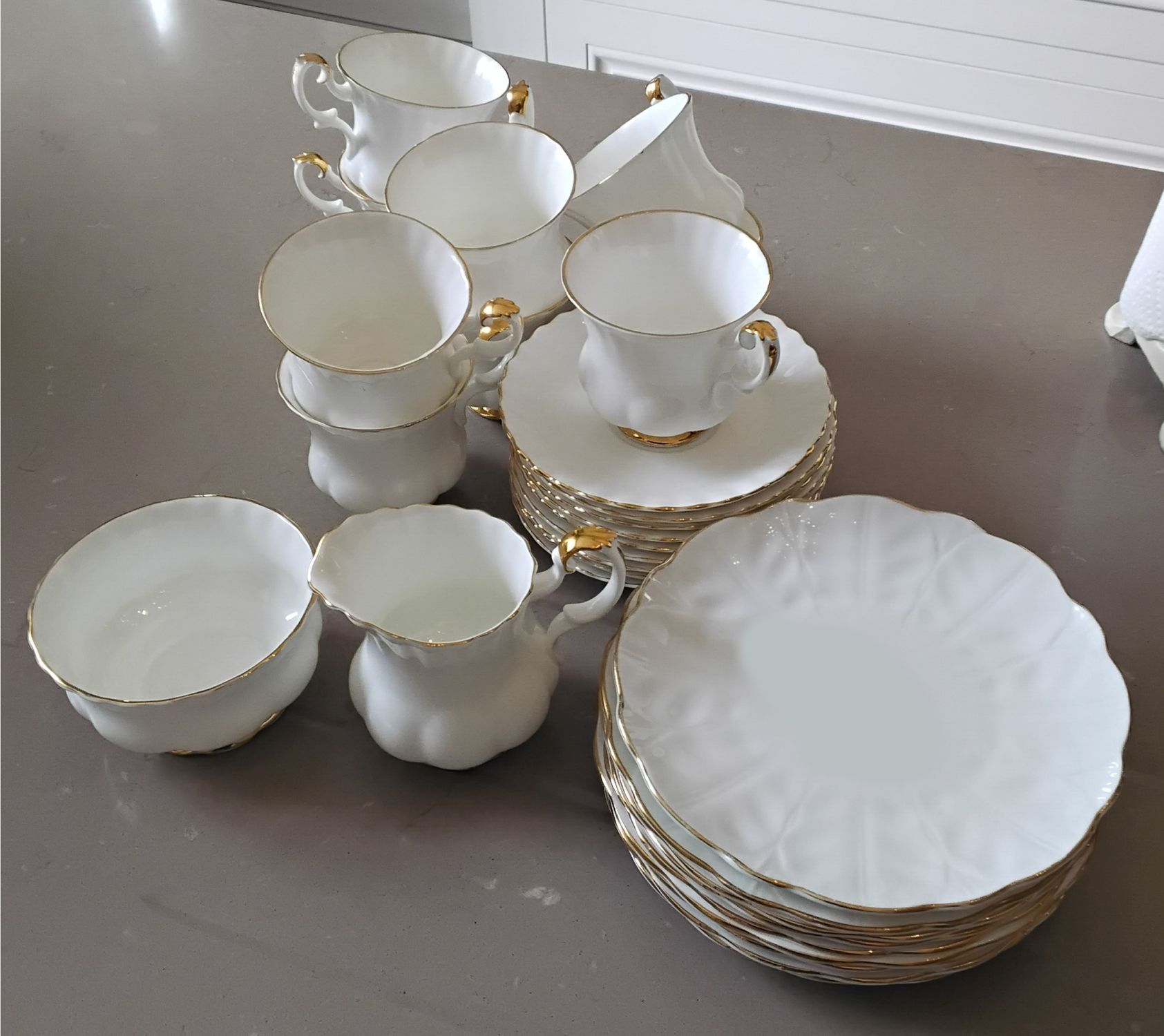 A 29-piece Royal Worcester porcelain tea and coffee set in white with gently fluted moulded bodies and gilded rims, comprising teacups, coffee cans, saucers, plates, cream jug, and sugar bowl — refined service ware from one of England’s finest makers.