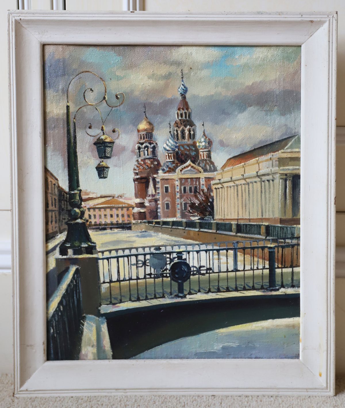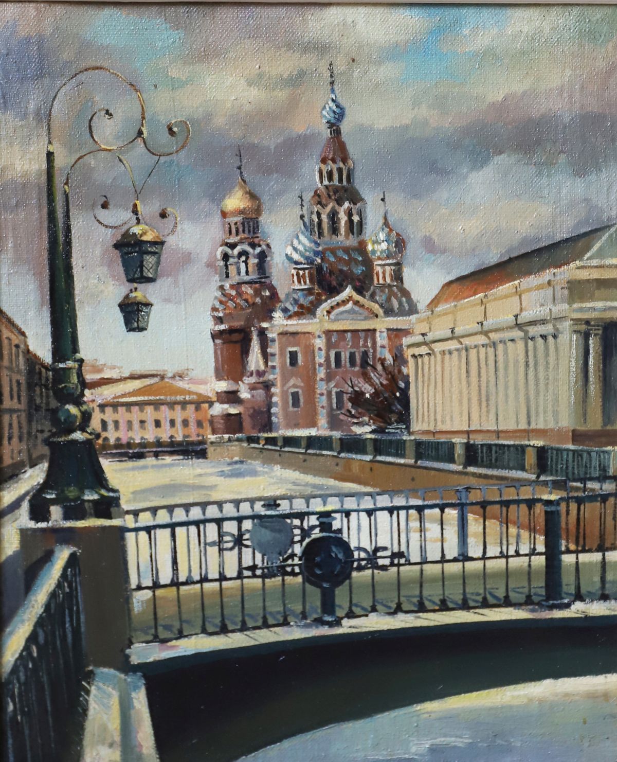 Urban river landscape with Orthodox church and bridge, painted in a strong tonal palette. Framed. Oil on canvas. 20th century.