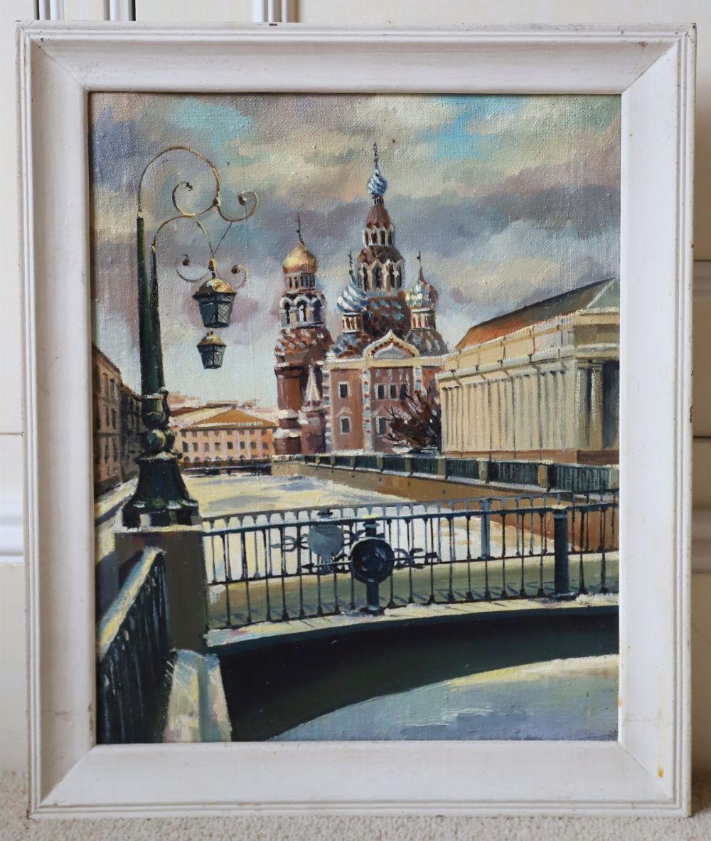 Lot 701 RUSSIAN SCHOOL - STREET AND RIVER SCENE WITH ORTHODOX CHURCH