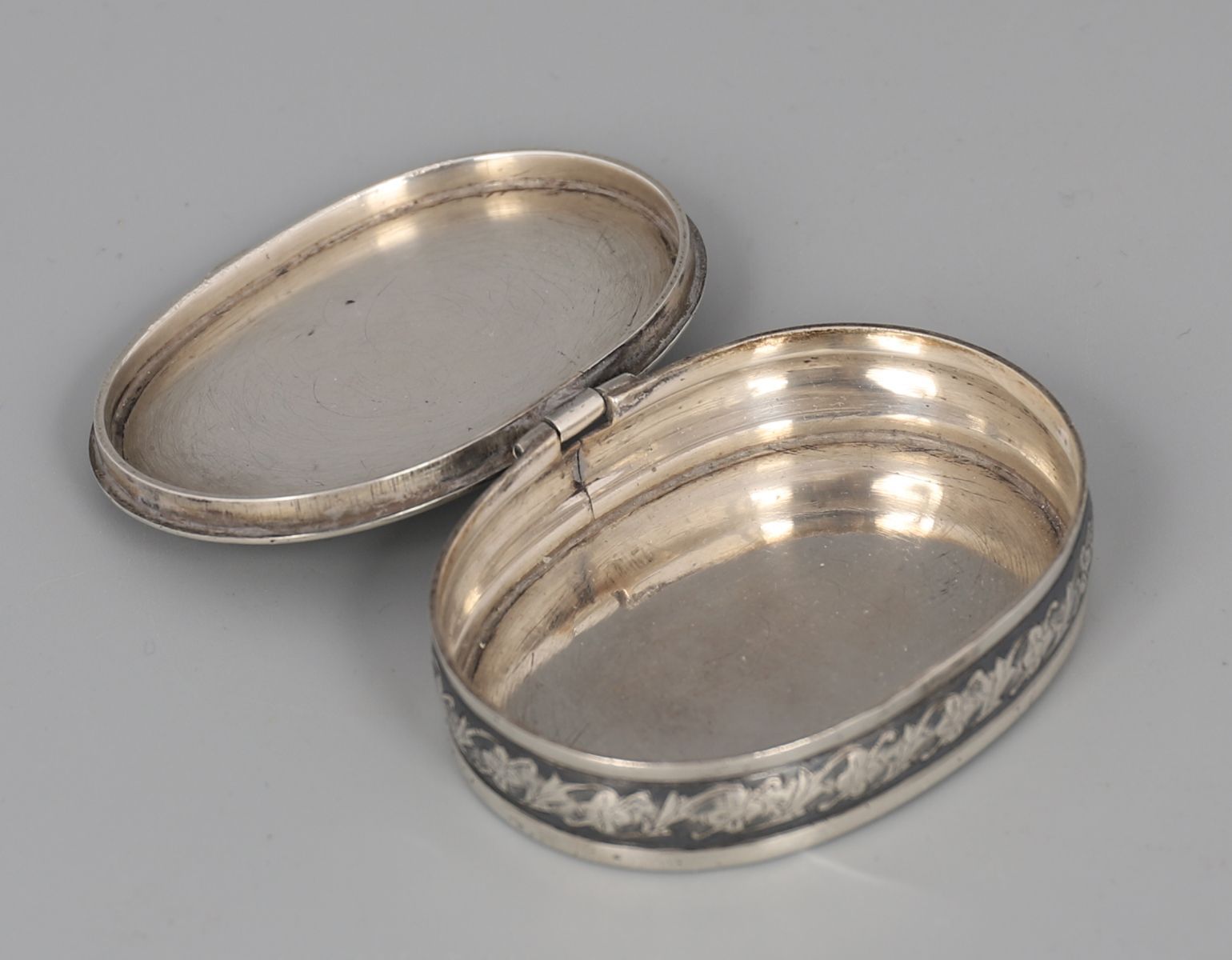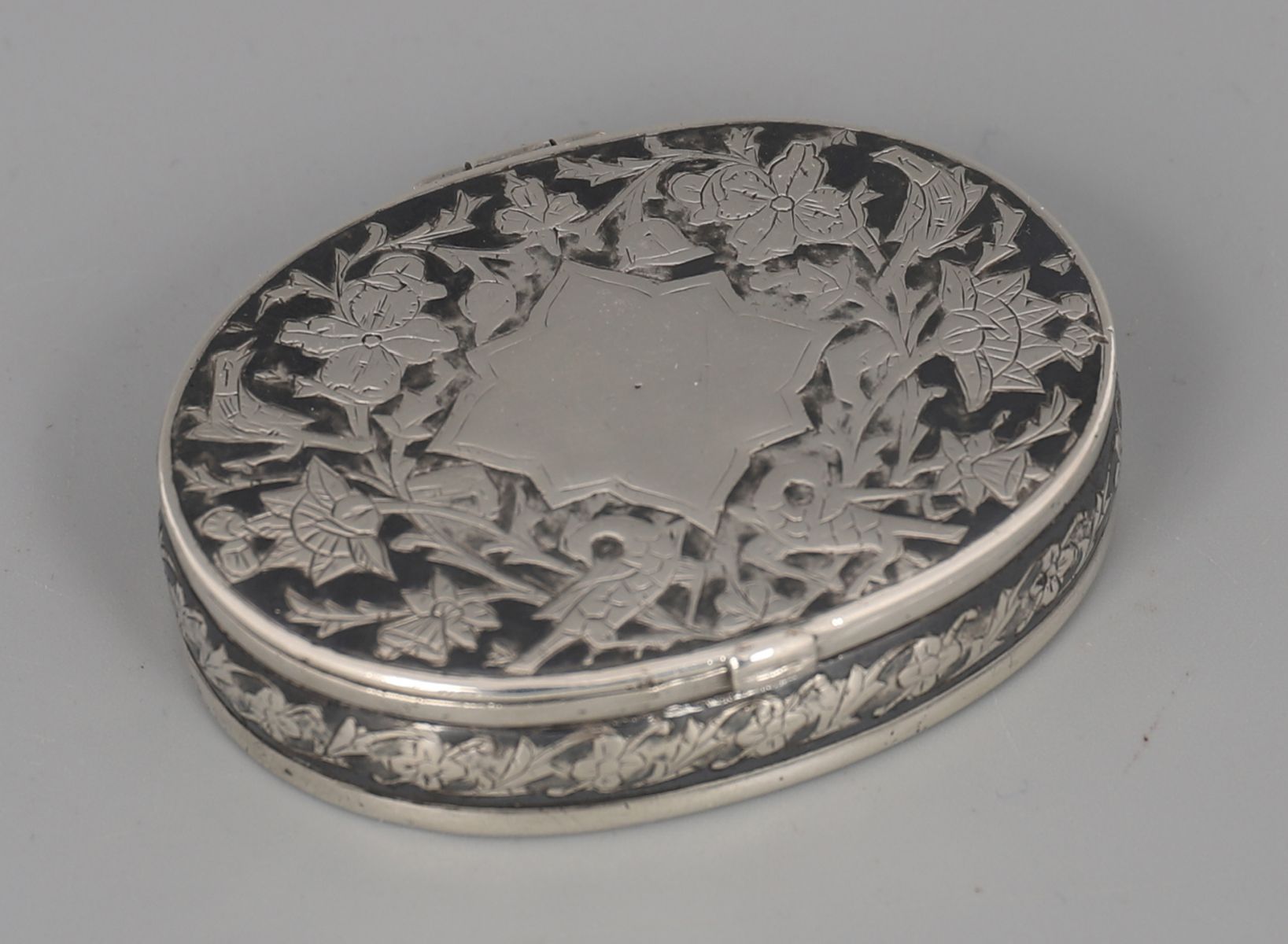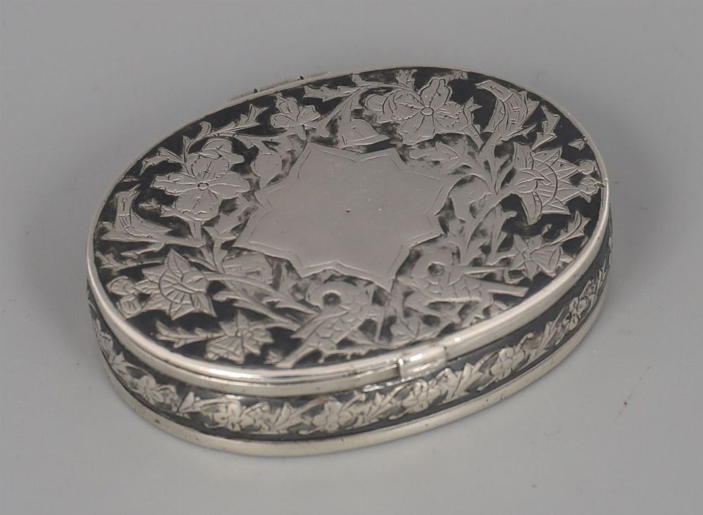 An 18th / early 19th century Russian silver oval snuff box, the hinged cover decorated with scrolling foliage and cartouche within niello borders