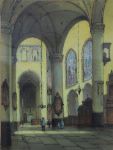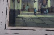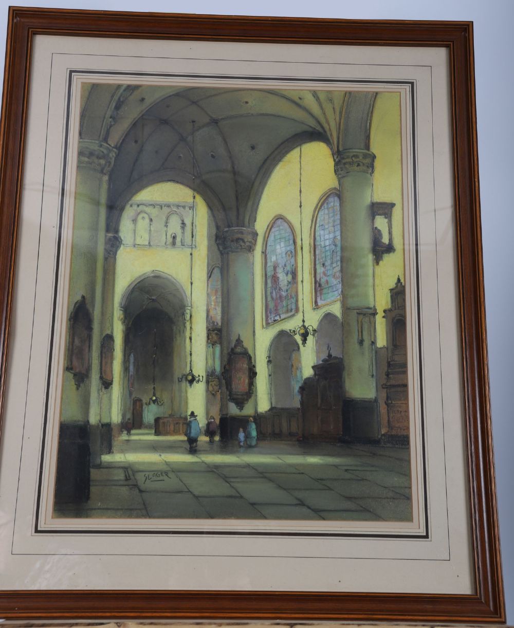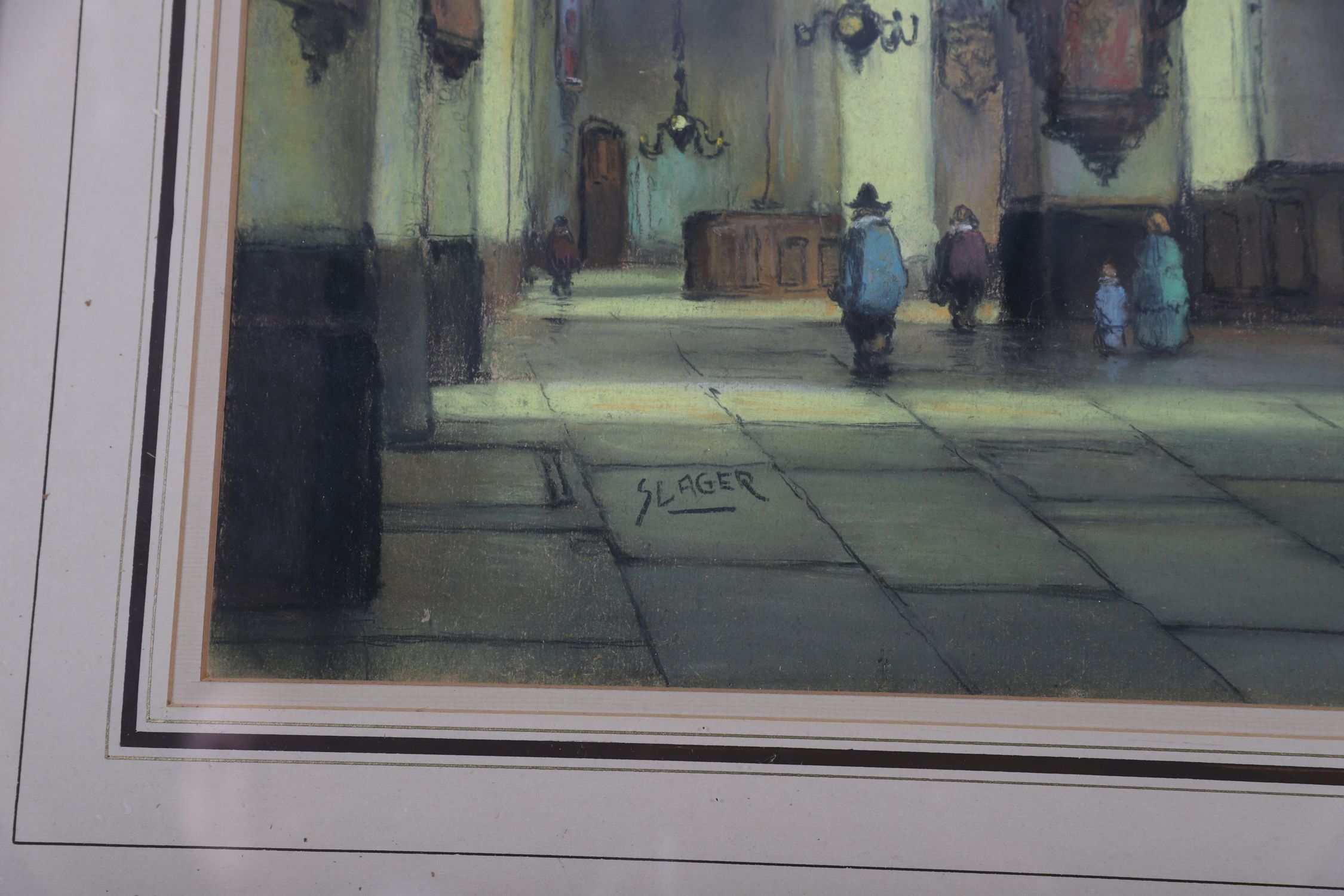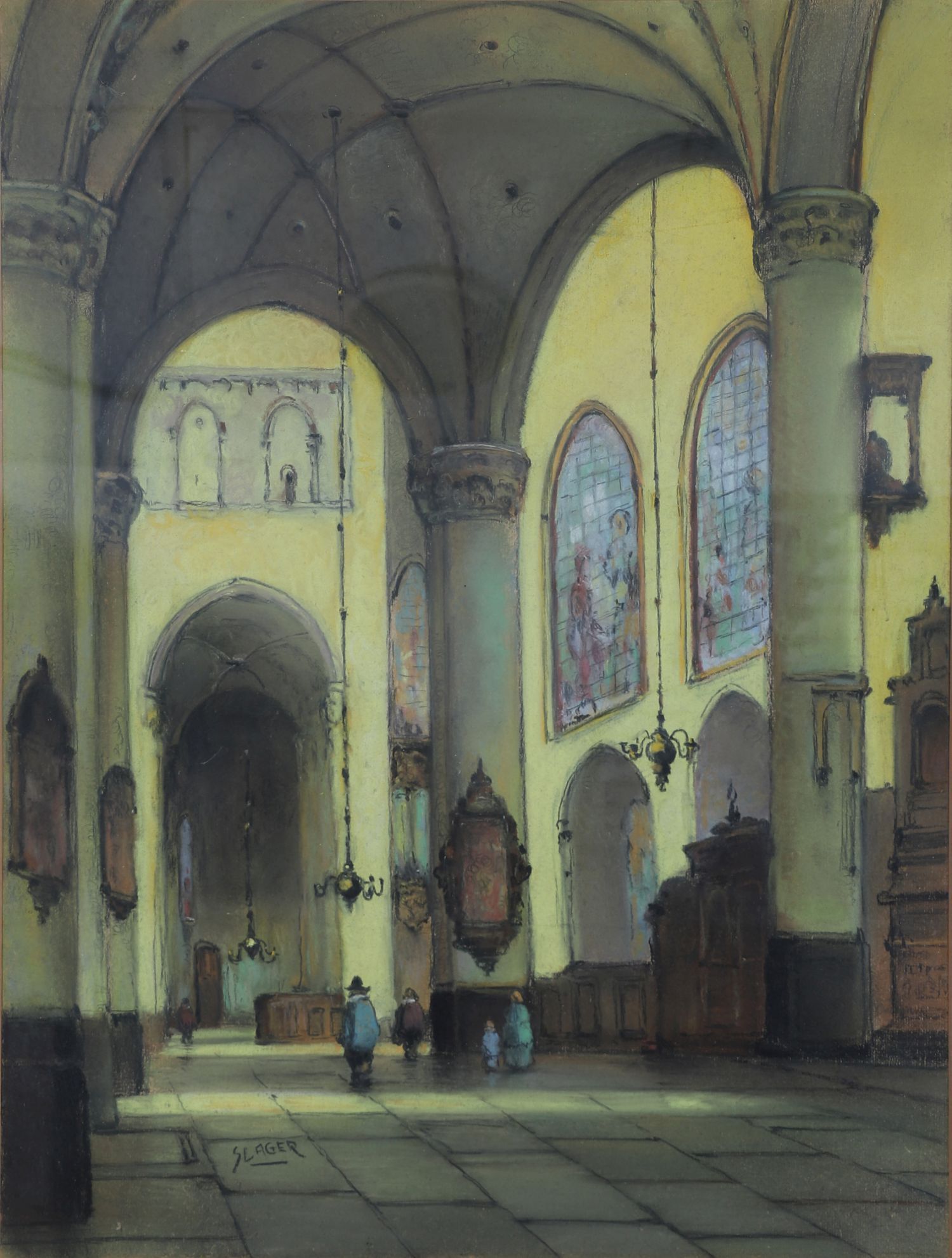 Watercolour depicting a luminous church interior with stained glass and congregants. Signed lower left “S. Lager”. Framed and glazed. Signed watercolour. Framed.