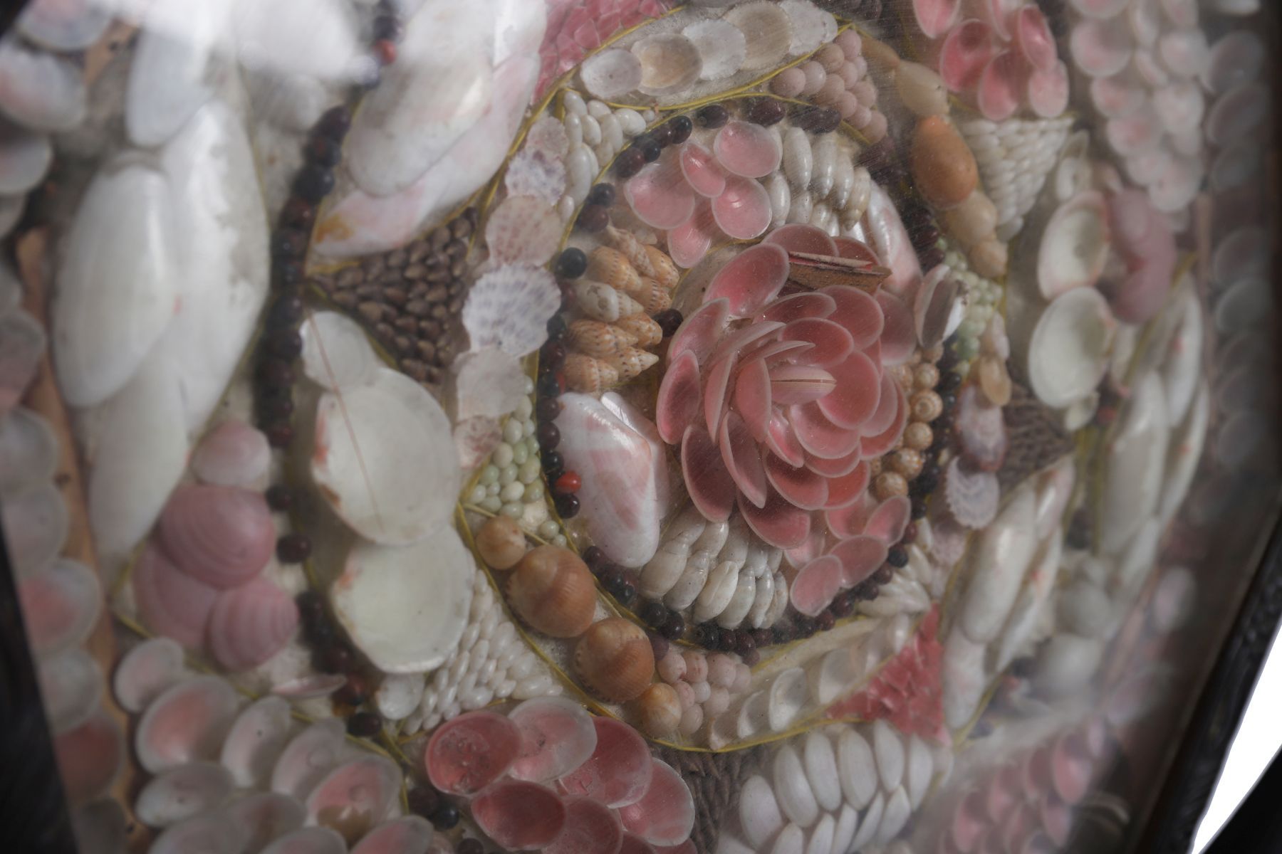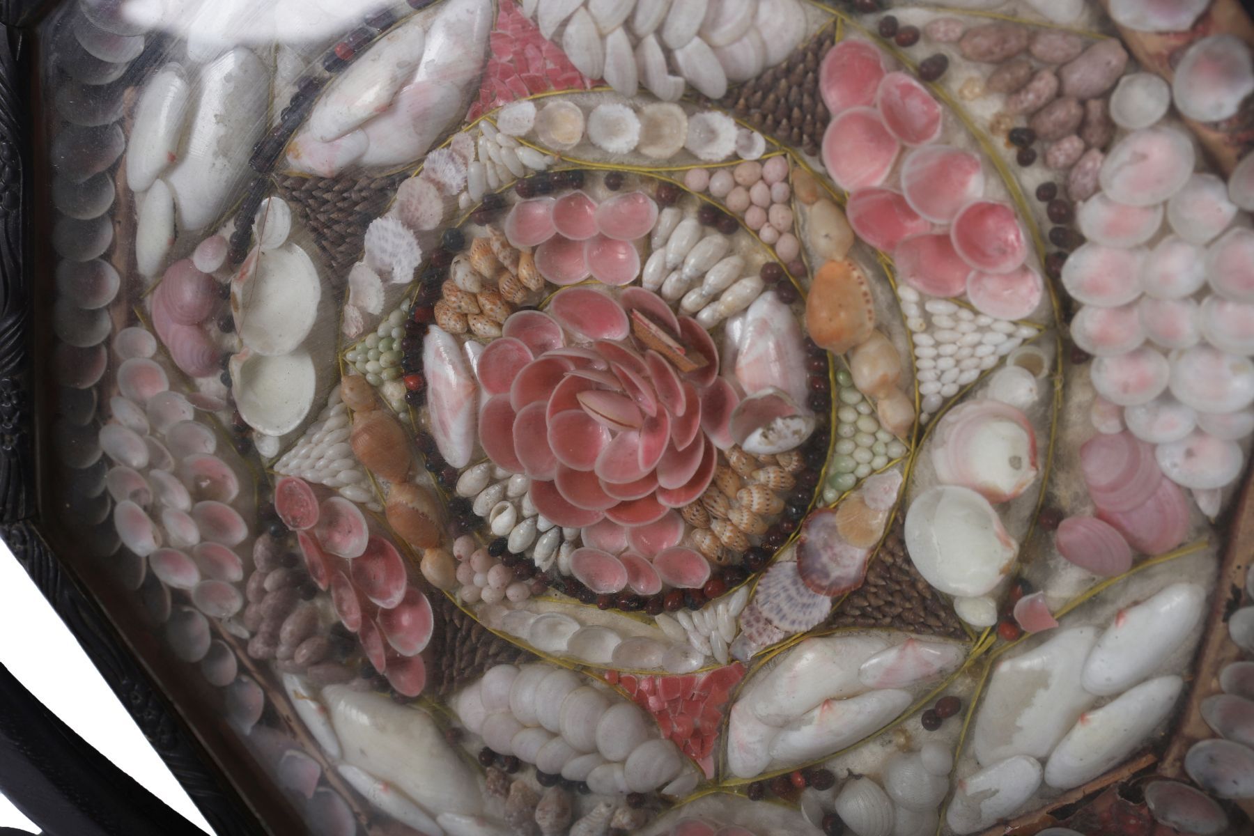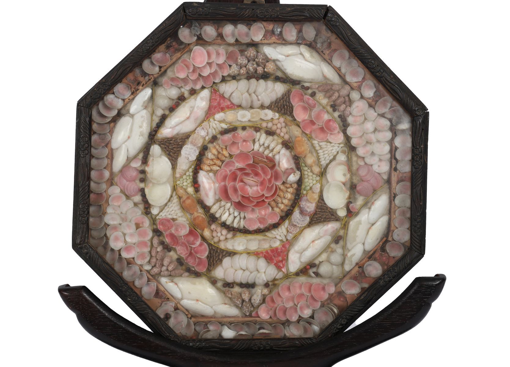 An octagonal framed sailor’s valentine, composed of a concentric floral design crafted from an array of natural seashells in shades of pink, cream, and coral, under glass. The intricate shellwork is arranged with fine symmetry within a carved wooden frame.