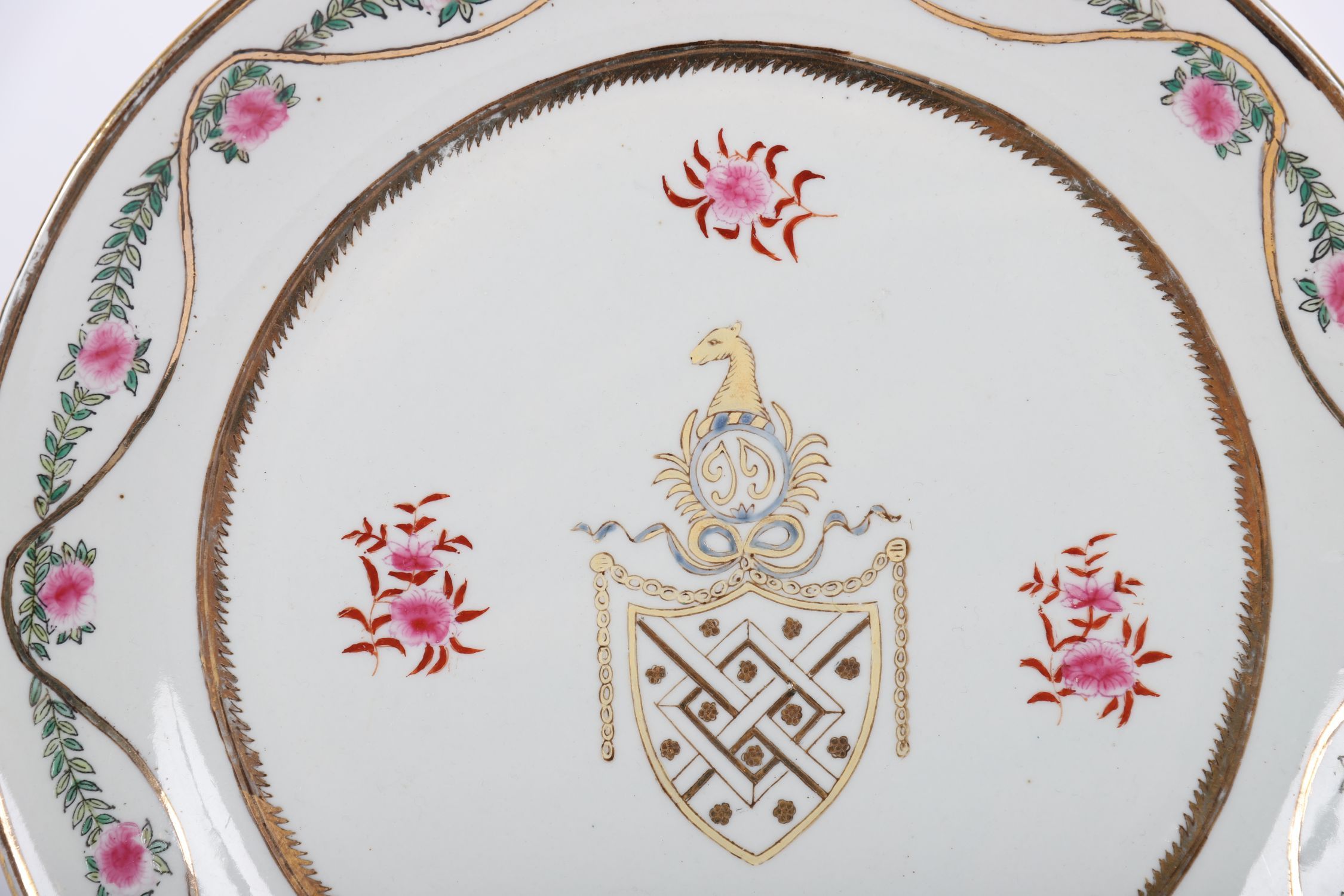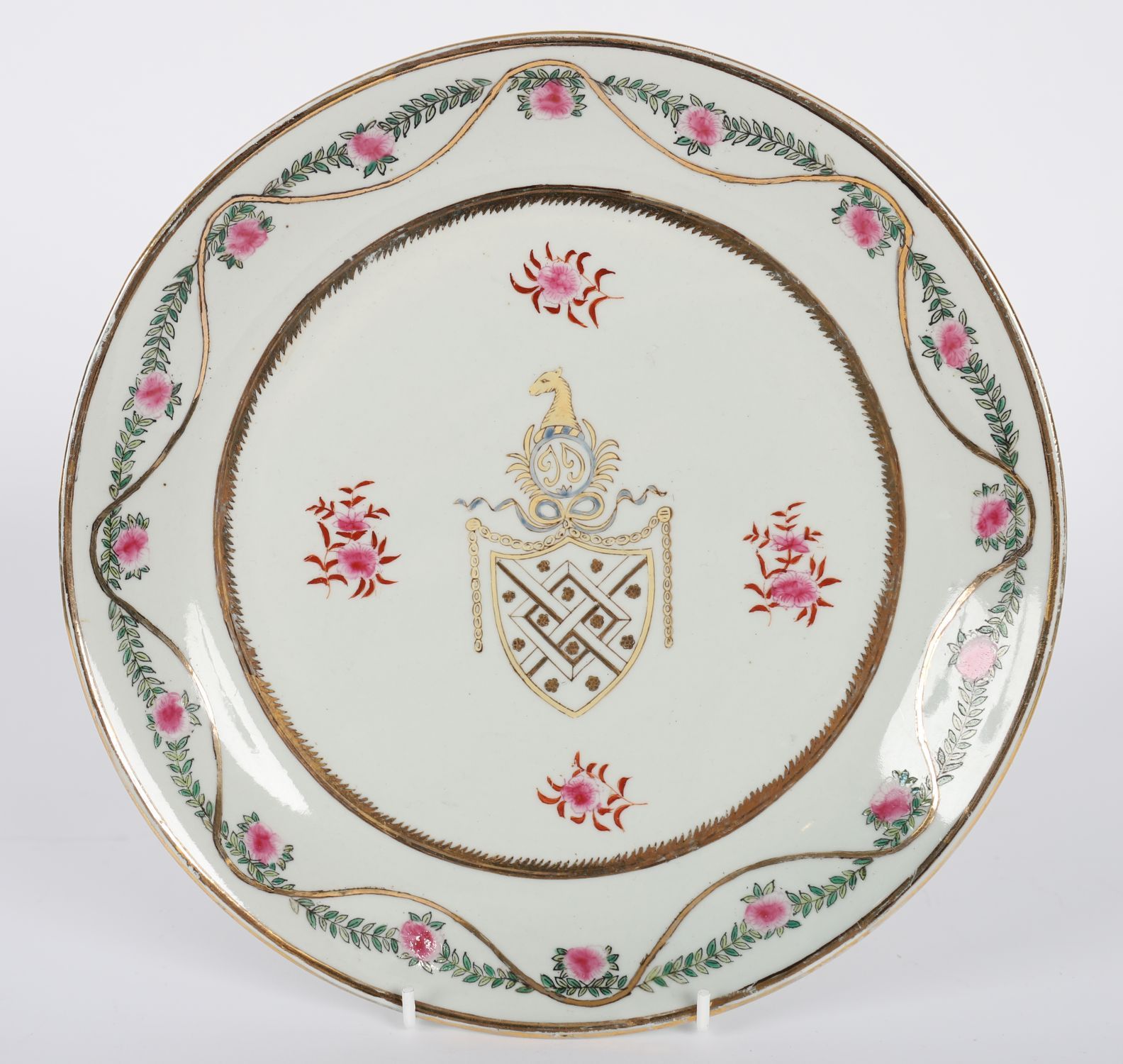 A porcelain plate in the manner of Samson of Paris, decorated in famille rose palette with a central armorial-style crest, incorporating a shield and helm flanked by floral sprays. The rim painted with entwined gilt ribbon and rose garlands on a white ground. Unmarked. Likely 19th-century European porcelain imitating Chinese export armorial wares.