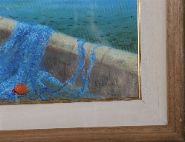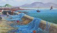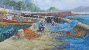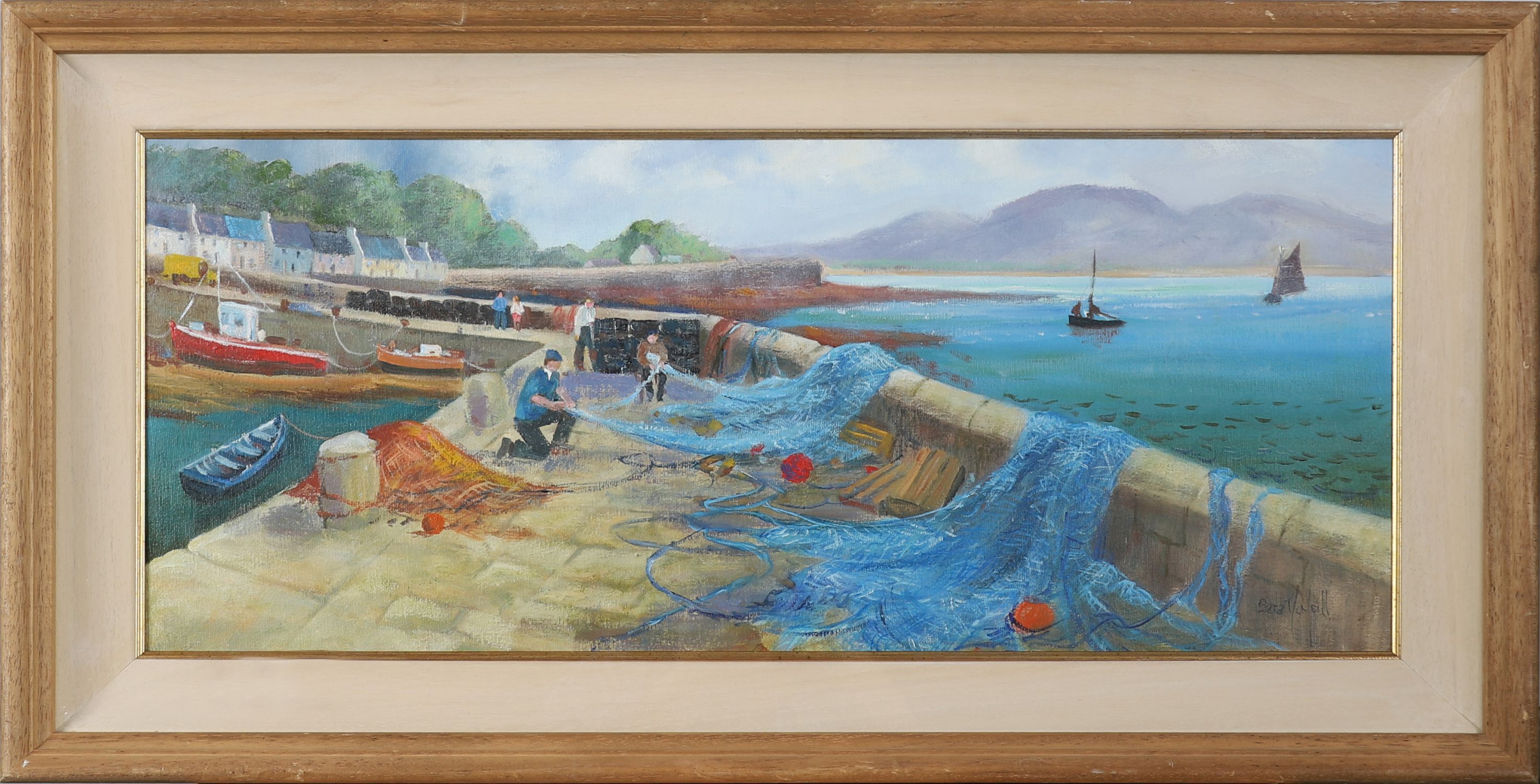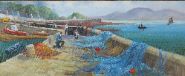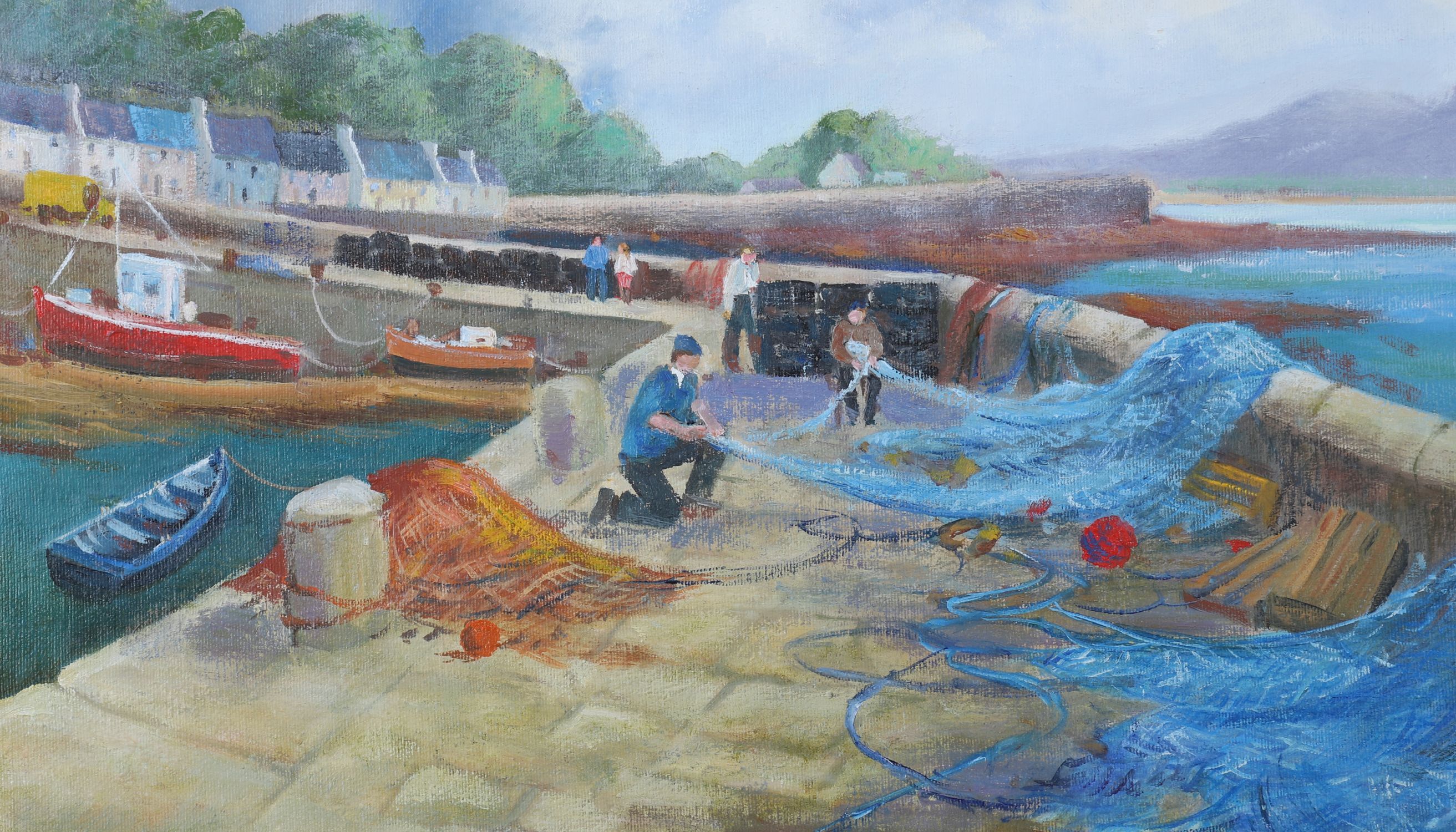 Description: A panoramic view of a harbour pier with fishermen working over bright blue nets. Mountains rise in the background. Signed lower right.