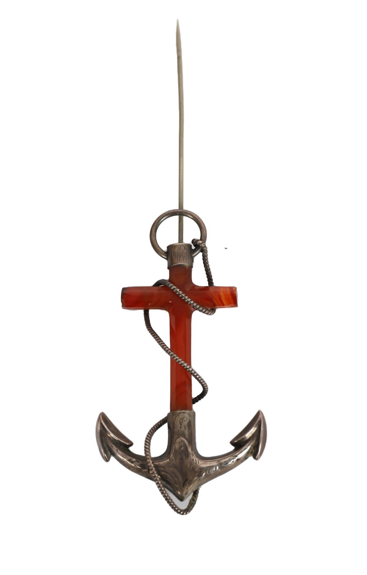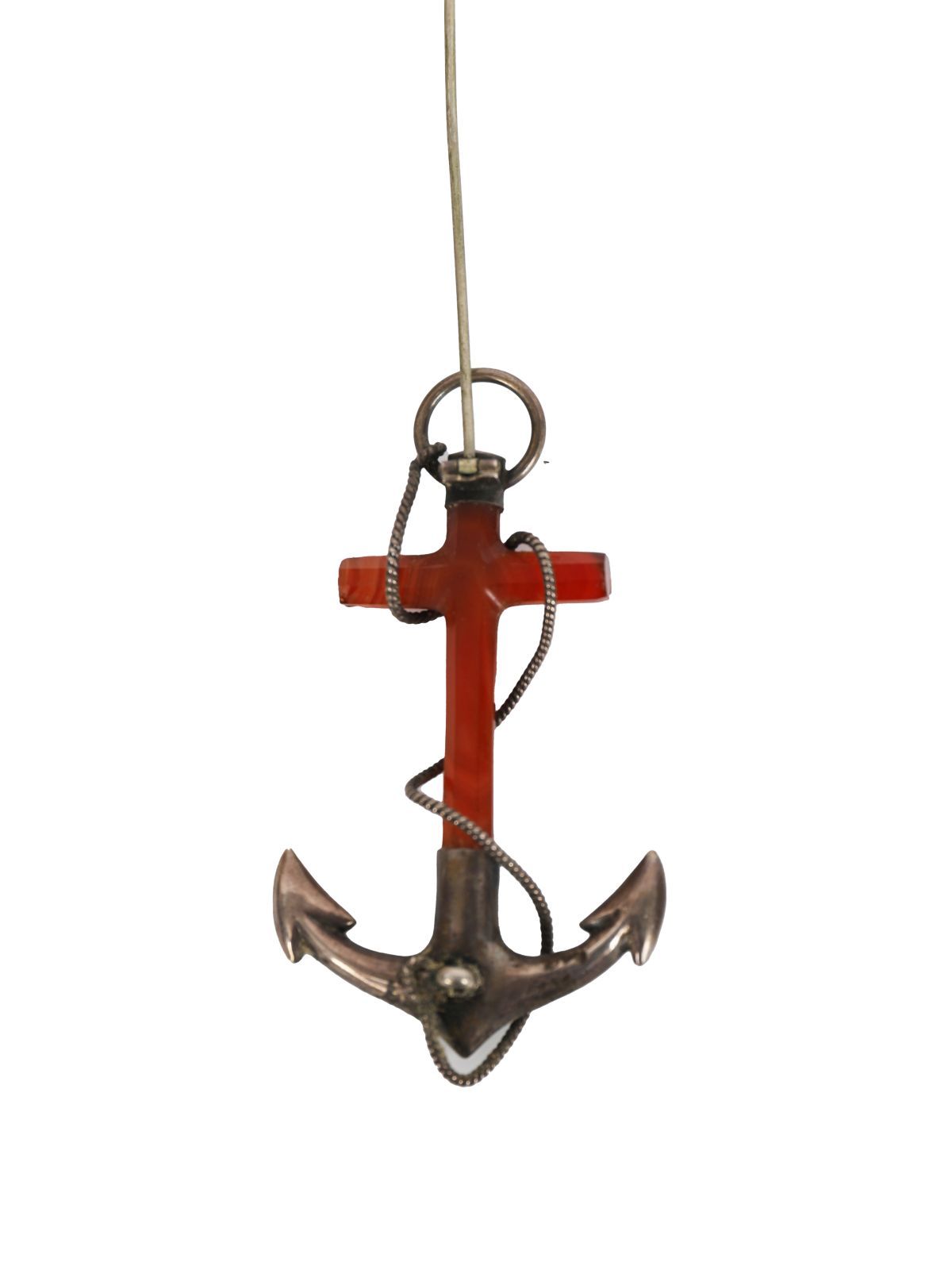 A 19th-century Scottish agate and silver anchor-form pendant, set with polished carnelian cross and detailed silver rope and mounts.