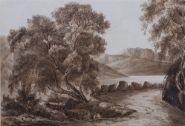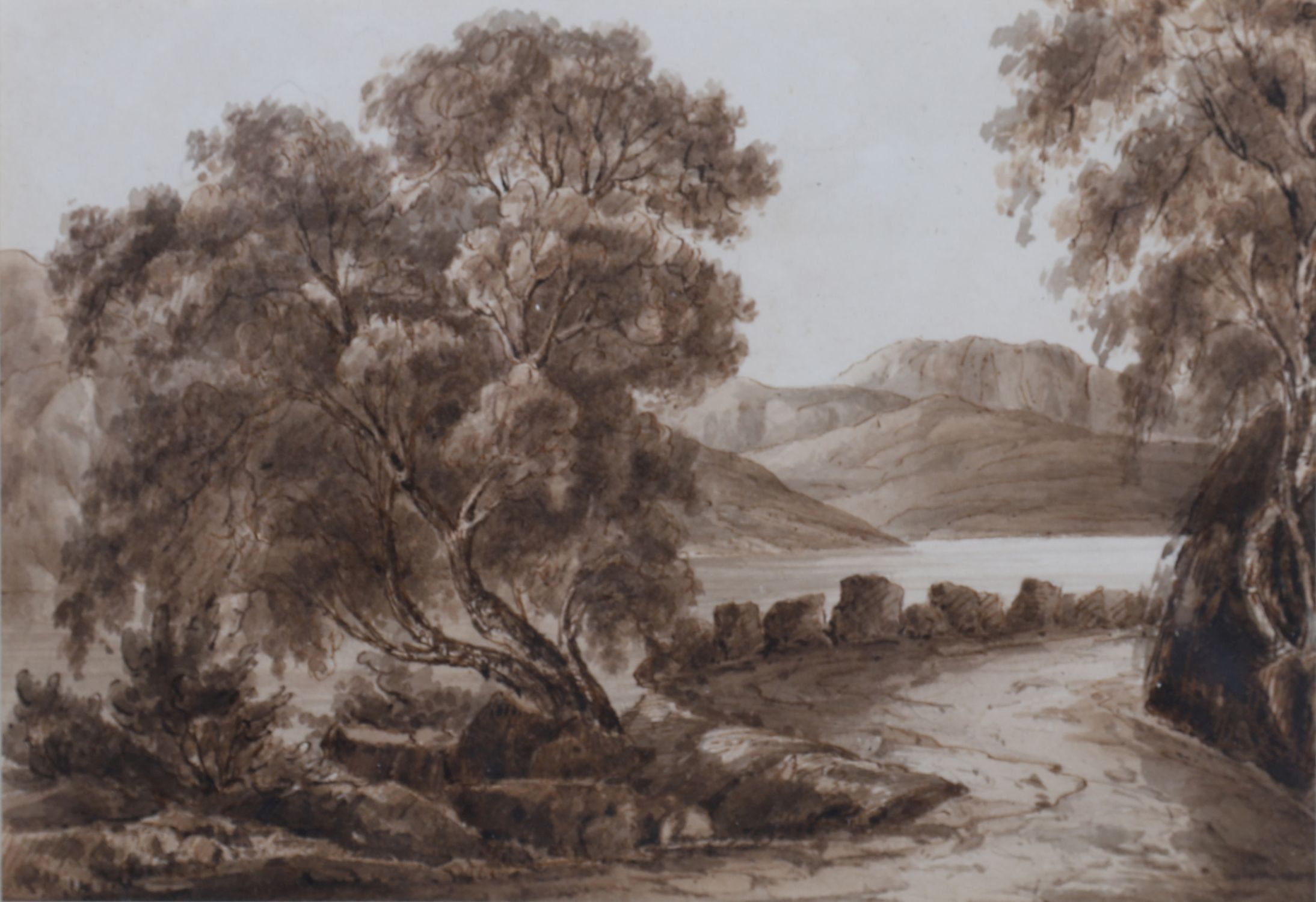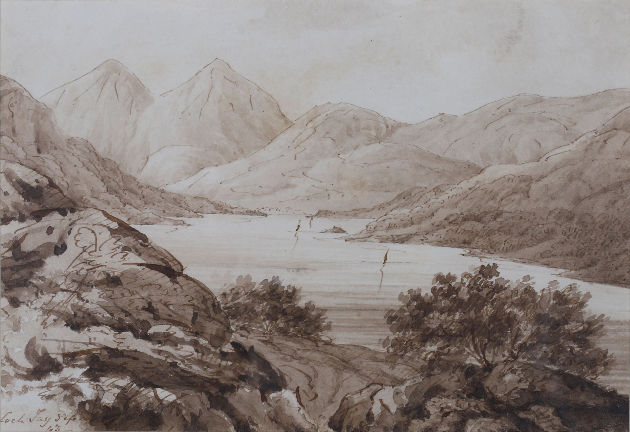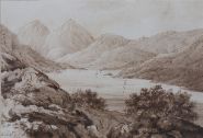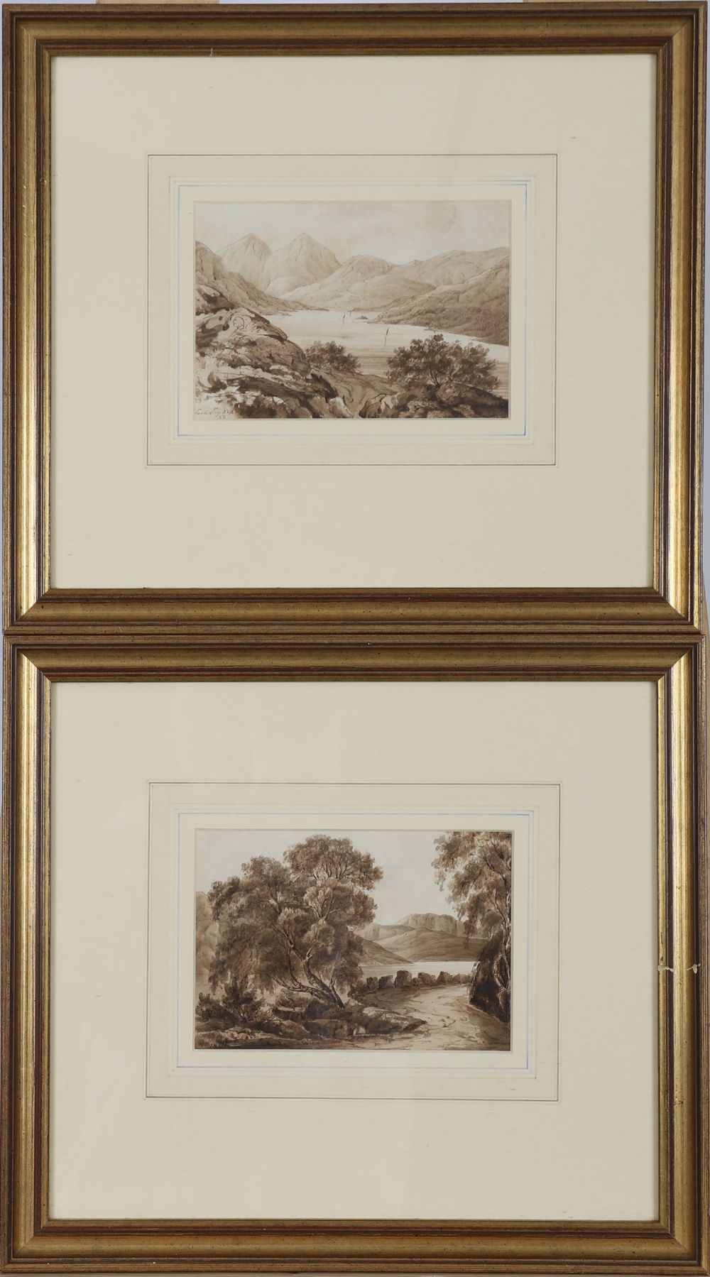 Lough Foy; Mountain landscape. Each enclosed in a gilt frame. Sepia watercolour.