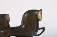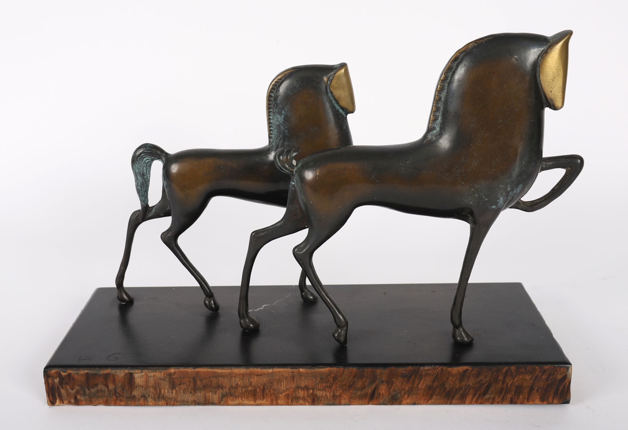 A modernist-style sculpture depicting two stylised horses in stride, rendered in patinated metal with simplified, elongated forms. The horses feature brass-toned heads and tails, with minimalist detailing suggestive of the influence of Alberto Giacometti. Mounted on a rectangular black plinth with a faux-burlwood edge.
