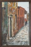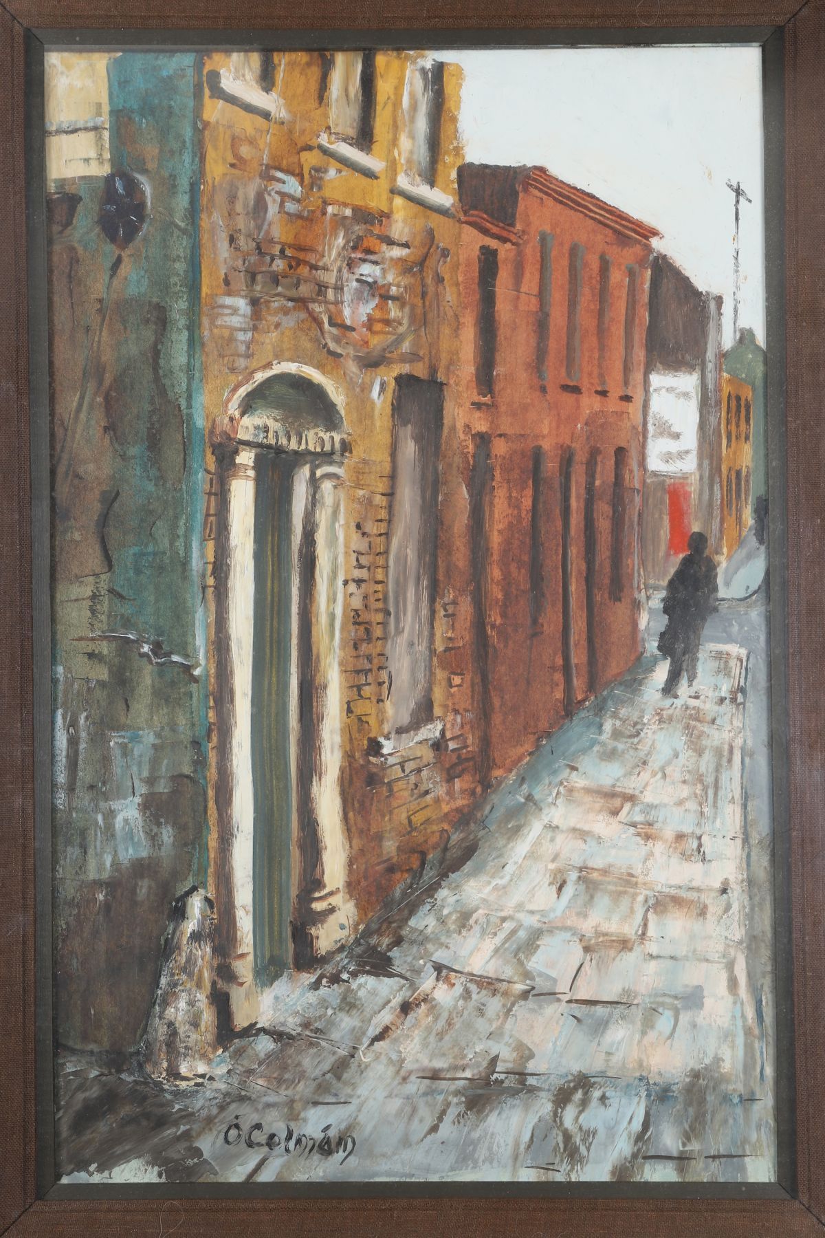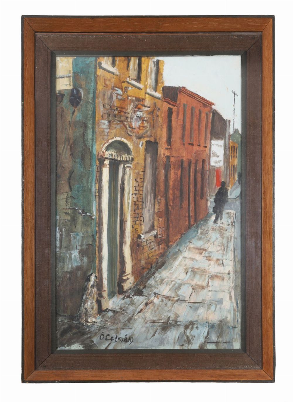 Oil on board showing a Dublin street lined with aged brick buildings, a lone figure walking under evening light. Signed lower left Ó Colmáin.