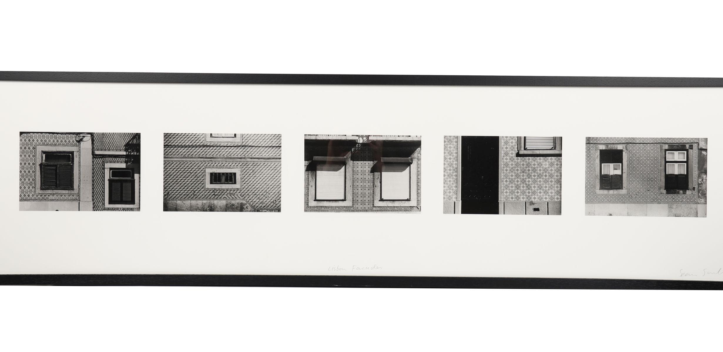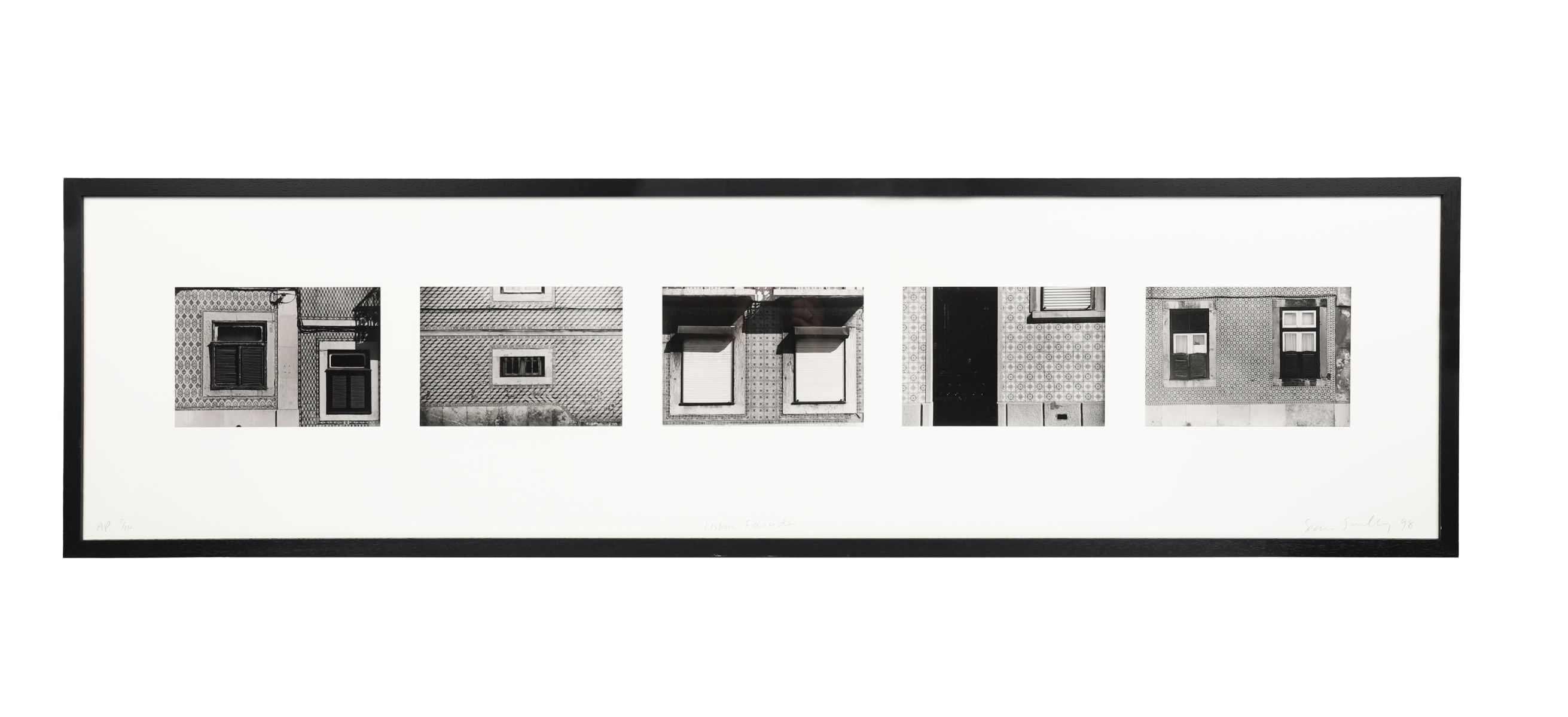 Limited edition silver gelatin print, No. 5 from an edition of 25, titled Lisbon Facades. Depicts a sequence of urban architectural details in black and white. Signed lower right, titled lower centre, and numbered lower left. Professionally framed and glazed.