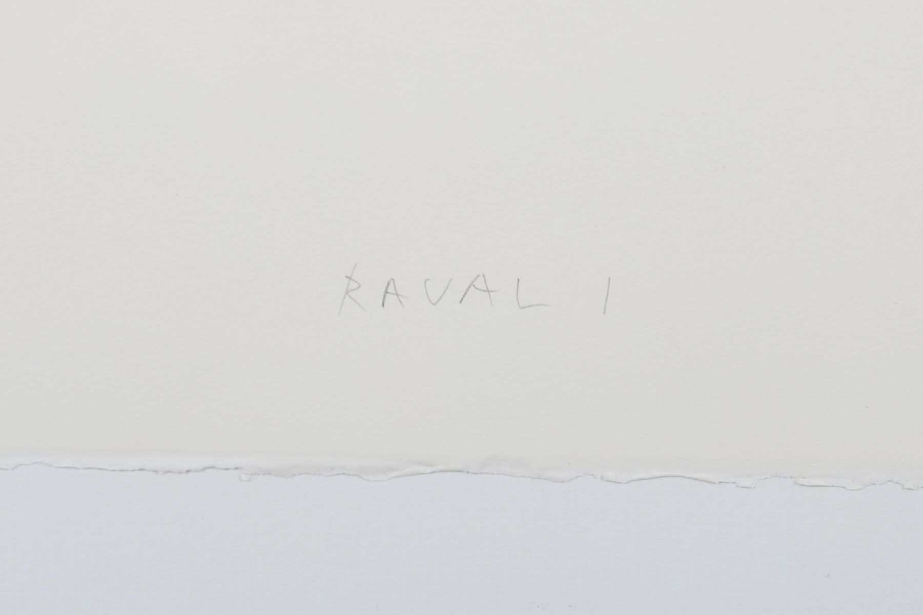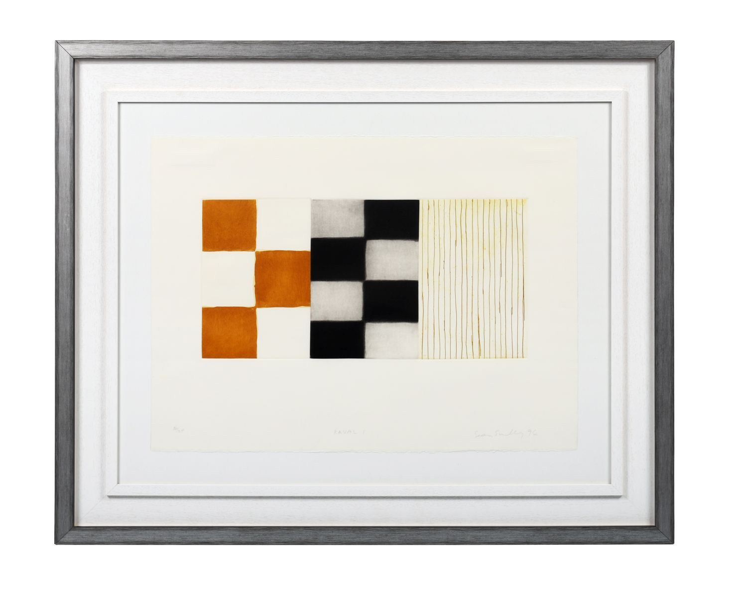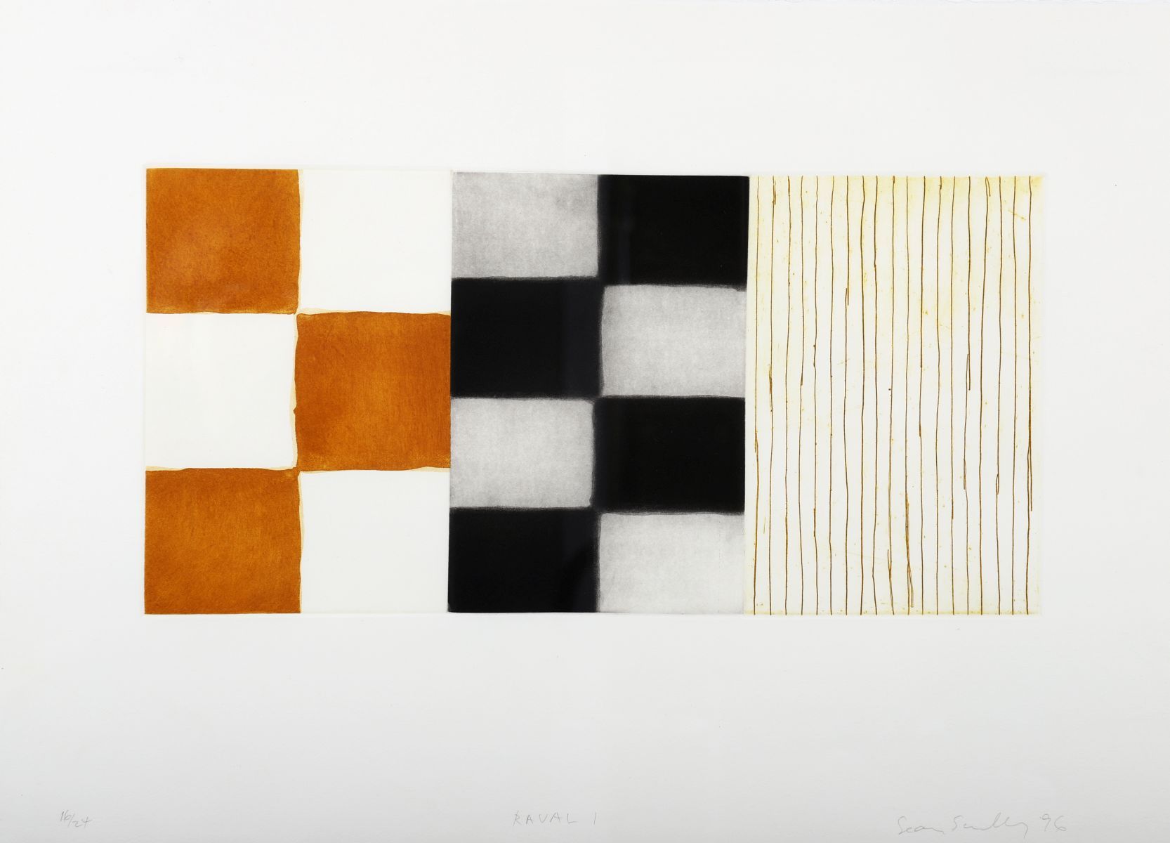 A limited edition etching and aquatint by Sean Scully titled Raval I, 1996. The composition features Scully’s signature interplay of geometric forms — ochre, black, and cream blocks contrasted with linear elements — creating a harmonious tension between structure and emotion. Signed, dated, and titled in pencil to the lower margin; numbered from a limited edition. Presented in a modern silvered frame.
