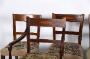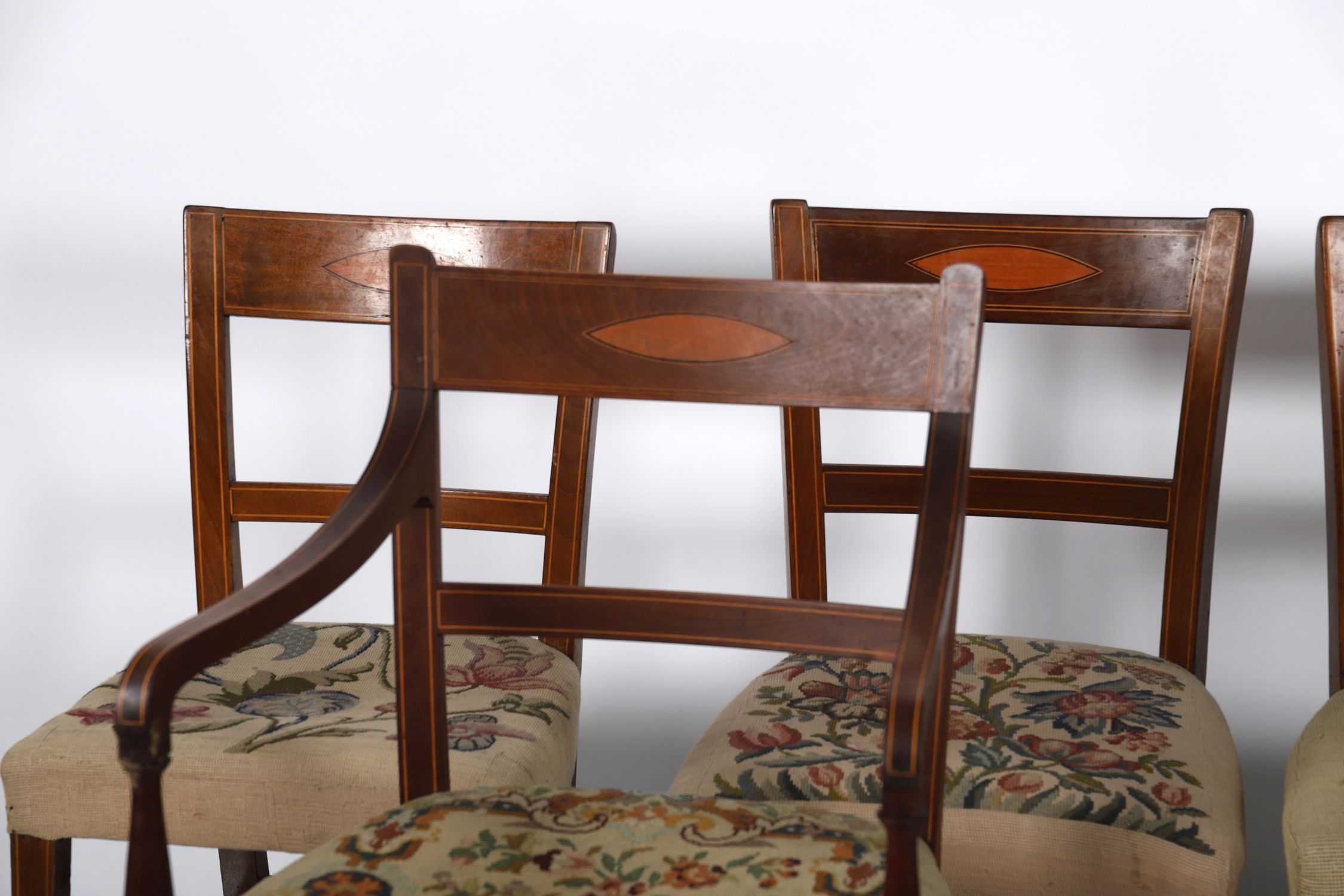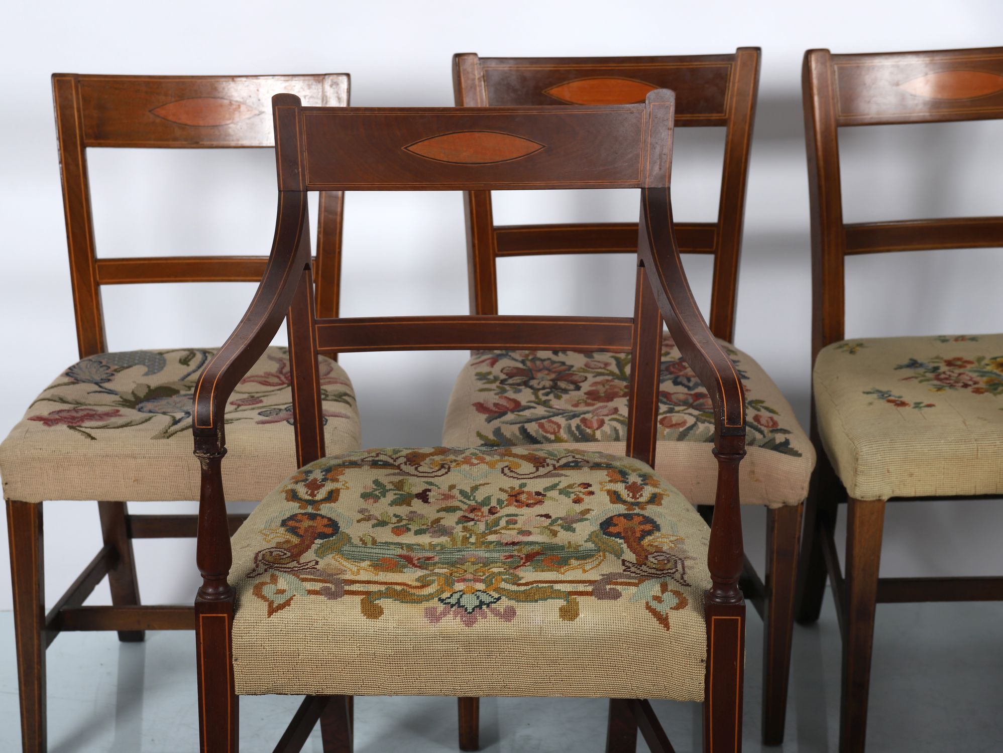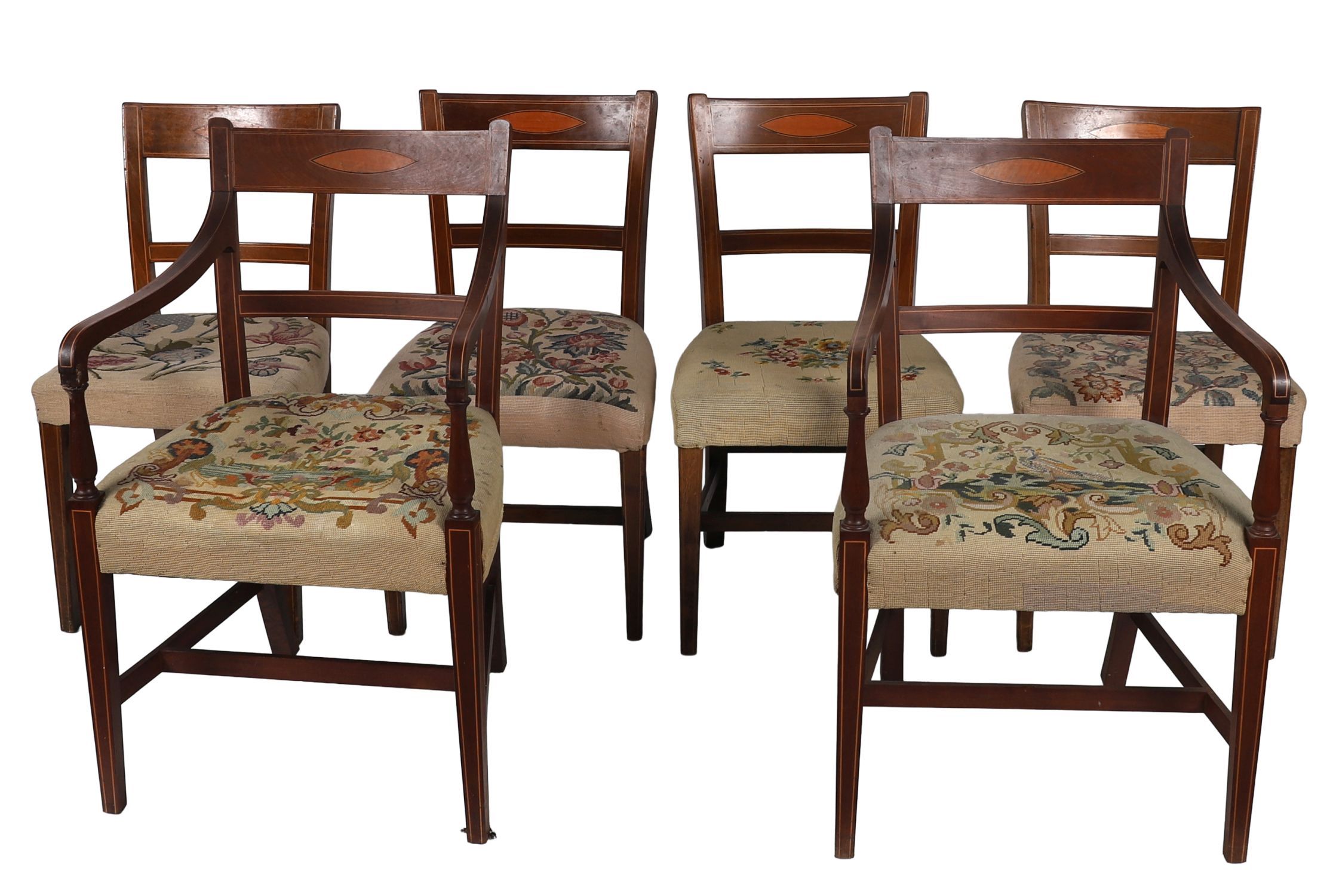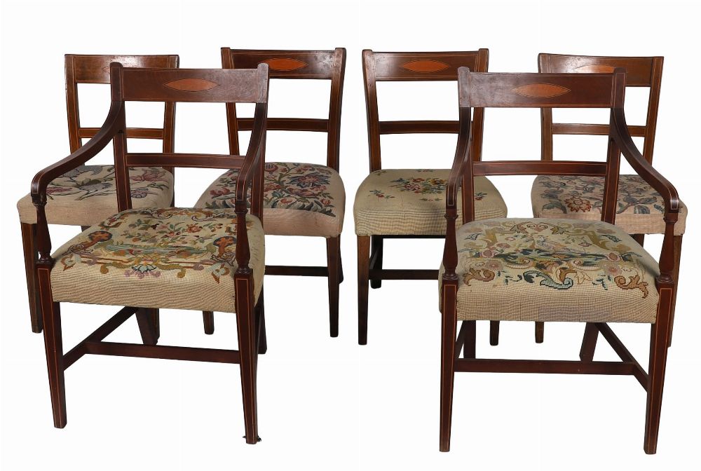 A fine set of twelve Sheraton-style mahogany dining chairs by Hicks of Dublin, comprising ten side chairs and two open armchairs. Each with inlaid tablet back, shaped top rail, and square tapering legs joined by H-stretchers. Upholstered with stuff-over tapestry seats, worked in a classical floral design.