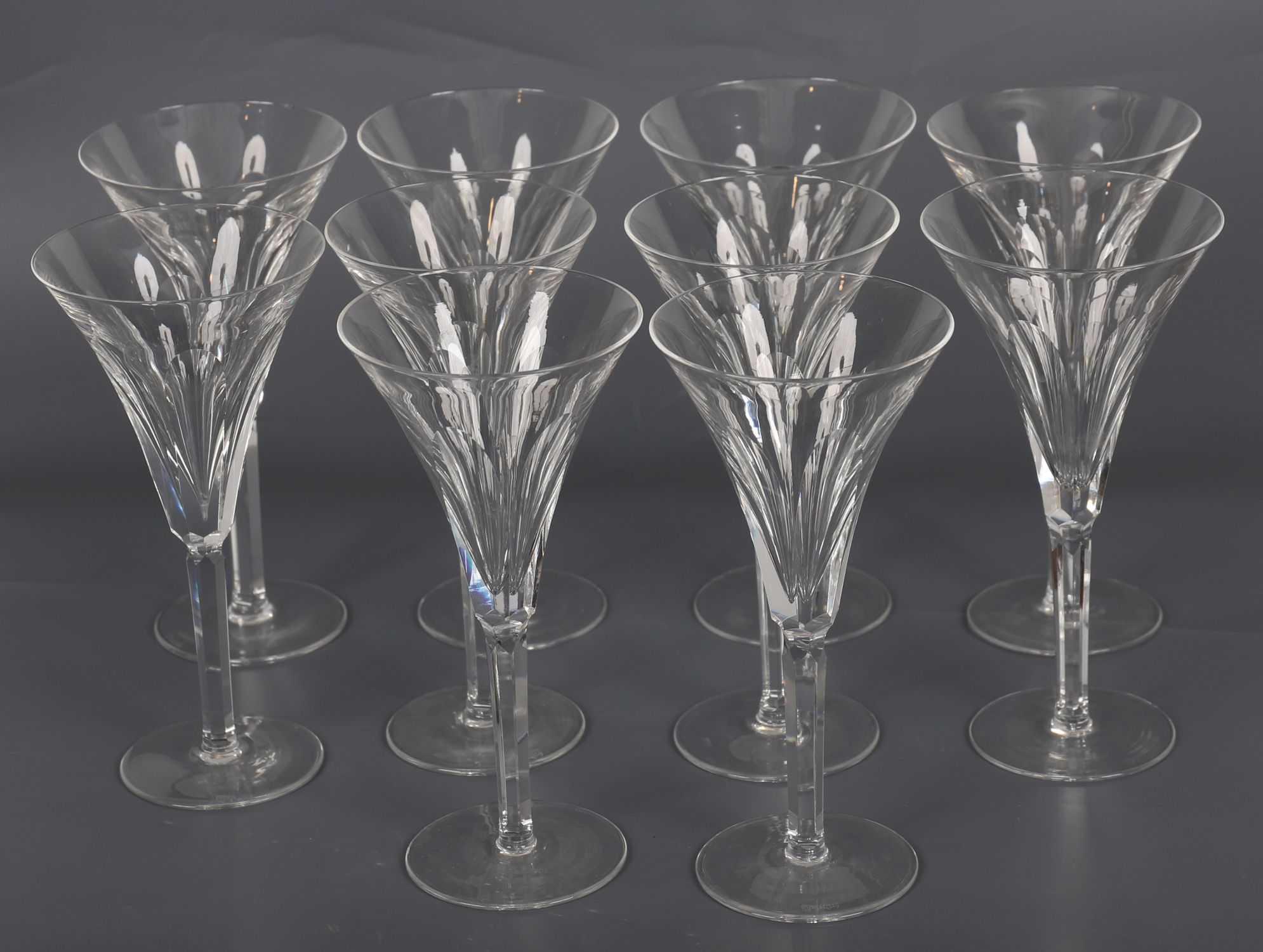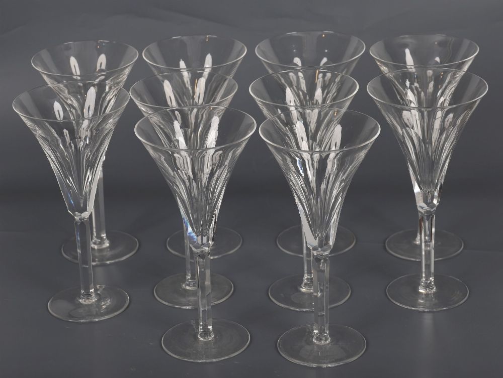 A set of ten elegant Waterford Crystal glasses with flared bowls, long stems, and vertical panel cutting. Suitable for champagne, cocktails, or martinis.
