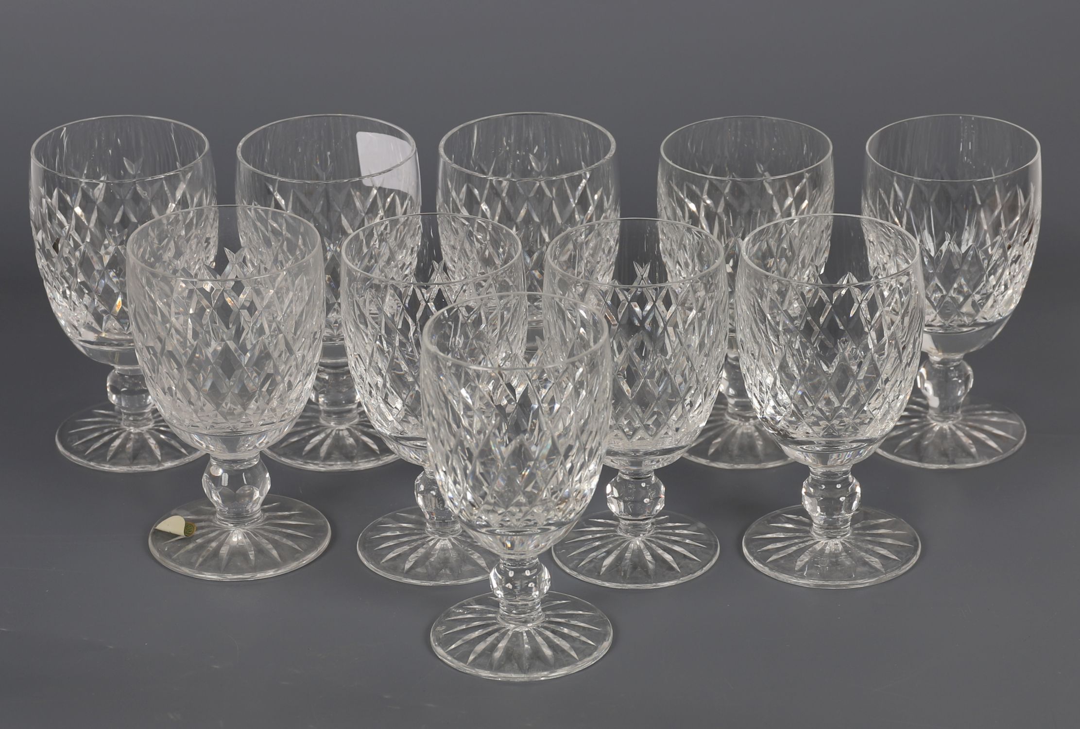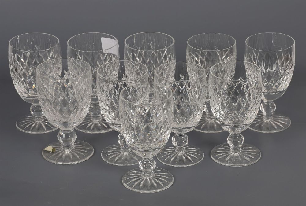 A set of ten Waterford Crystal wine glasses, each with a cut diamond pattern bowl, faceted stem, and star-cut base.
