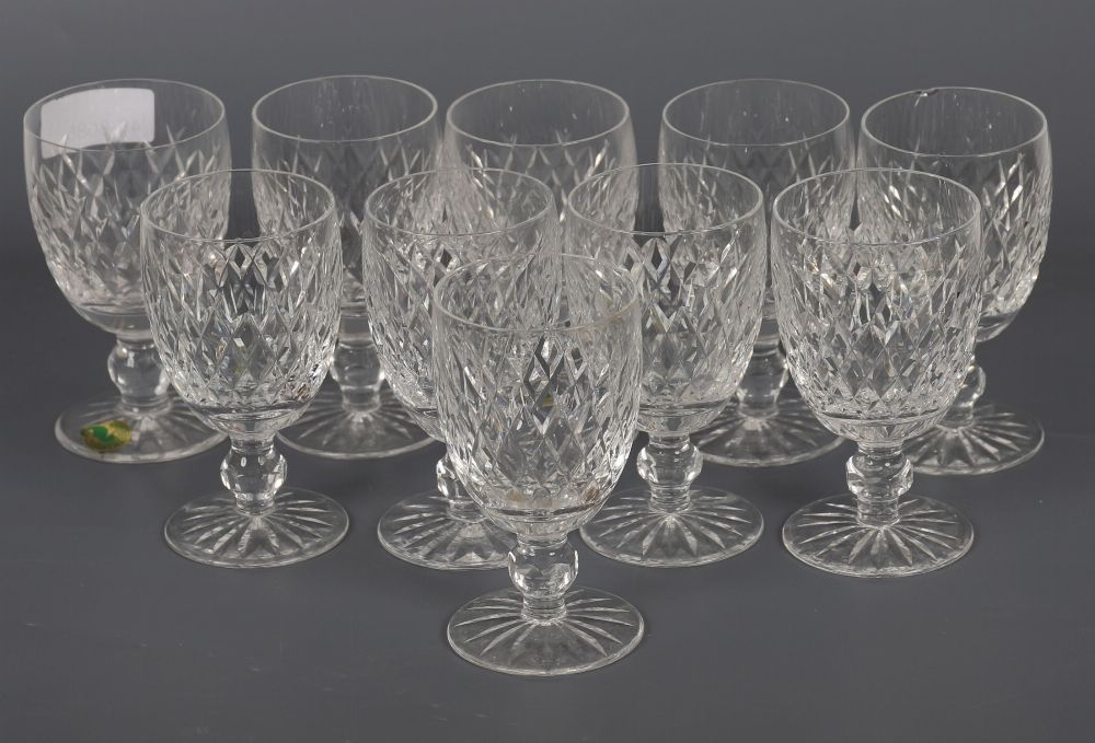 A set of ten Waterford Crystal wine glasses, each with a cut diamond pattern bowl, faceted stem, and star-cut base.