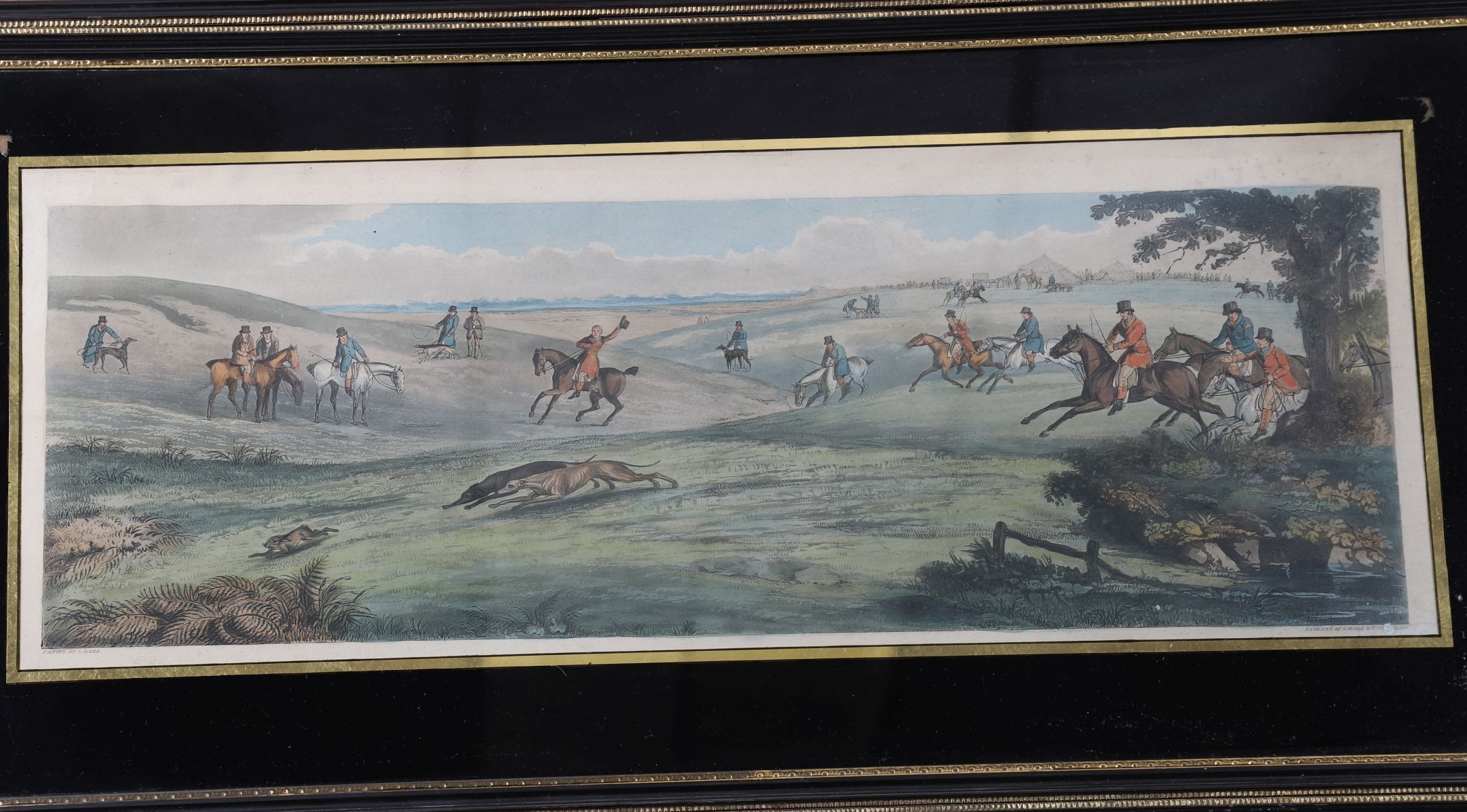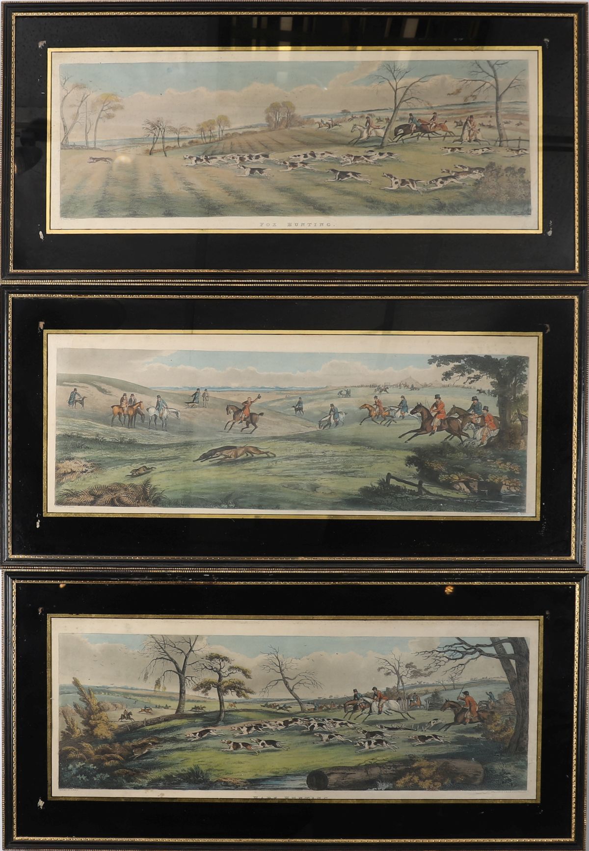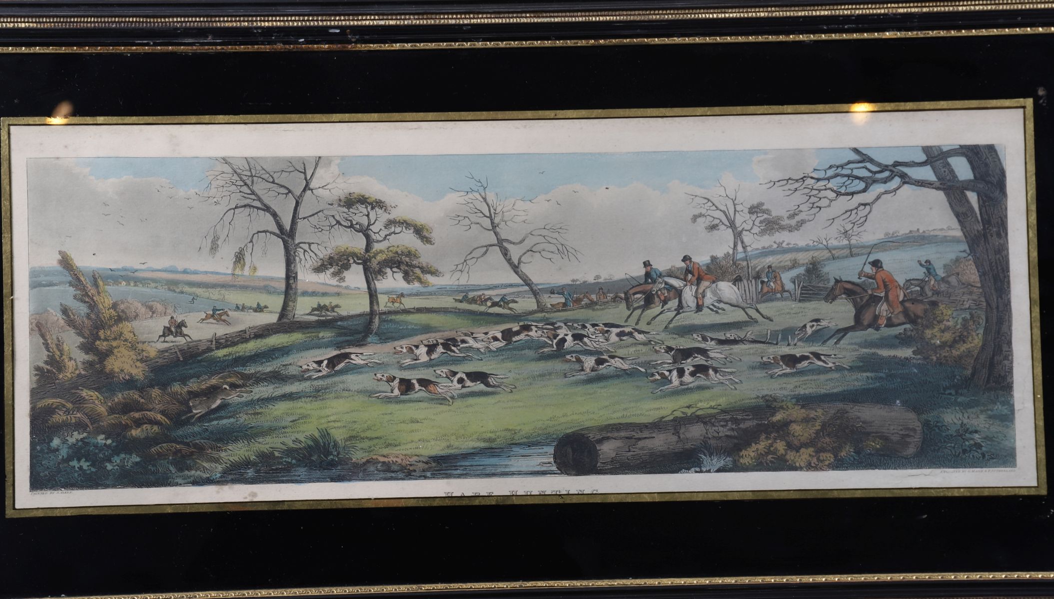 A traditional English sporting print depicting a hare hunting scenes with riders, hounds, and a wooded landscape, after the style of Henry Alken. Hand-coloured, each framed under glass with black and gilt Eloise border.