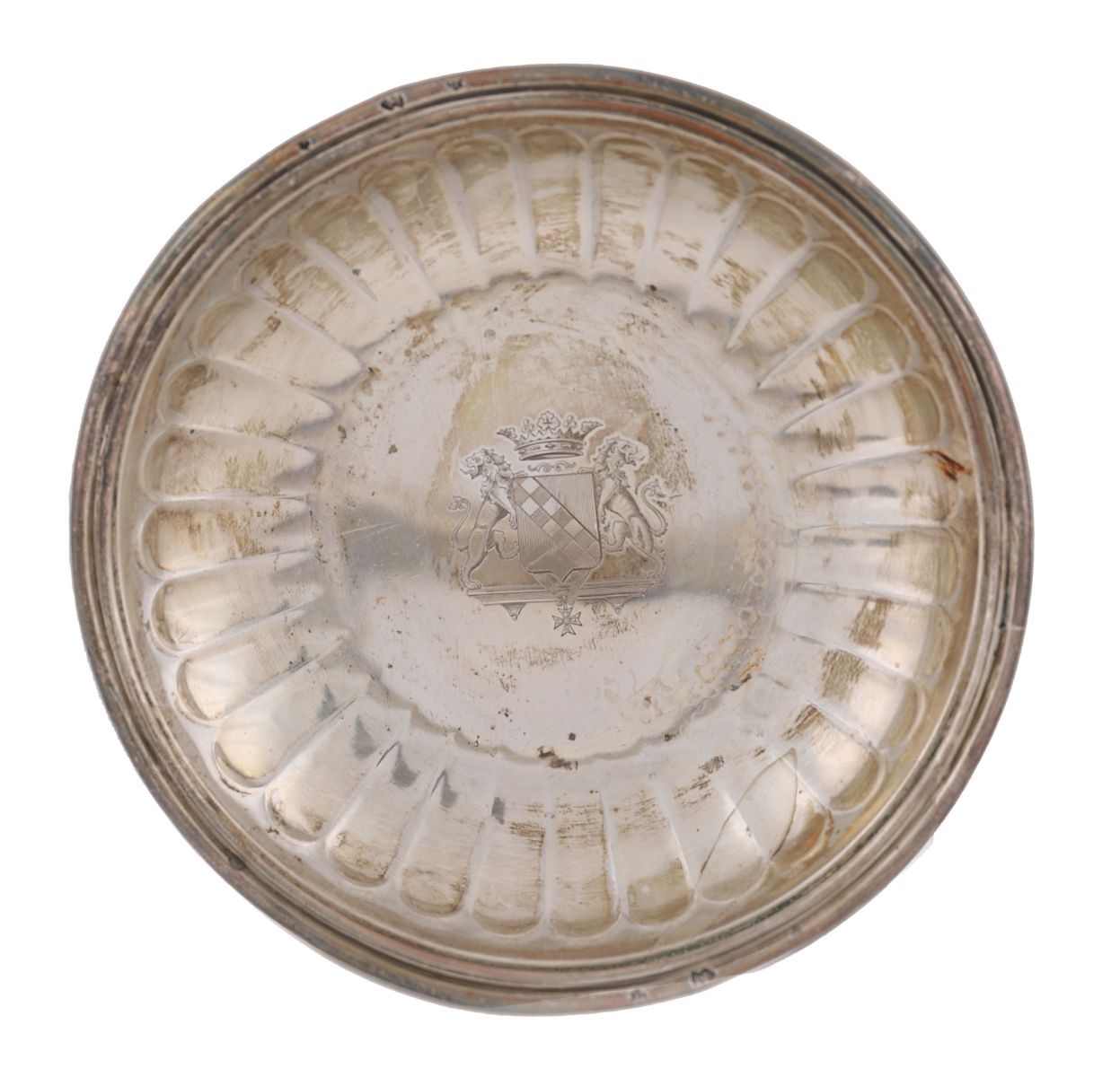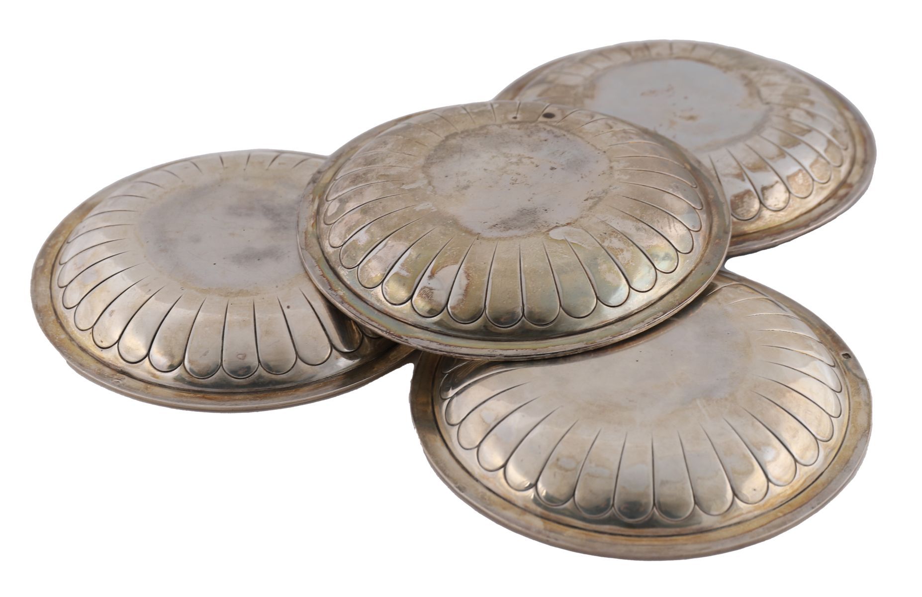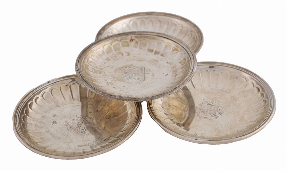 Four shallow circular silver dishes, 2 engraved with the armorial crest associated with Château Chalain, Franche-Comté. Total weight 521 grams.