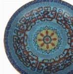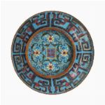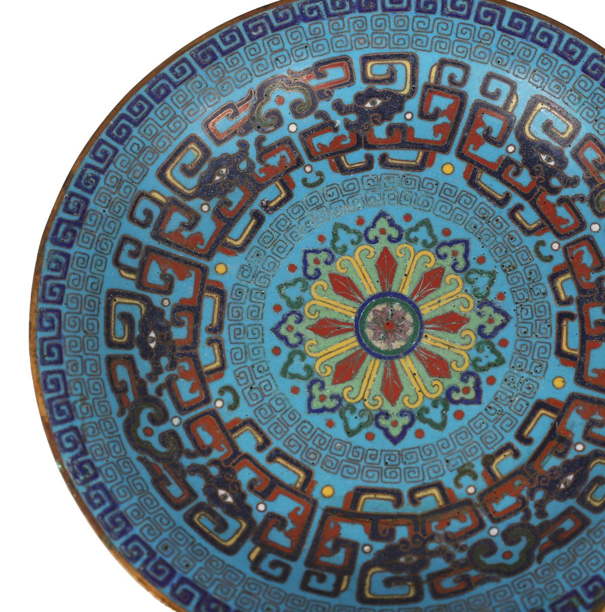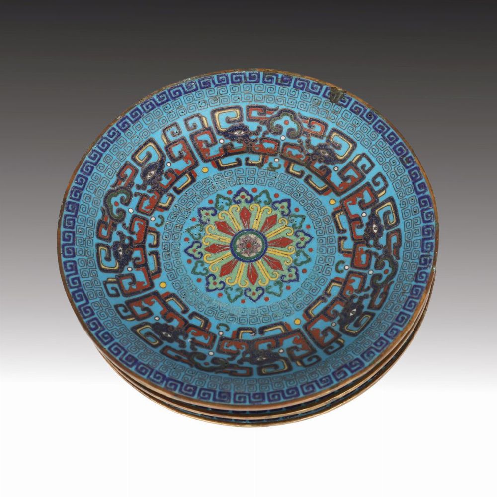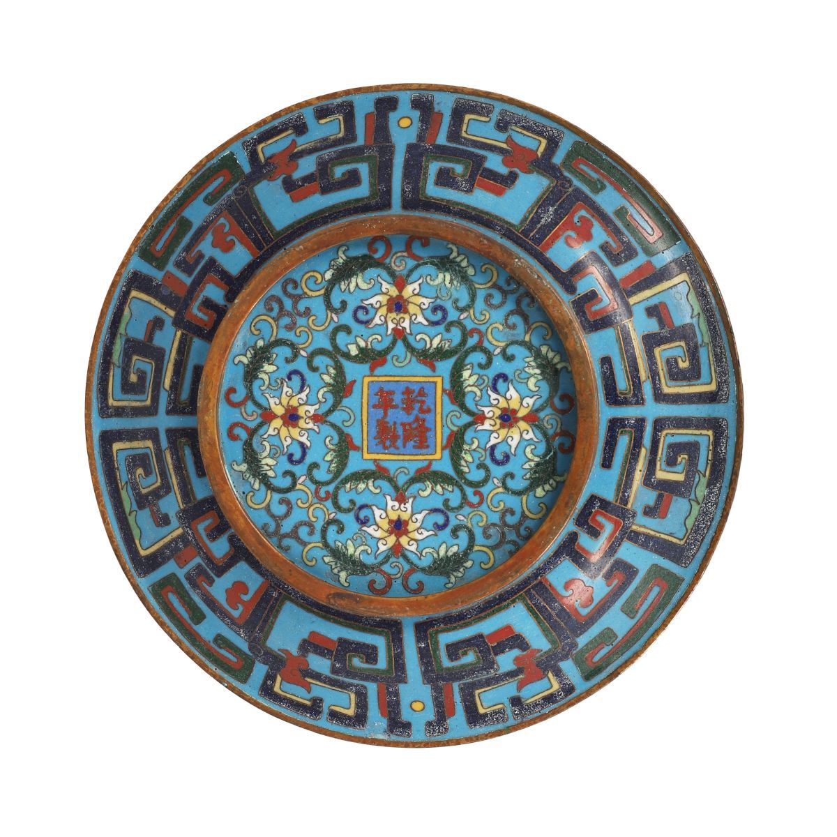 Finely decorated Chinese cloisonné enamel dishes, the interior centred by a lotus medallion within bands of stylised fretwork and scroll motifs on a turquoise ground. The reverse with similar fret border and central four-character Qianlong mark within a cartouche. The enamels are executed in vibrant tones of blue, red, yellow, green, and white, the copper cloisons neatly delineated.