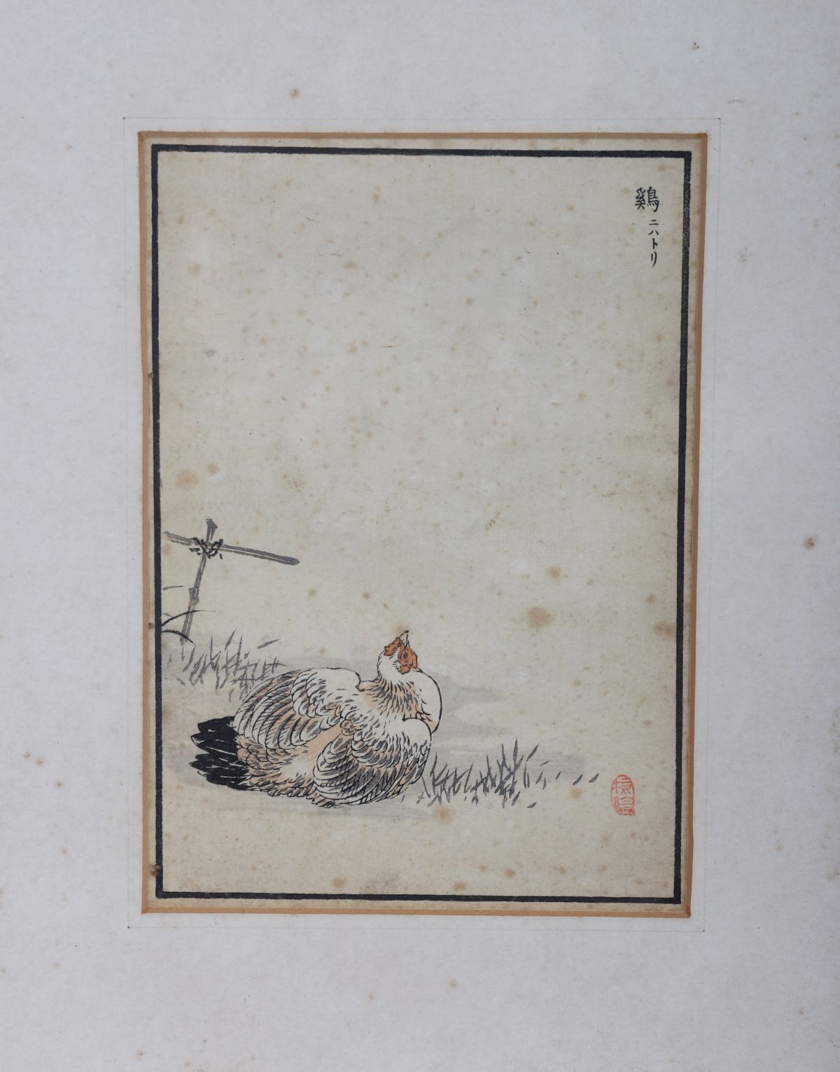 A set of four Japanese woodblock prints depicting various birds, each titled in Japanese at the upper right margin: Niwatori (Hen), Kanariya (Canary), Yama-uguisu (Warbler), and Shigi (Snipe). Each enclosed within a double-ruled border and bearing a small red artist seal lower left. Presented in uniform mounts and narrow black frames.