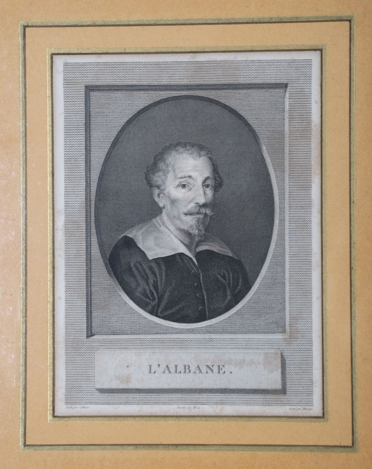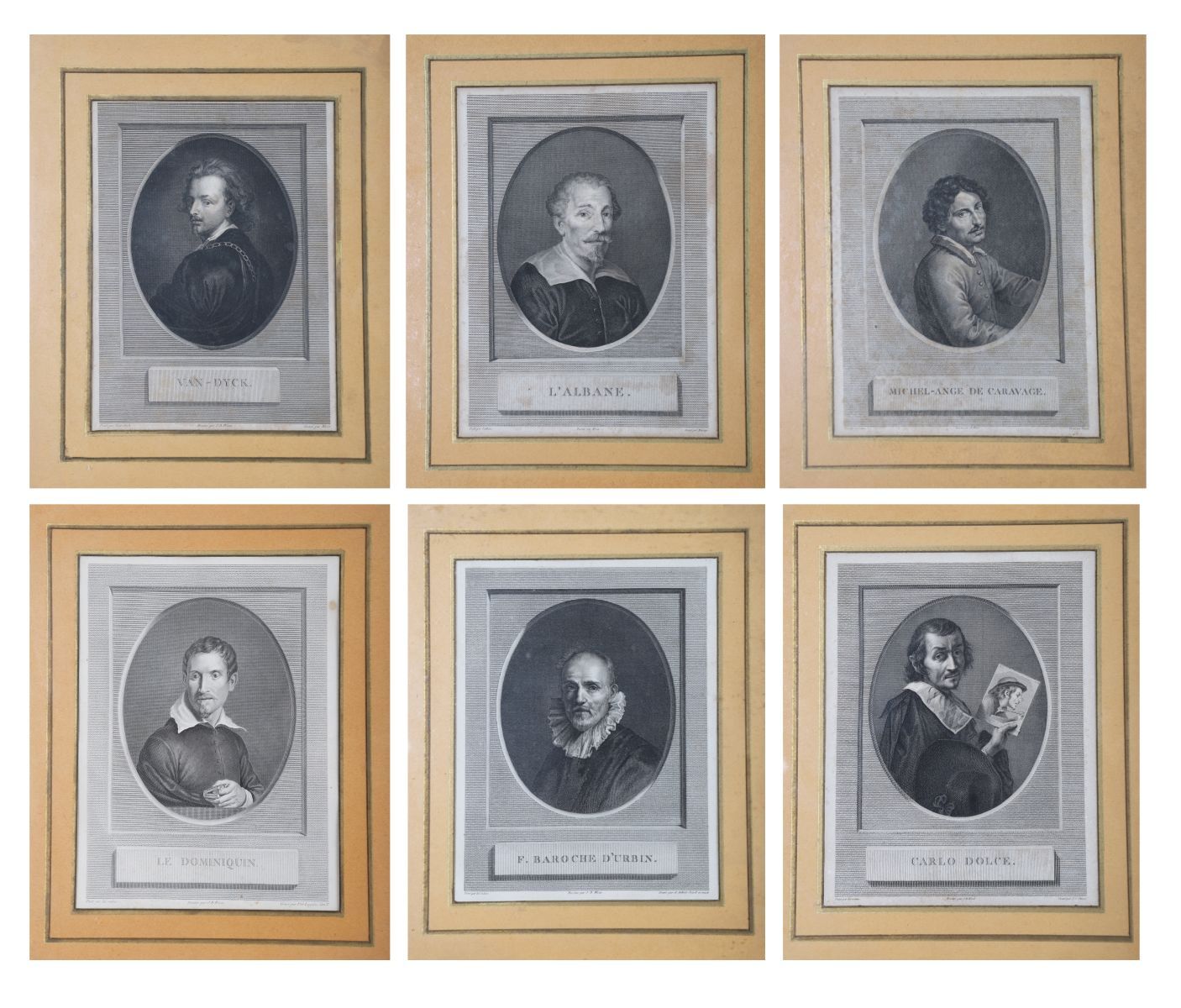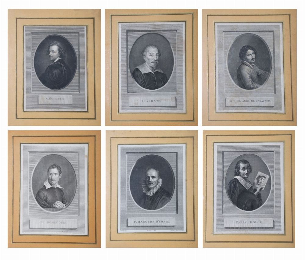 A fine set of six 18th-century engraved portrait prints after the Old Masters, depicting Anthony van Dyck, Francesco Albani (L’Albane), Carlo Dolci, Federico Barocci d’Urbino, Michelangelo da Caravaggio (Michel-Ange de Caravage), and Le Dominiquin (Domenichino). Each finely engraved within an oval cartouche and titled beneath, presented in uniform gilt-moulded frames with double mounts.