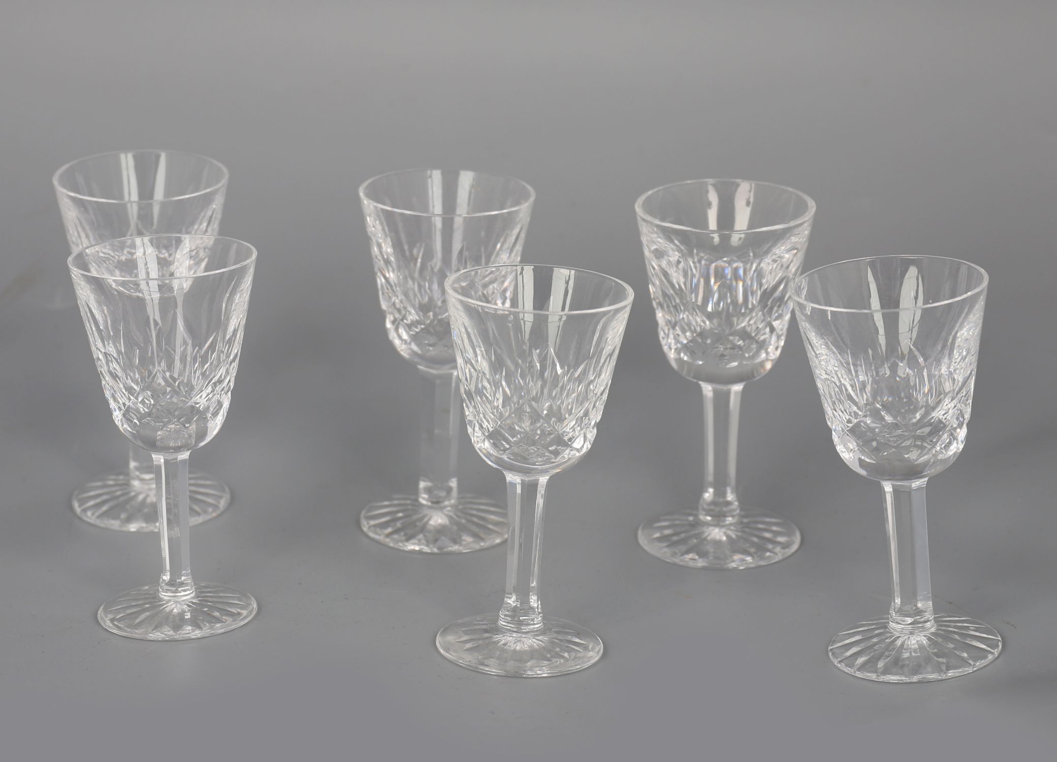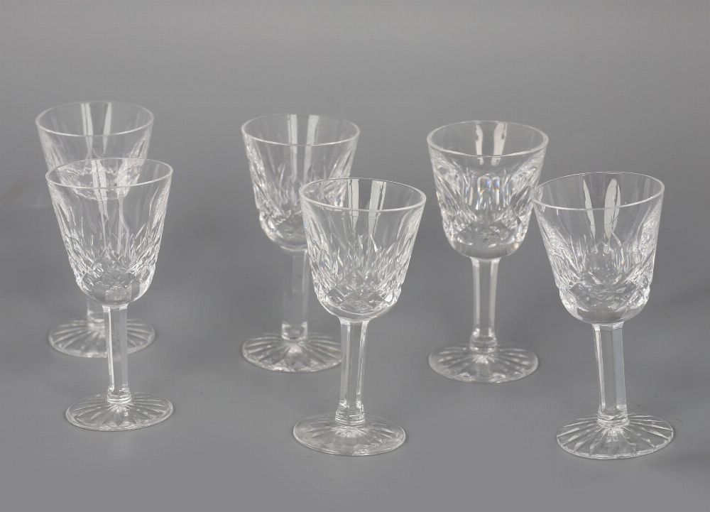 A fine set of six Waterford crystal liqueur glasses, each with cut decoration to the bowl and star-cut foot, raised on slender stems.