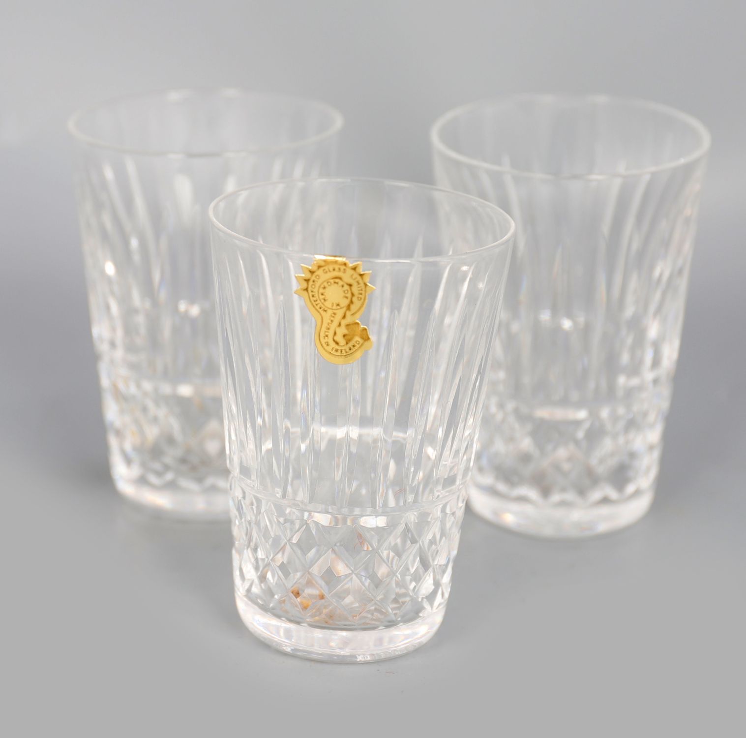 A set of six Waterford crystal tumblers, each with cut fluted decoration to the upper body above a diamond-cut lower section, retaining original Waterford seahorse paper labels.
